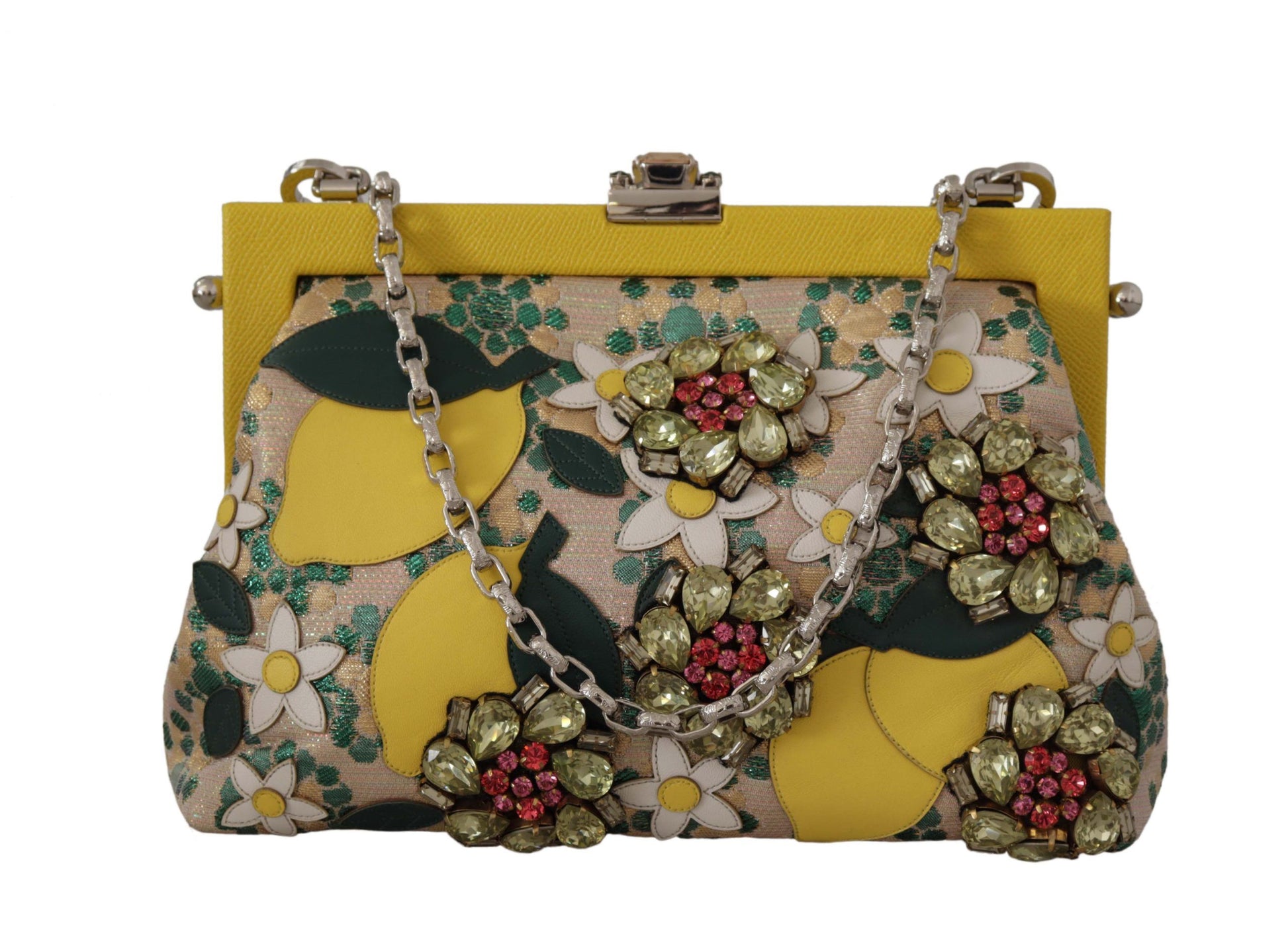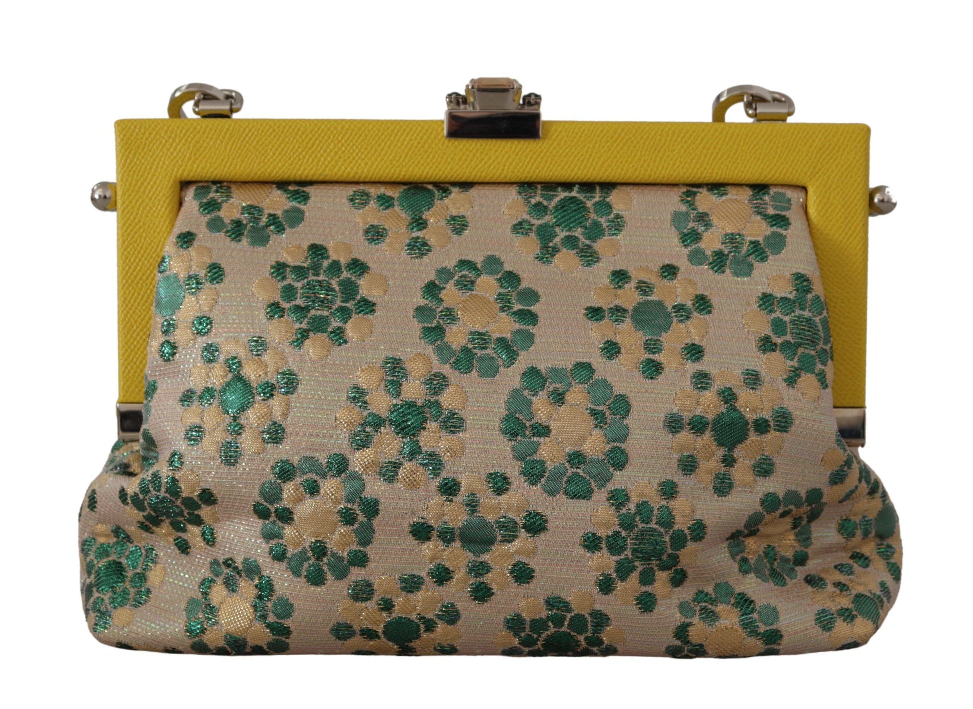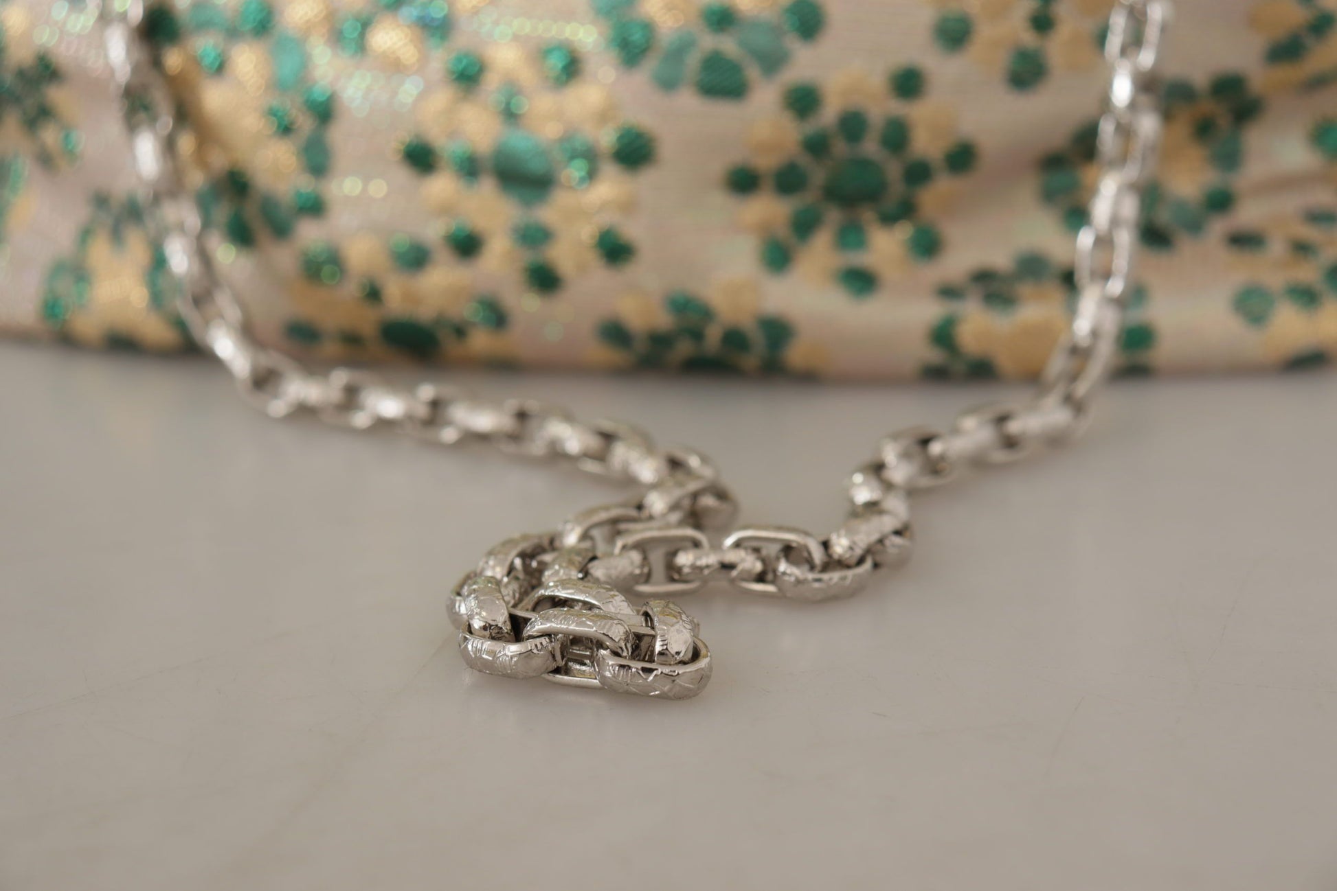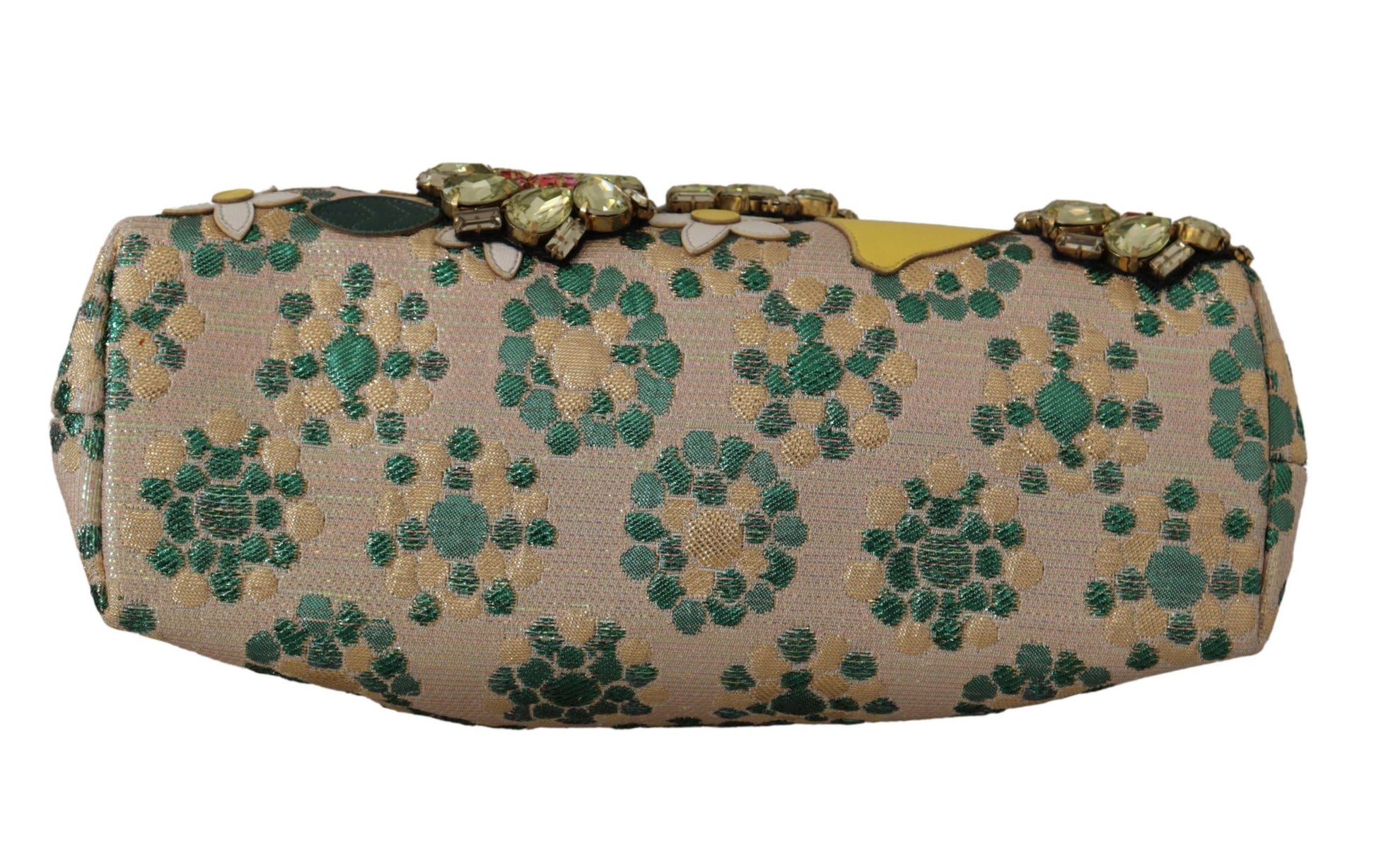 Indulge in the exquisite craftsmanship of this Dolce & Gabbana evening bag. An ideal accessory for high-profile events and elegant parties, this clutch is designed to turn heads with its vibrant multicolor palette and sparkling silver metal details. The luxurious blend of materials culminates in a stunning display of crystal floral embellishments, radiating sophistication with every detail. A detachable shoulder chain provides versatility, while the green silk lining adds a touch of opulence from the inside out. This Italian-made masterpiece is as practical as it is beautiful, keeping your essentials secure with its generous dimensions.