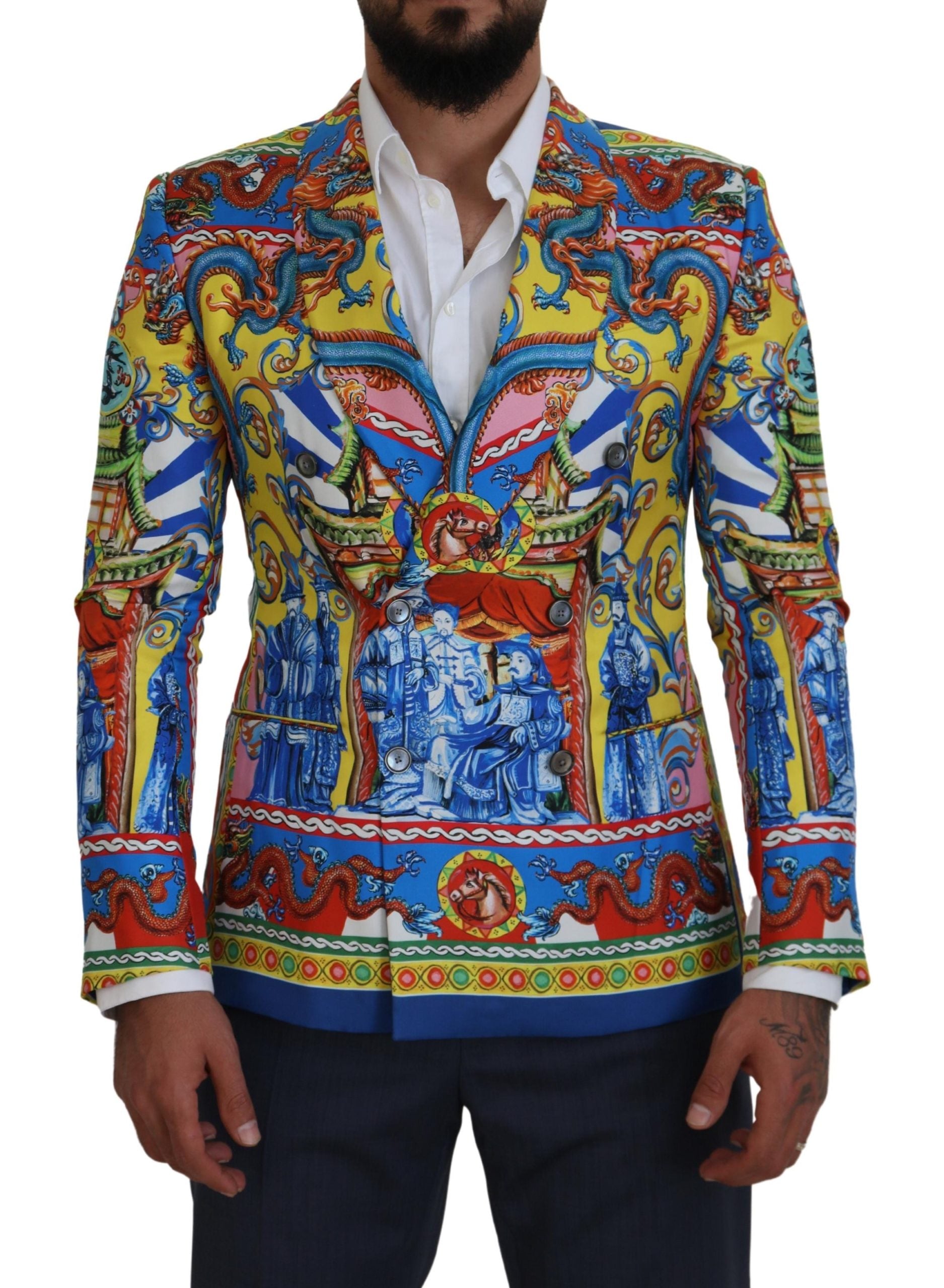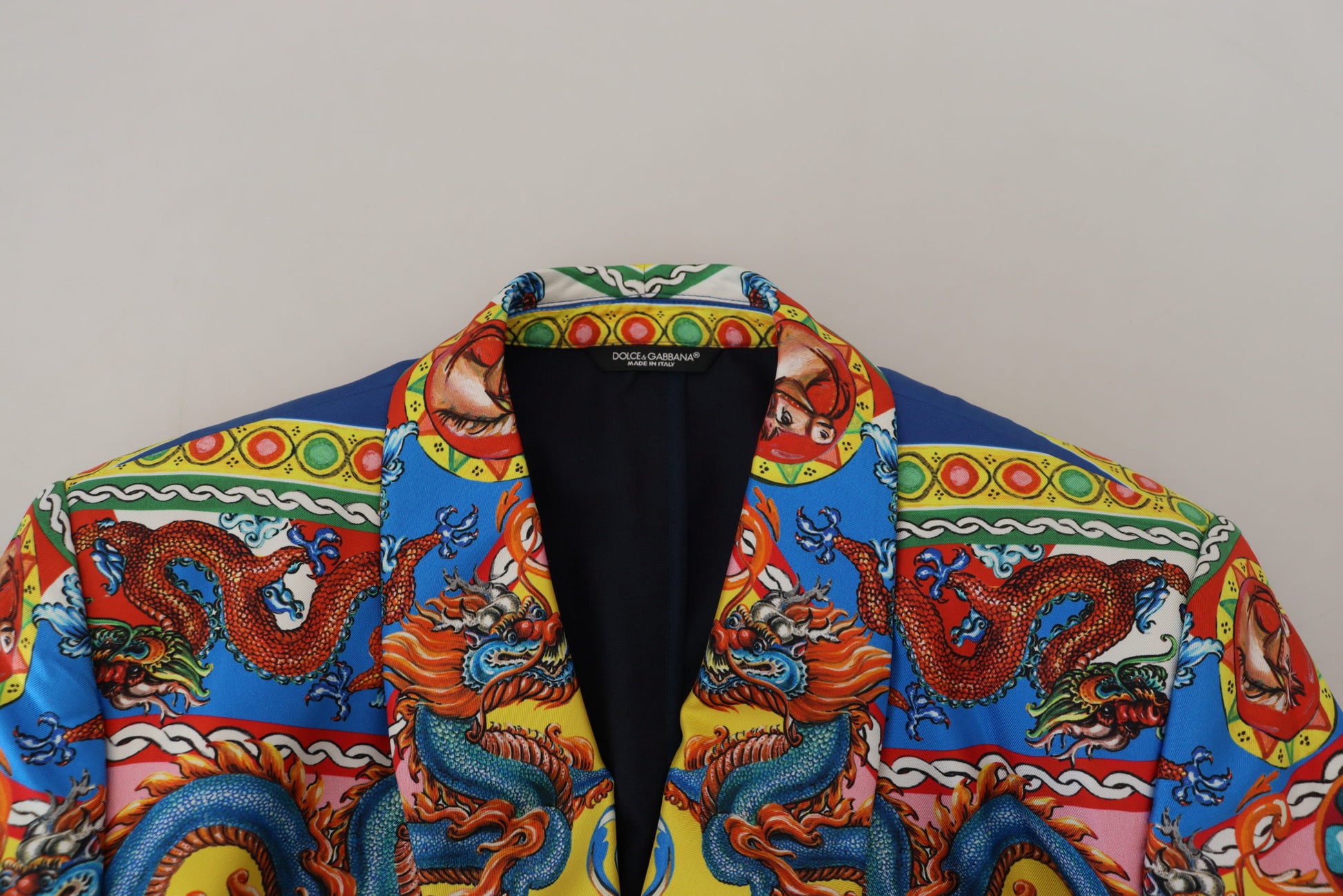 Exude sophistication with this absolutely stunning double-breasted blazer from Dolce & Gabbana. Adorned with a vibrant multicolor Dragon print, this piece is not just a blazer, it’s a statement. Crafted in Italy, its luxurious 100% silk fabric promises a smooth touch and an unmistakable sheen, while the unique design is sure to turn heads and elevate any outfit. A perfect blend of bold fashion and classic styling, this blazer is an essential addition to your wardrobe.