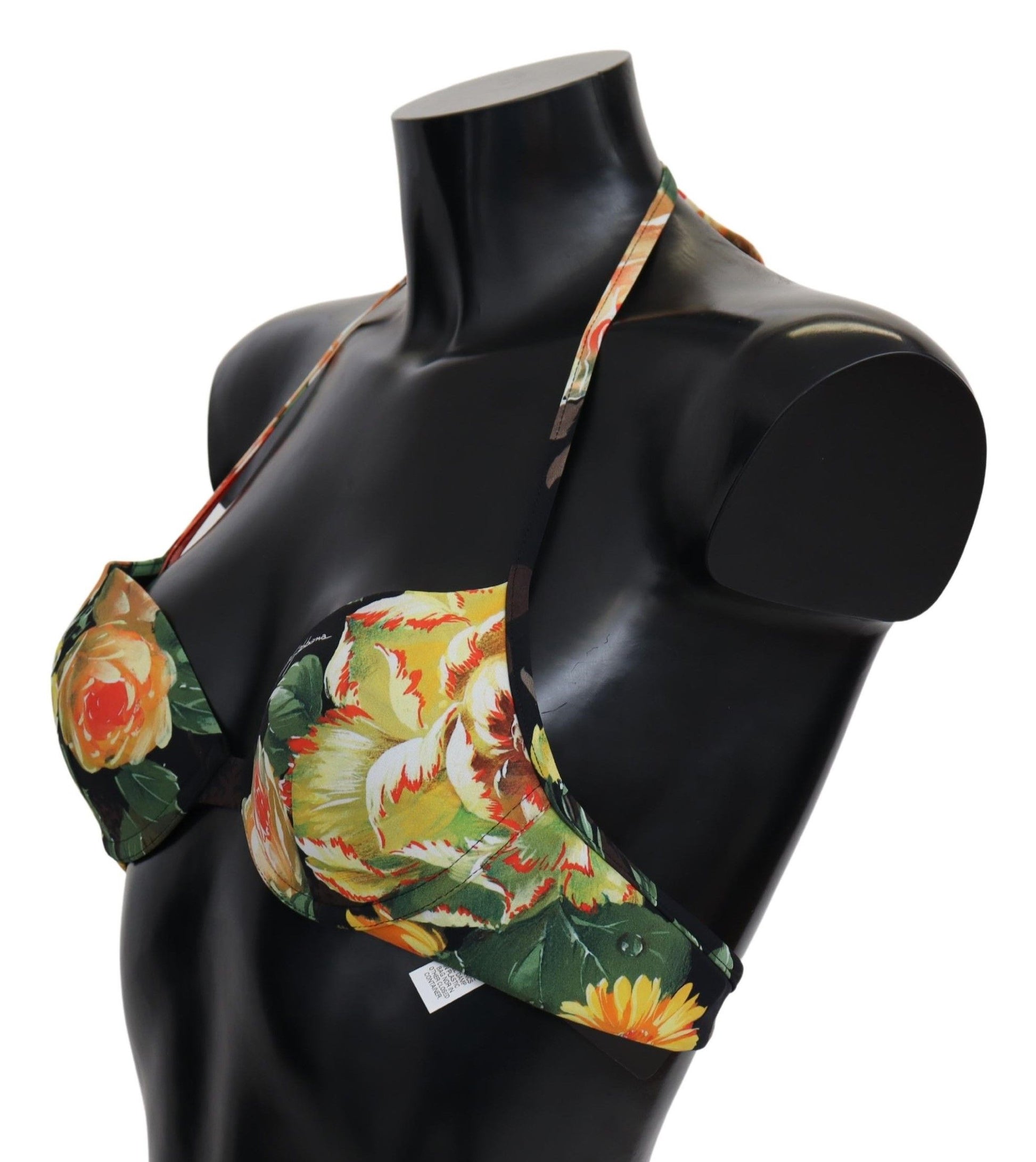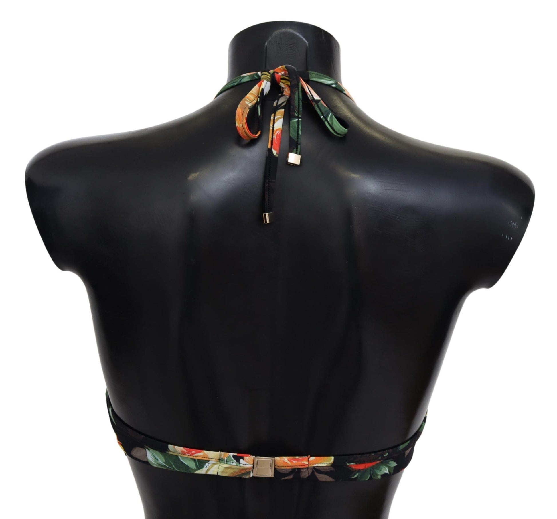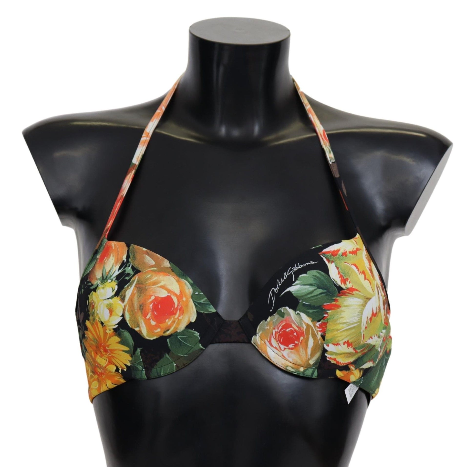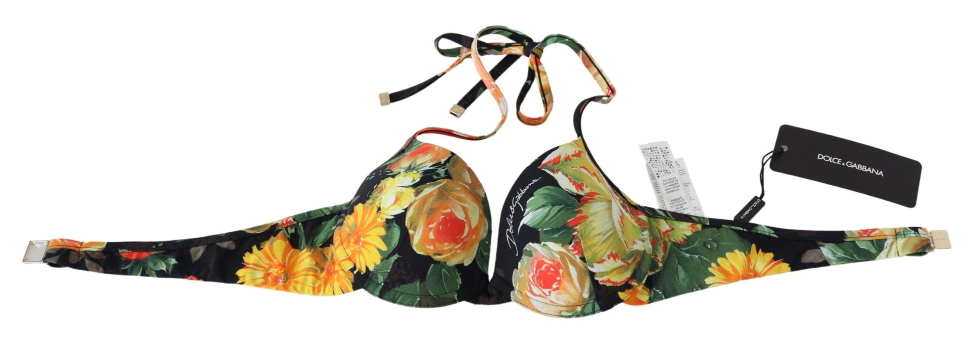 Embrace the sun with this stunning Dolce & Gabbana floral print bikini top, perfect for adding a touch of Italian luxury to your beachwear ensemble. Crafted with a blend of high-quality nylon and elastane, this top ensures a comfortable and flattering fit. Complete with a chic logo-embossed closure and a tie-fastening neck, you’re guaranteed to make a statement at the beach or by the pool.