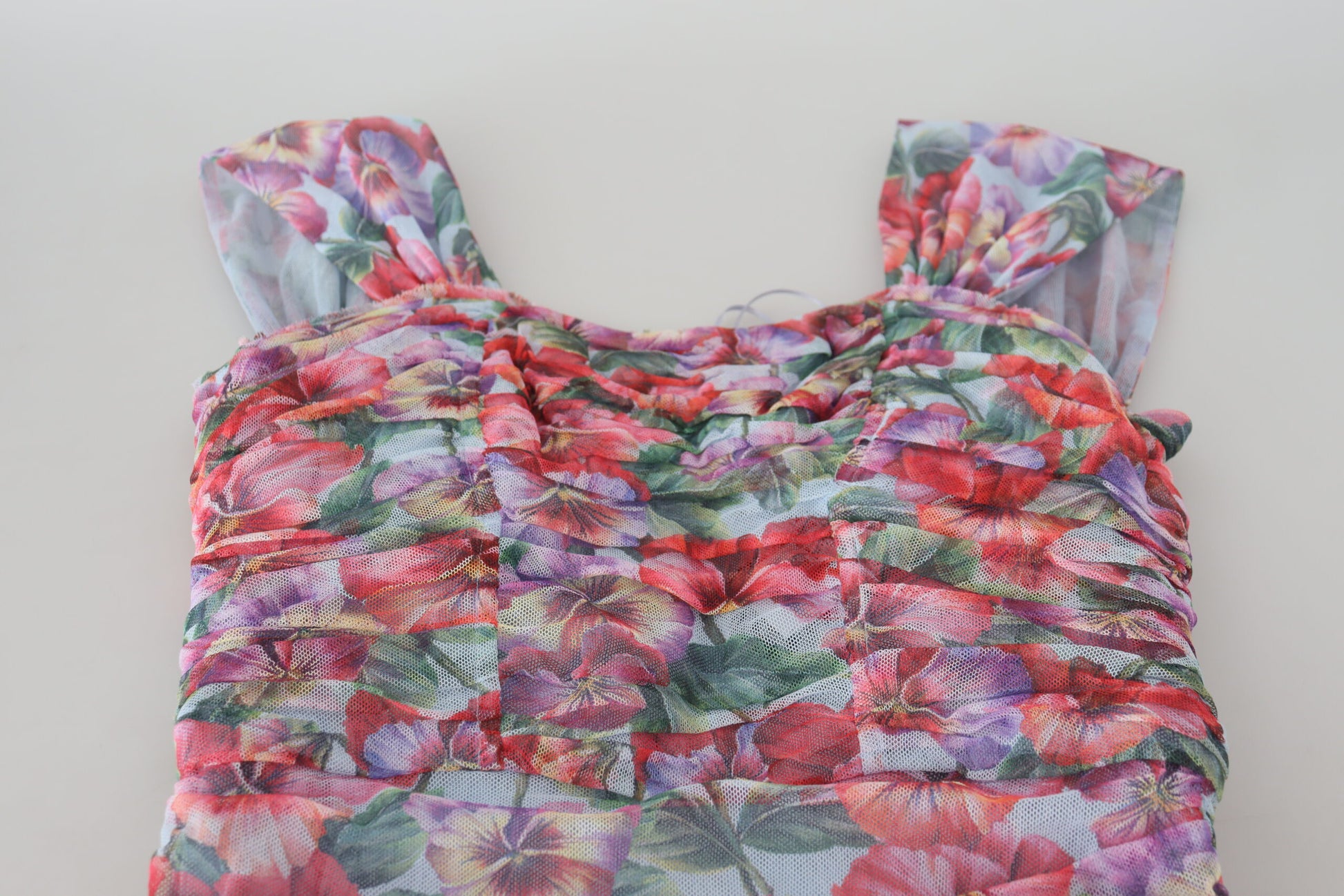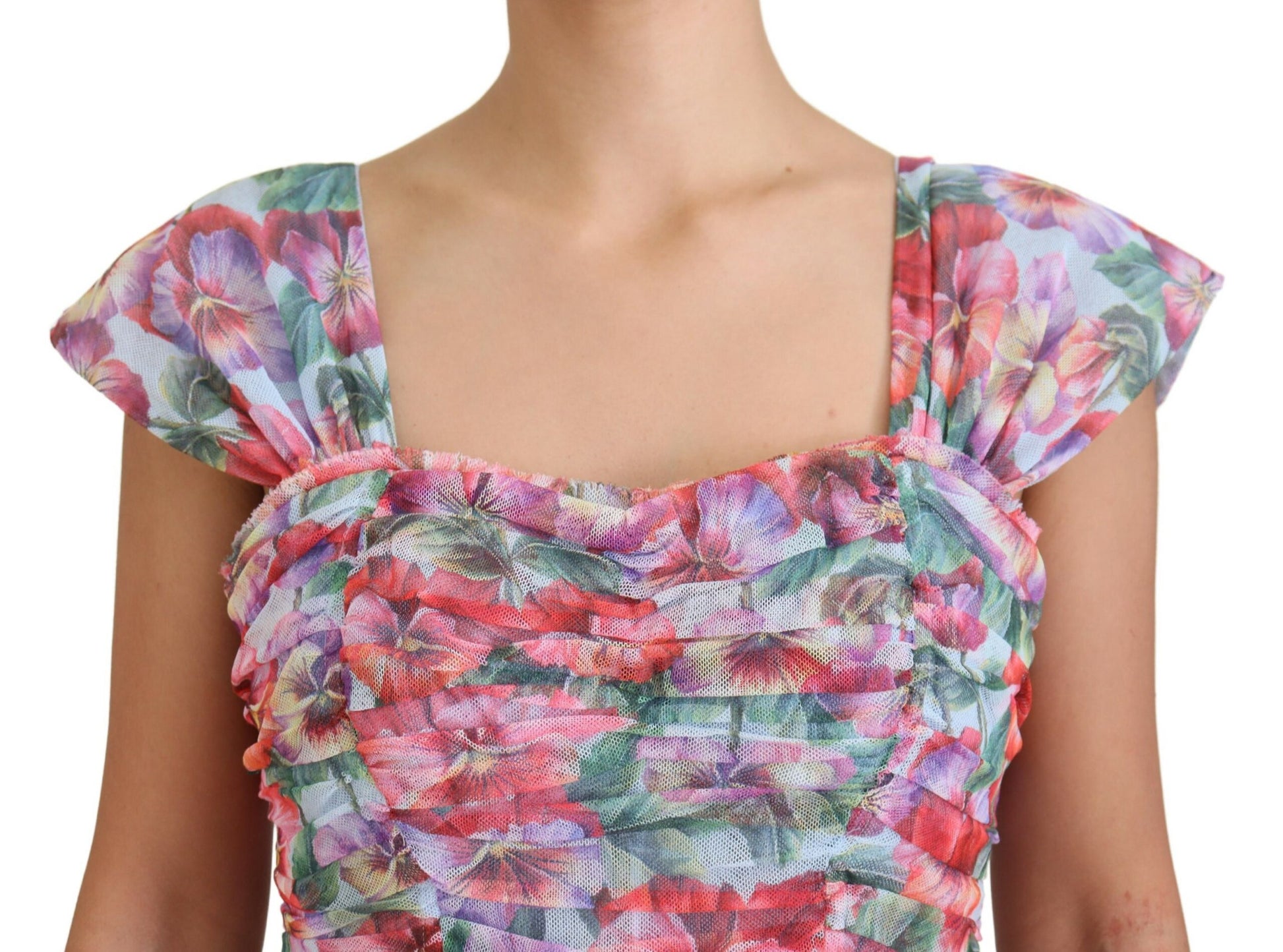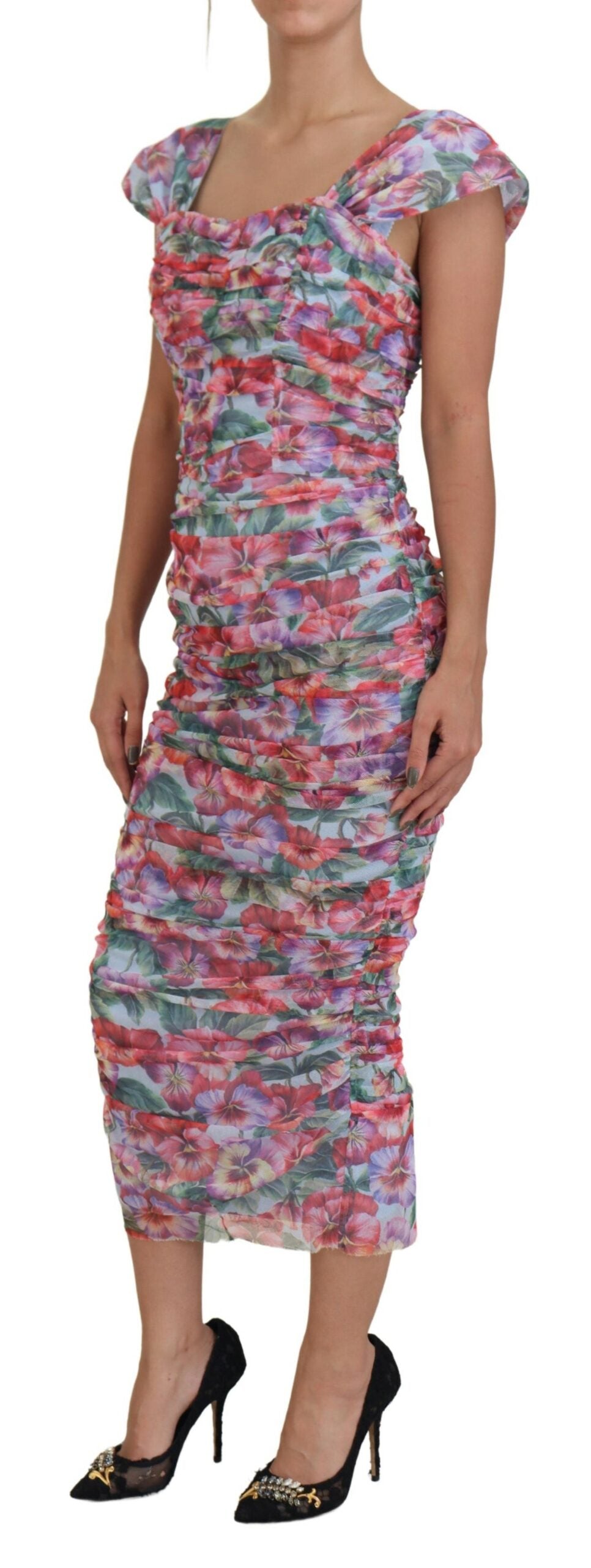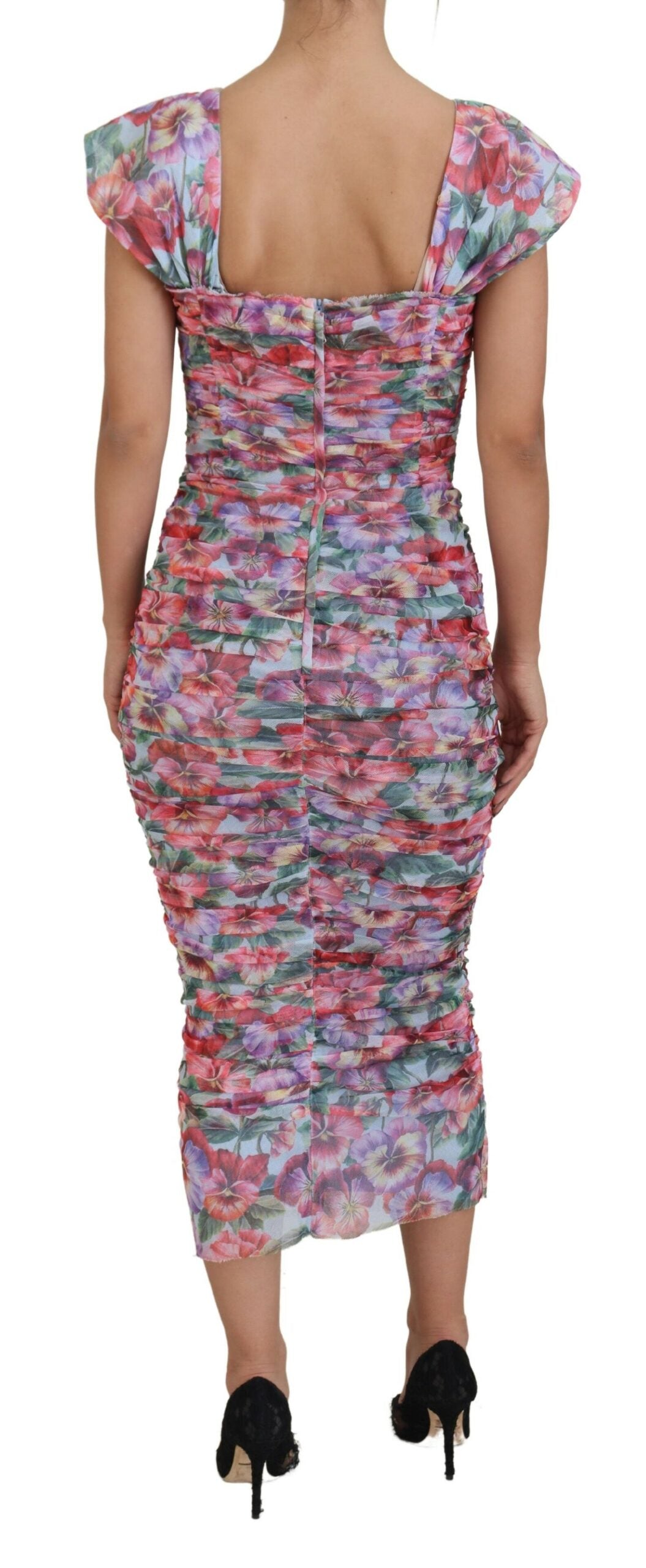 Embrace the essence of spring with this stunning Dolce & Gabbana midi sheath dress. A testament to exceptional Italian craftsmanship, this dress features a vivid, multicolored floral print set against delicate cotton tulle. A square neckline and boned bodice provide structure and style, while the concealed zip back closure ensures a seamless silhouette. Lined with a luxurious blend of silk stretch, this dress promises comfort and elegance for any high-end occasion.