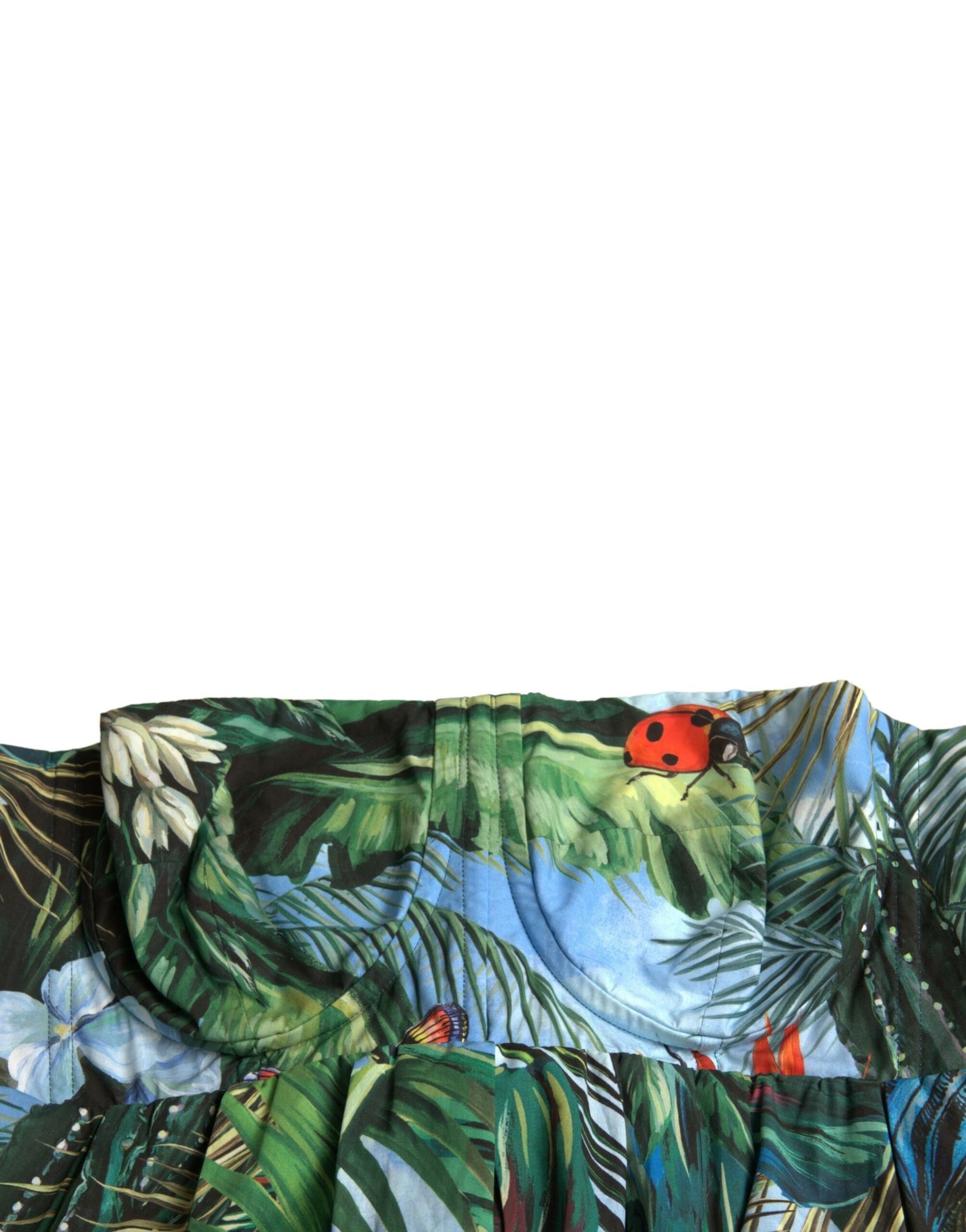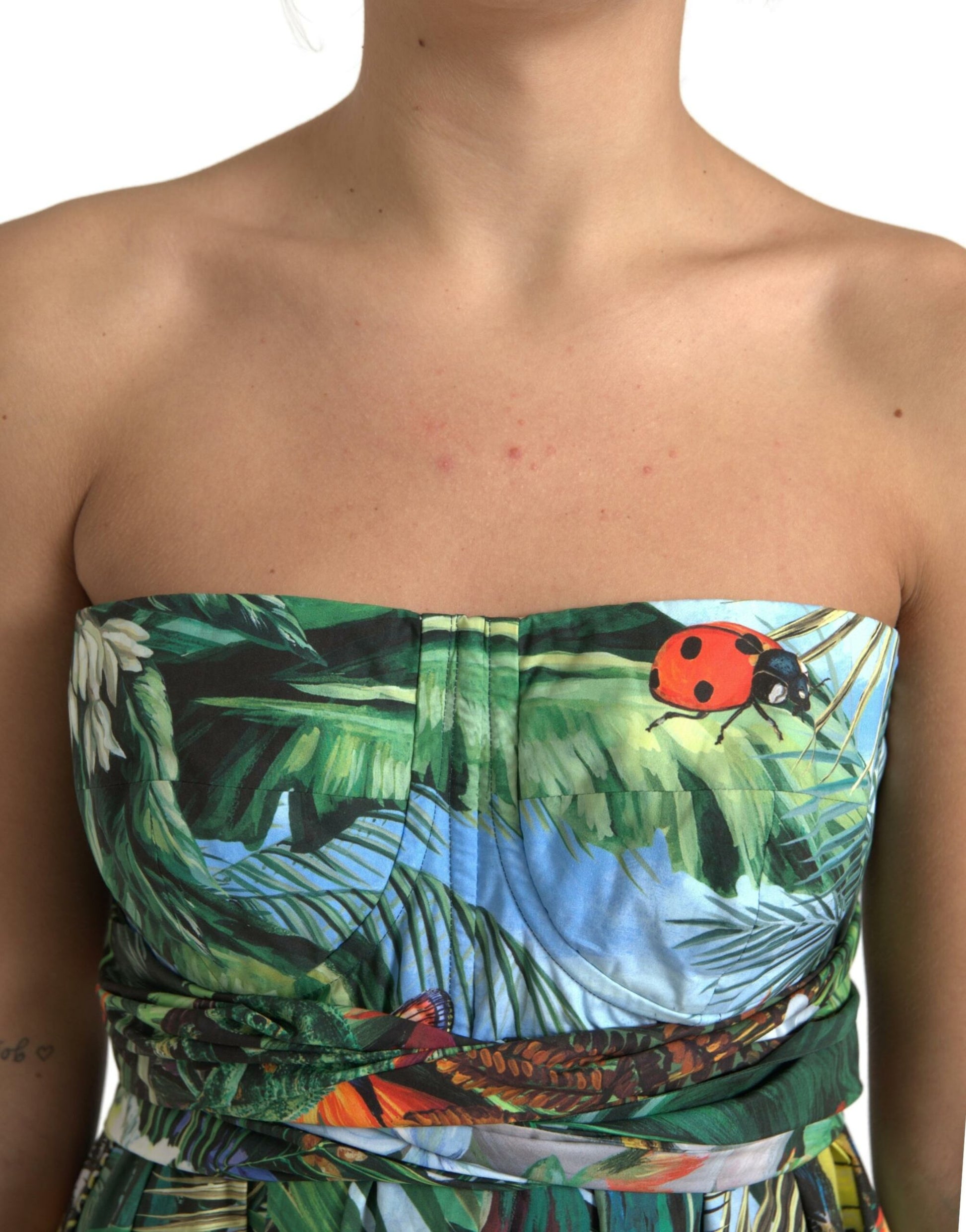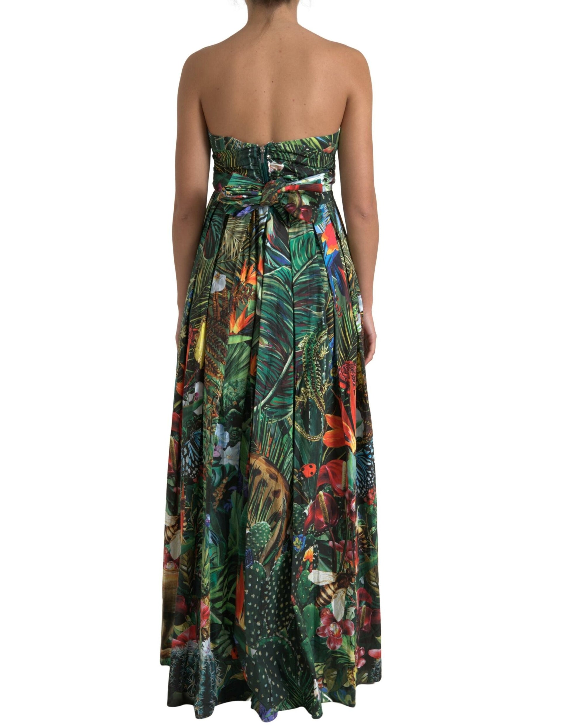 Elevate your eveningwear with this exquisite Dolce & Gabbana strapless gown. Tapping into the heart of haute couture, this stunning piece showcases a vibrant jungle print adorning the A-line silhouette, creating a striking visual feast. A perfect blend of elegance and whimsy, the dress features a secure back zip and tie fastening, refined with pleated details that cascade into a sweeping long length, ensuring a dramatic entrance at any upscale event. Crafted from pure cotton, both inside and out, comfort and luxury go hand-in-hand, inviting you to experience both style and ease in one exceptional garment, meticulously made in Italy.