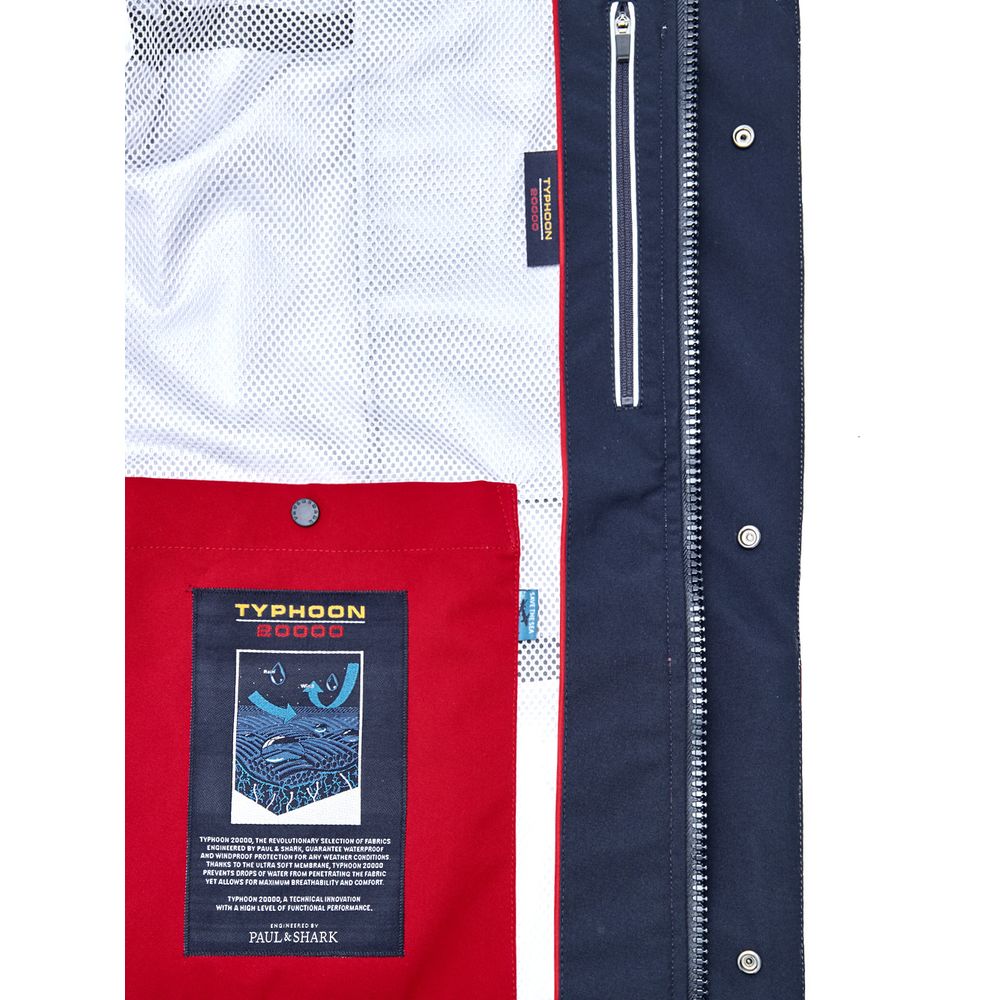 Paul & Shark Trust Typhoon Shark Color Block Jacket. Front zip and covered snap closure, contrasting logo embossed on the front. Two large front pockets with flaps, an inside pocket, and an adjustable and removable hood inside the collar. Mesh lining and contrasting print on the back. Water-repellent technical fabric in three contrasting colors.