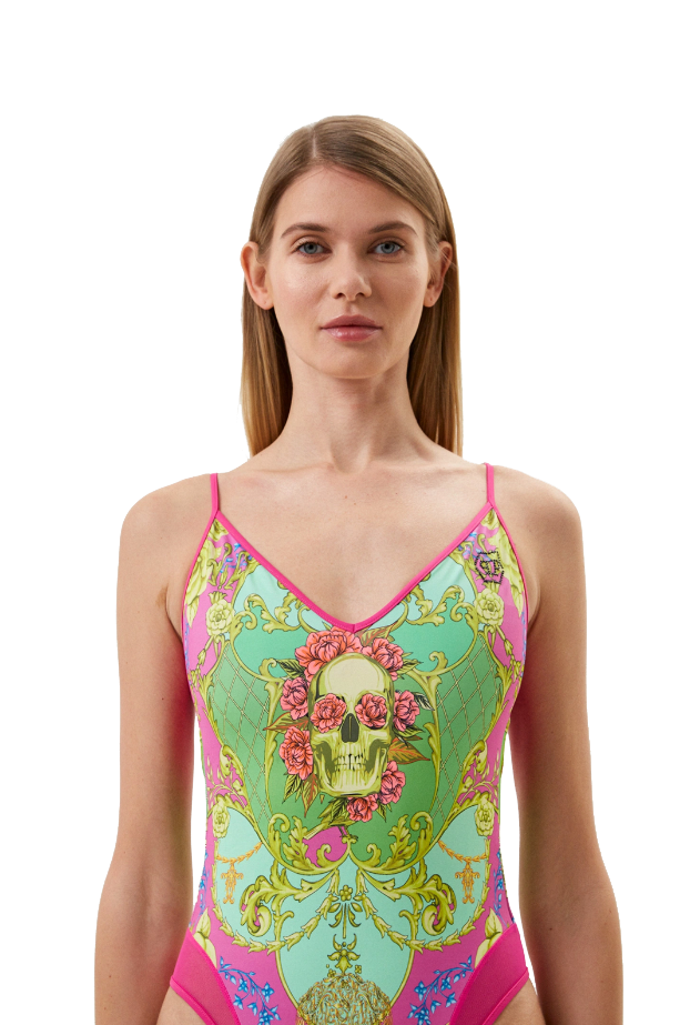 Make a splash with this eye-catching designer one-piece swimsuit, perfect for the fashion-forward woman. Its vibrant multicolored abstract print is sure to turn heads, while the flattering V-neck cut accentuates your silhouette. Adorned with a bejeweled logo for an added touch of luxury, this swimsuit is crafted from a high-quality blend of polyester and elastane, ensuring both comfort and durability. Ideal for lounging at the most exclusive beaches or sipping cocktails by the pool.