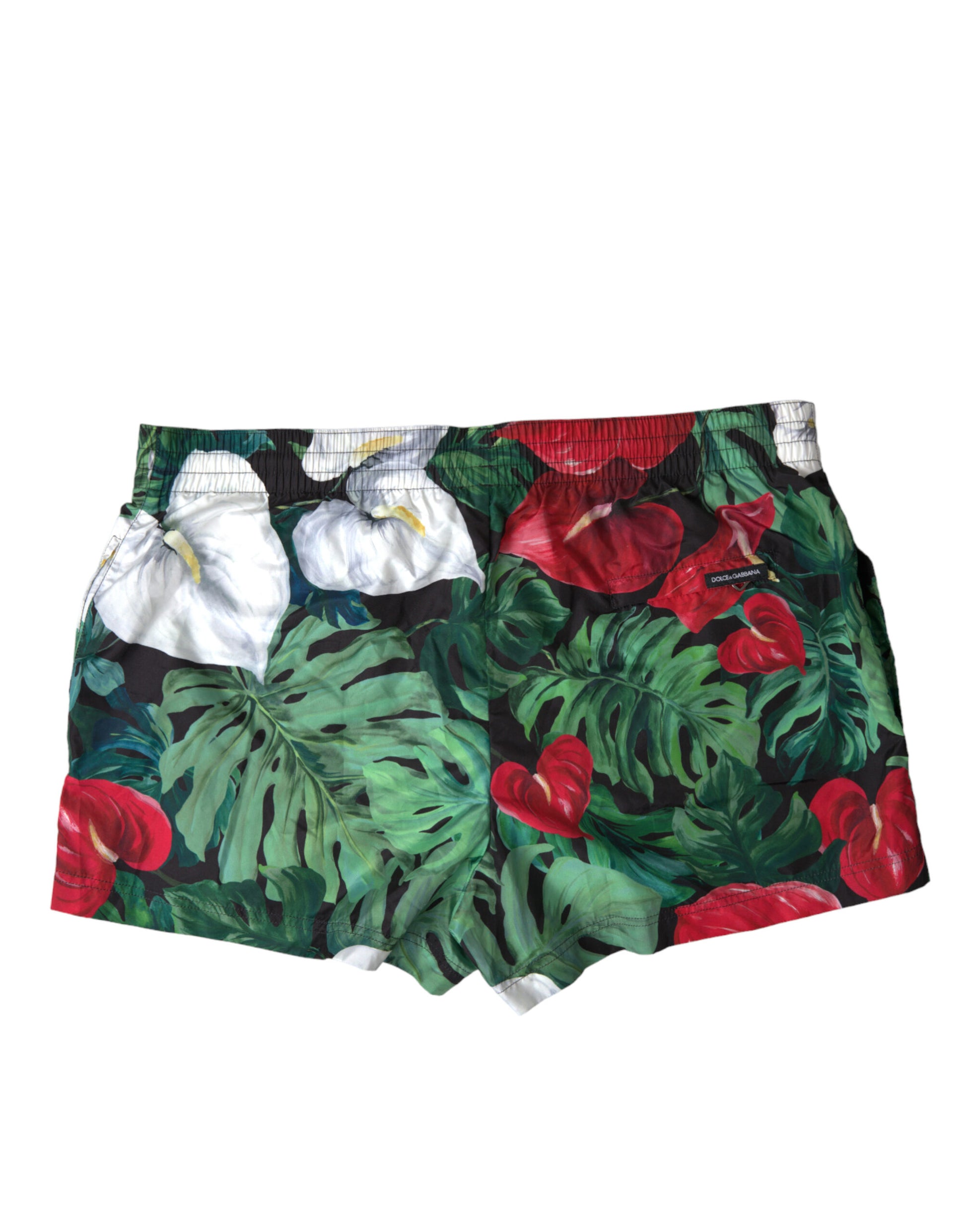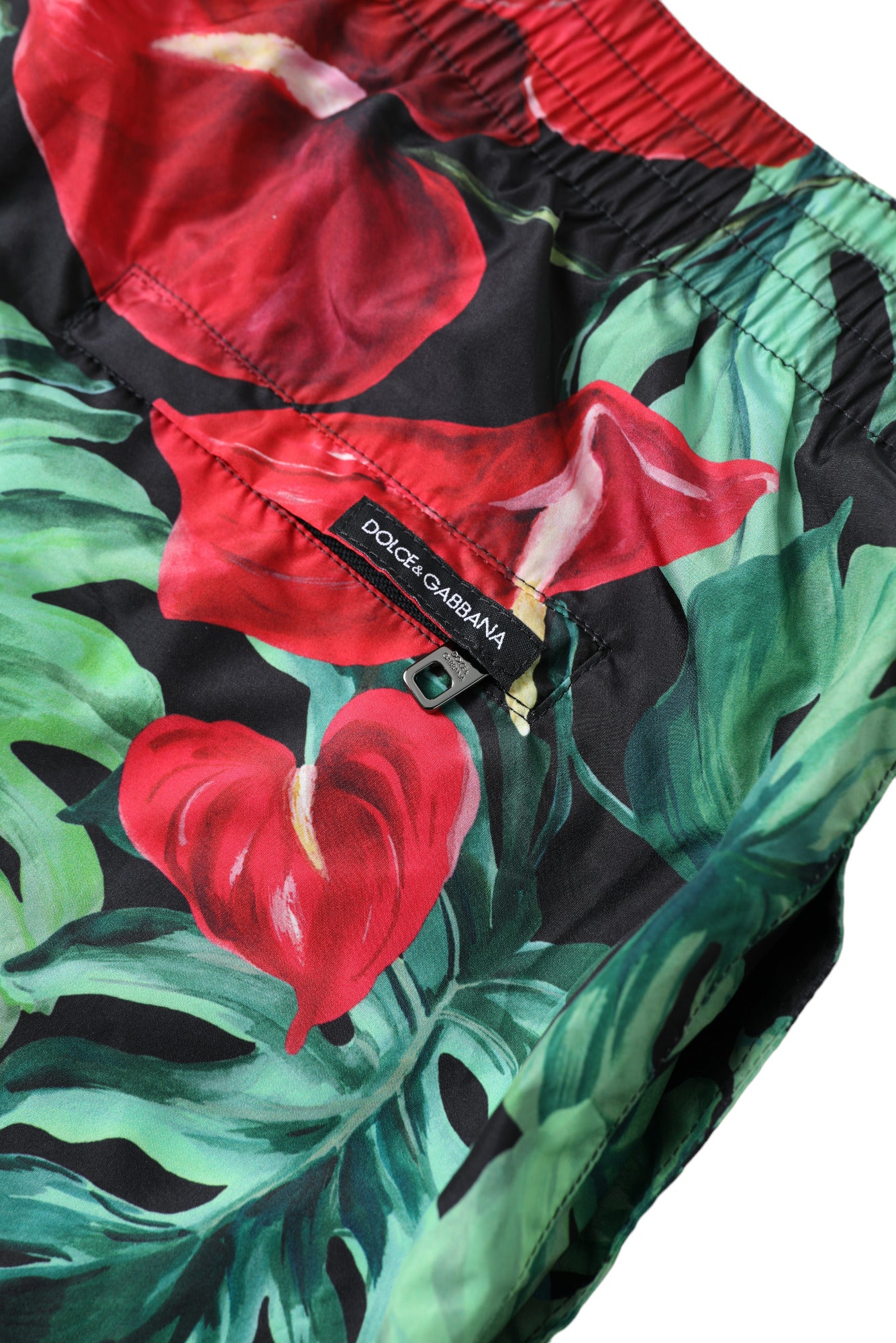 Indulge in the essence of summer with these stunning, 100% Authentic Dolce & Gabbana swimming trunks, brand new with tags. Adorned with vibrant monstera leaves and anthurium flowers, these multicolored trunks are a true statement piece. Crafted for comfort and an adjustable fit, they feature a convenient back zip pocket and an elastic waist with a drawstring. Perfect for any beachwear occasion, they radiate luxury and style, synonymous with the Dolce & Gabbana brand. Made in Italy, they promise great fit and comfort with a splash of high-end fashion.