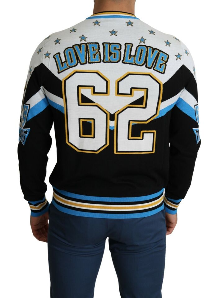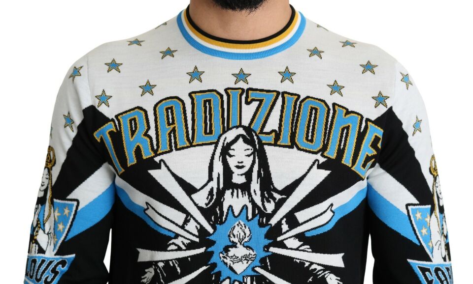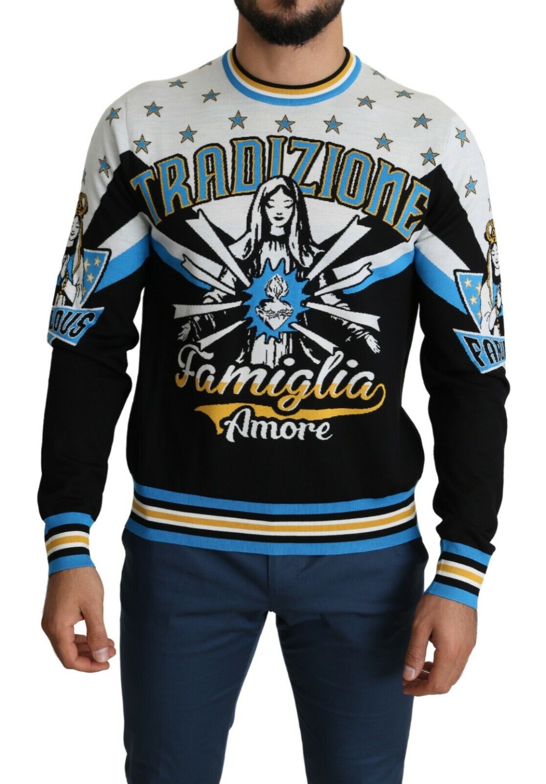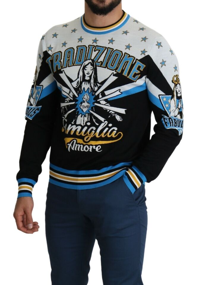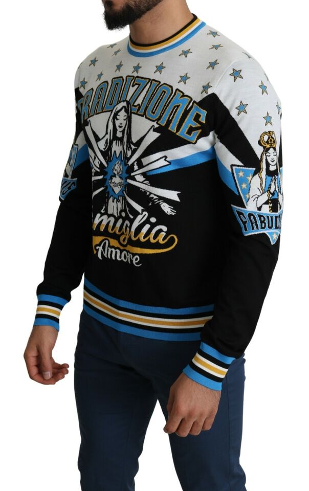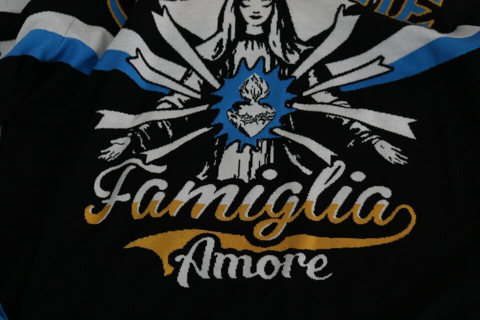 Indulge in Italian luxury with this striking Dolce & Gabbana sweatshirt, showcasing the warmth of the ‘tradizione famiglia amore’ pattern. A piece that combines comfort with high-end fashion, it is perfect for those who appreciate a bold, yet sophisticated style. With a striped ribbed neckline, along with matching cuffs and hem, this pullover sweater is a true representation of finesse.