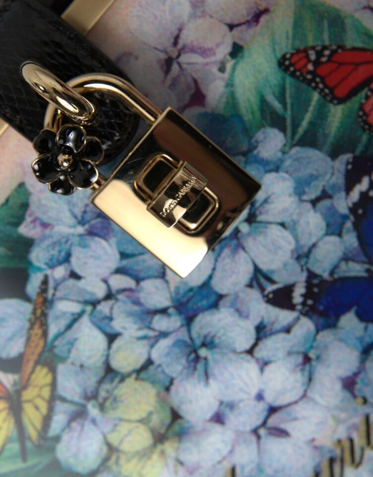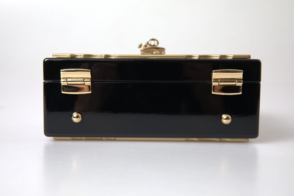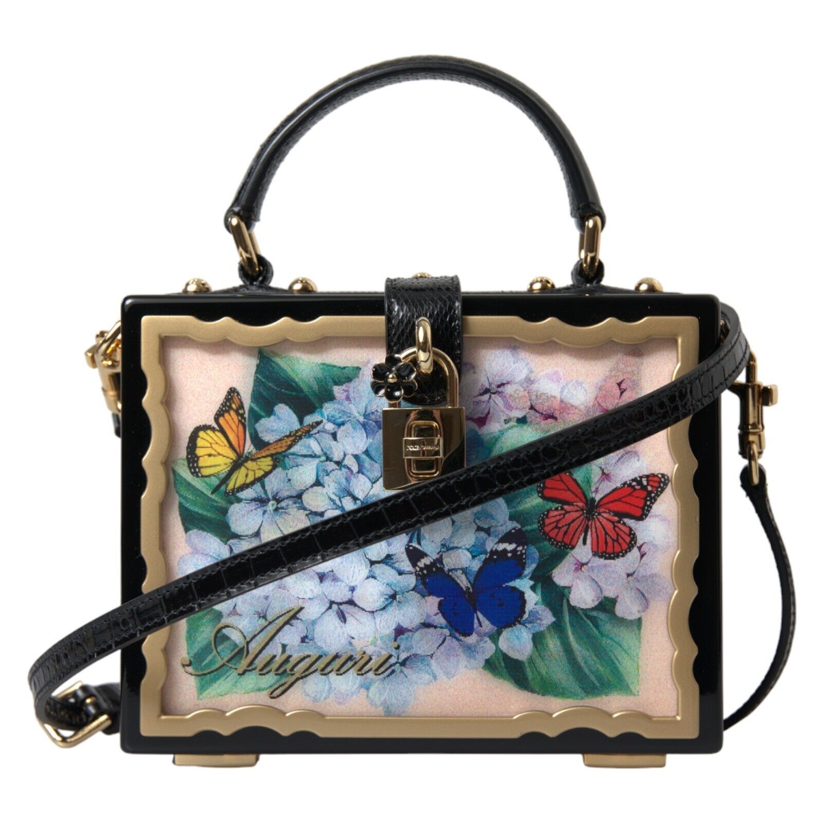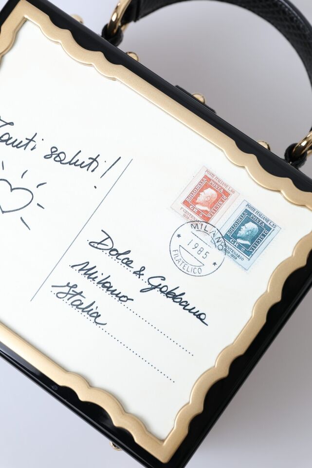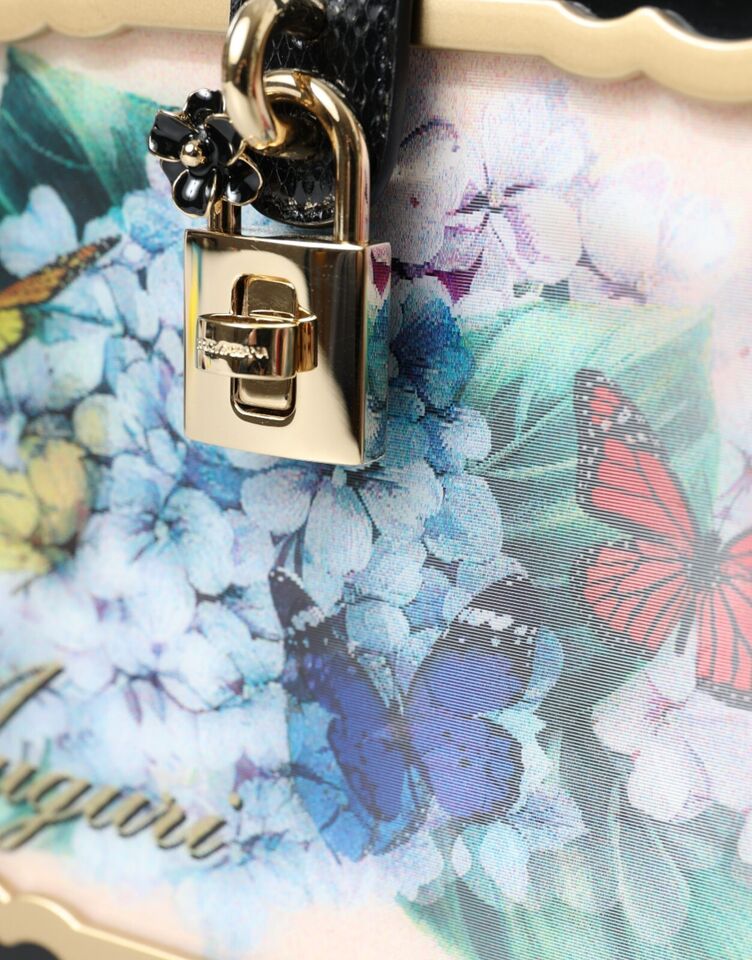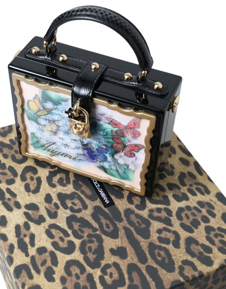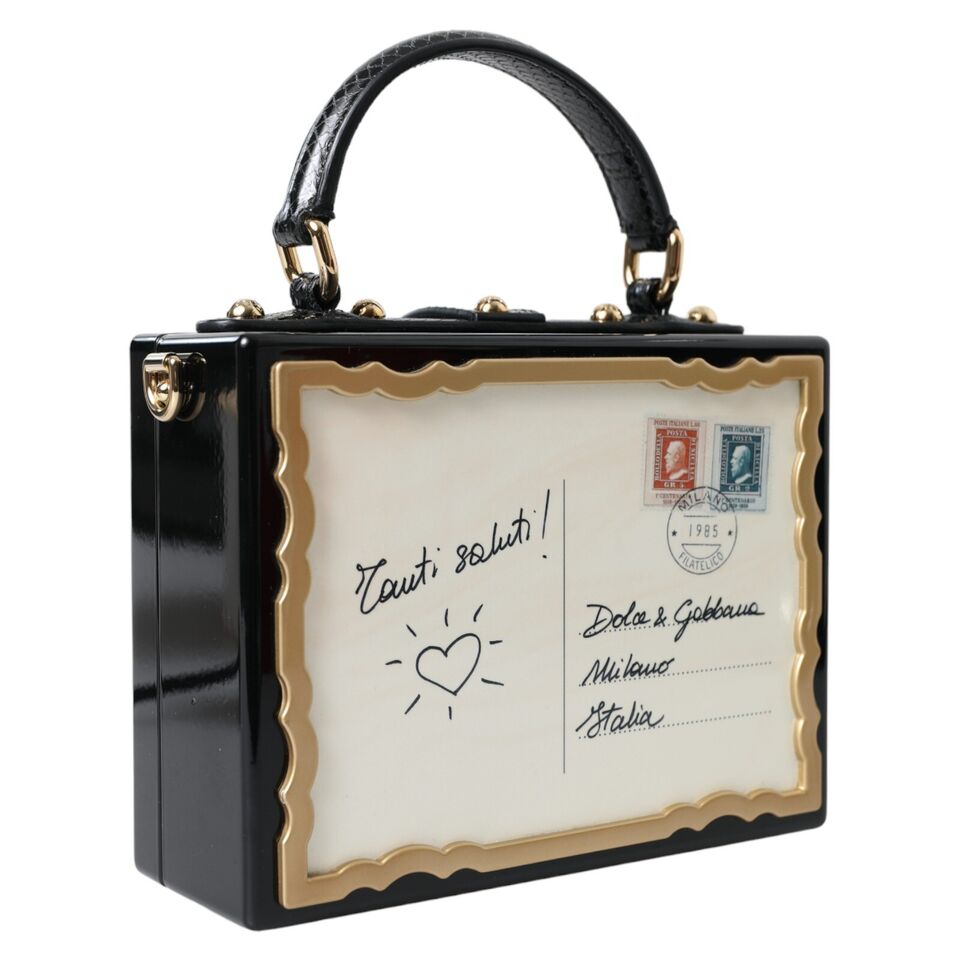 Indulge in the opulence of Italian design with this Dolce & Gabbana box bag. A symbol of high craftsmanship, this exquisite accessory is bound to turn heads with its striking floral and postcard prints. Crafted from a blend of wood and leather, this bag features a lustrous gold-tone turn-lock padlock adorned with a dainty daisy. It boasts a sophisticated black lining, snakeskin trims, and comes with a versatile top handle and shoulder strap, making it a perfect companion for both elevated daywear and enchanting evening outfits.
