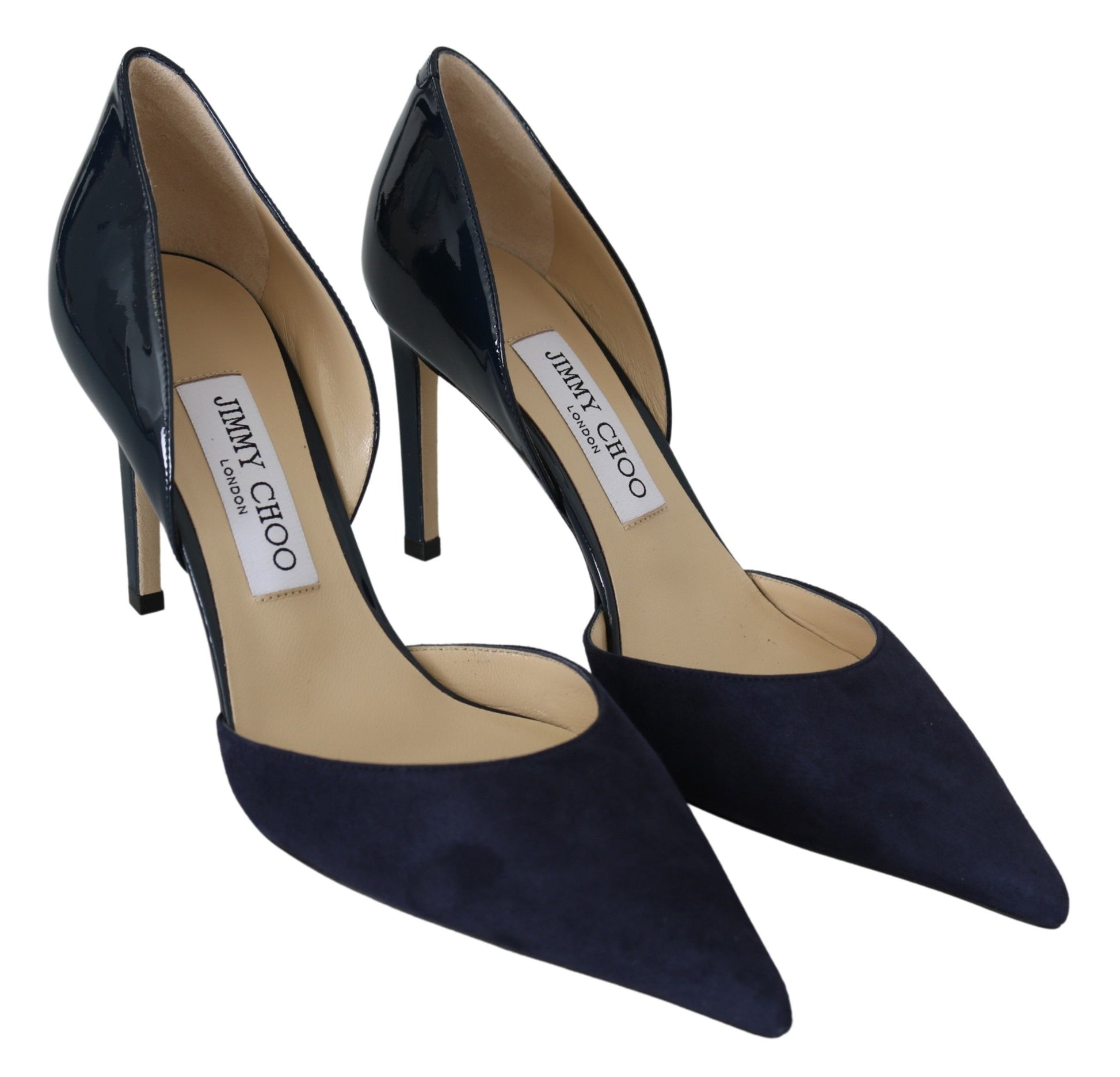 Step out in sophistication with these Gorgeous Jimmy Choo pumps, crafted for the fashion-savvy individual. Complete with tags, a dustbag, and the original shoe box, these 100% Authentic Navy Suede and Patent Leather heels epitomize elegance with a modern twist. The sleek pointed toe design, complemented by a subtle strap closure, will elevate any ensemble. Standing tall on an 8.5cm / 3.4 inches heel, these Darylin 85 pumps promise to be a timeless addition to your collection.