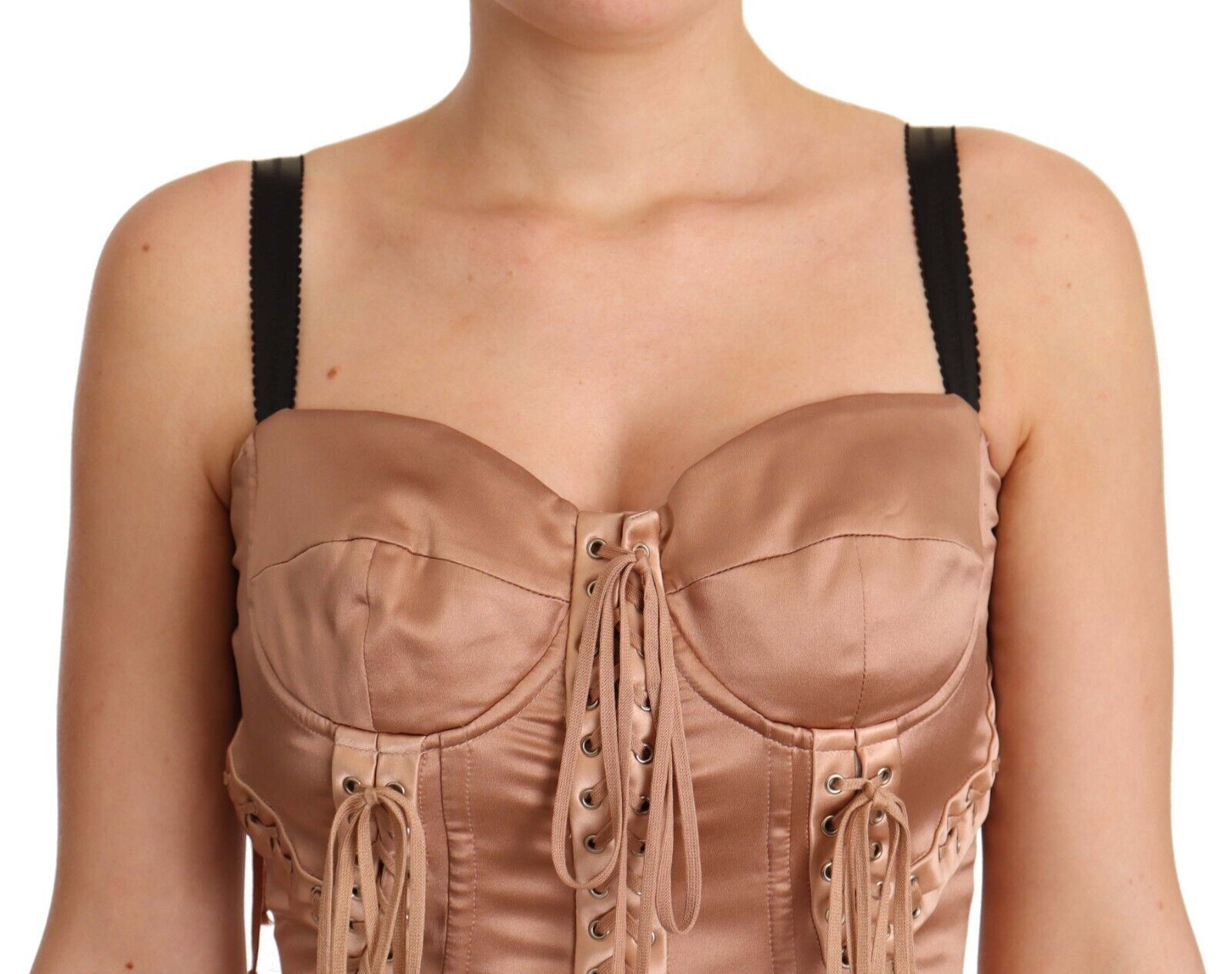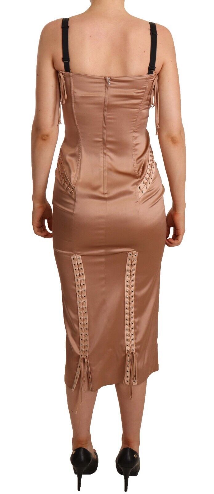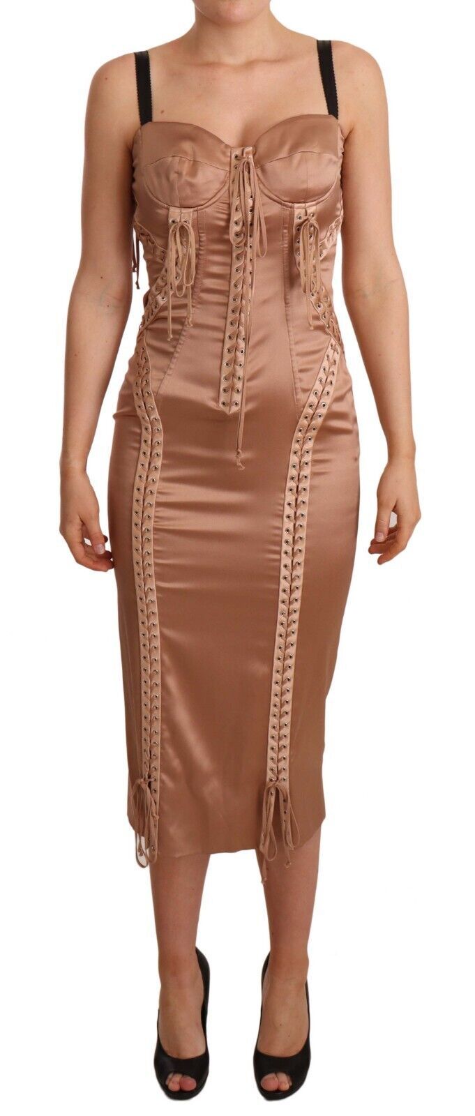 Indulge in the epitome of Italian craftsmanship with this stunning Dolce & Gabbana midi dress. Designed to accentuate your curves, the luxurious blend of silk and elastane ensures both comfort and elegance. This nude, bodycon corset dress is perfected with a lace-up detail and a discreet zipper closure, seamlessly blending sophistication with modernity, and making it a perfect addition to your refined wardrobe.
