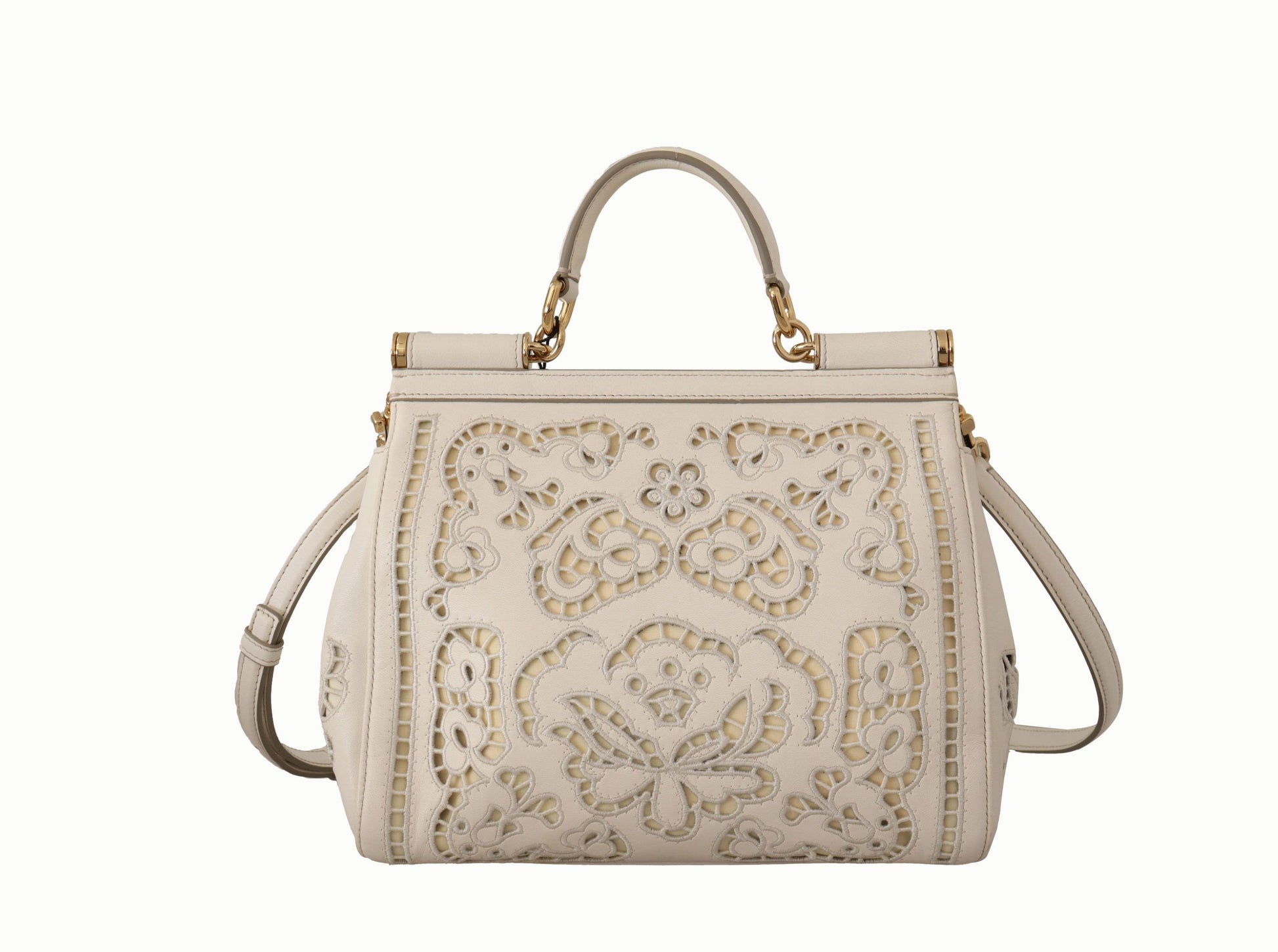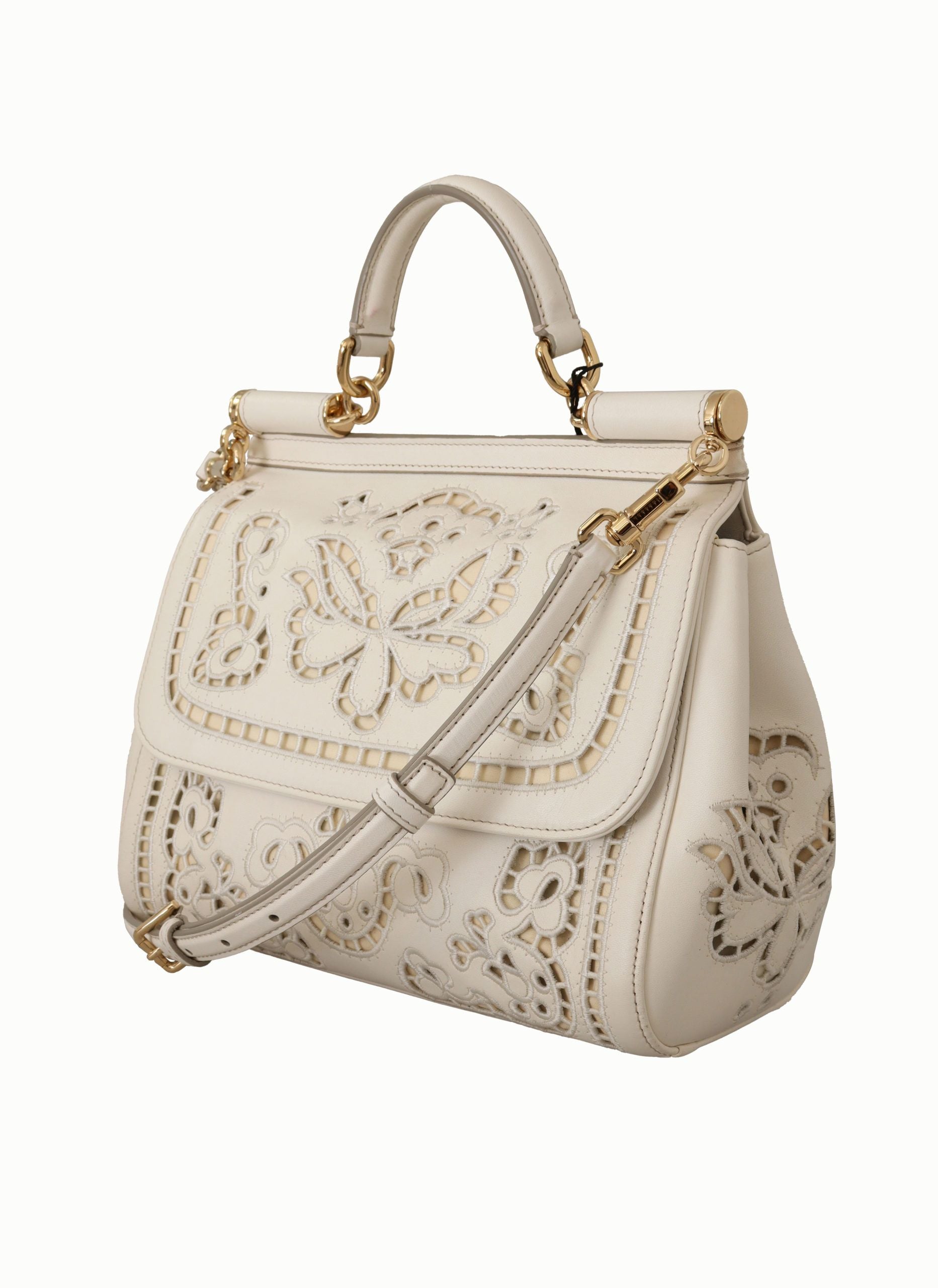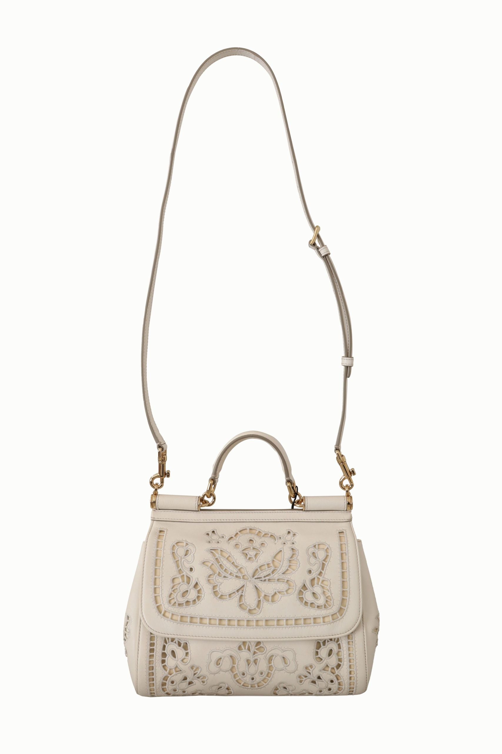 Indulge in the epitome of Italian elegance with this pristine Dolce & Gabbana Sicily Bag . Crafted from luxurious white leather, this stunning piece boasts exquisite gold metal detailing and outstanding craftsmanship. The bag features a versatile magnetic flap closure, coupled with both a detachable and adjustable shoulder strap for tailor-made comfort. Perfect for any high-end fashion collection, this bag promises to elevate your accessory game to the pinnacle of sophistication.