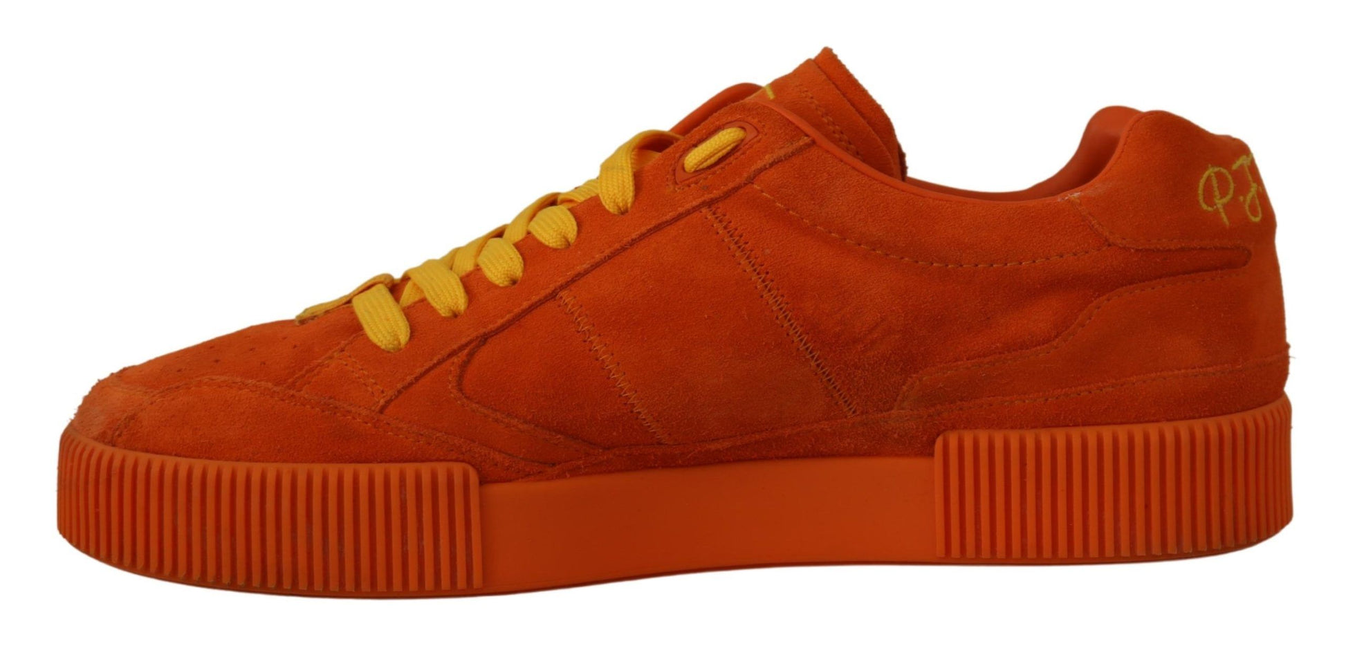 Step into luxury with these vibrant, brand new Orange Suede Italian Sneakers. Crafted from top-quality suede leather and featuring a durable rubber sole, these shoes are the epitome of Italian craftsmanship. Emblazoned with signature logo details, these sneakers are the perfect blend of fashion and function, making them a must-have for any stylish wardrobe.
