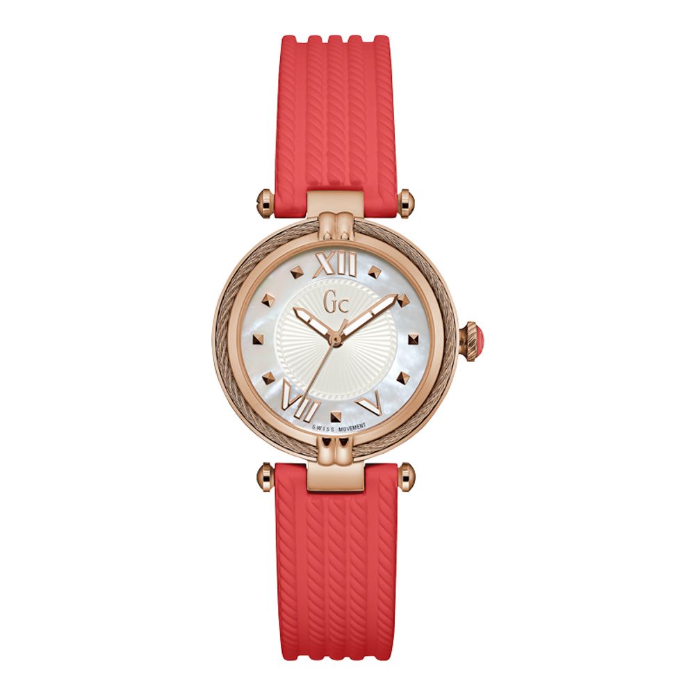 Type of mechanism: QUARTZ. Display: ANALOGICAL. Material Of Case: STAINLESS STEEL. Colour Of Case: PINK GOLD. Material Of Bracelet: SILICONE. Colour Of Bracelet: ORANGE. Dial Colour:WHITE. Glass type: MINERAL. Clousure: BUCKLE. Water resistence: 10ATM. Diameter dial: 32MM. Special Functions:Guess Collection