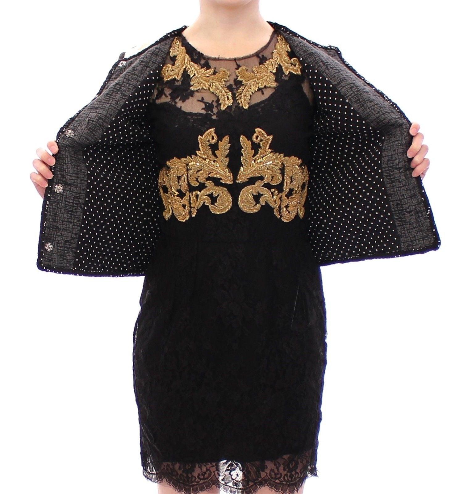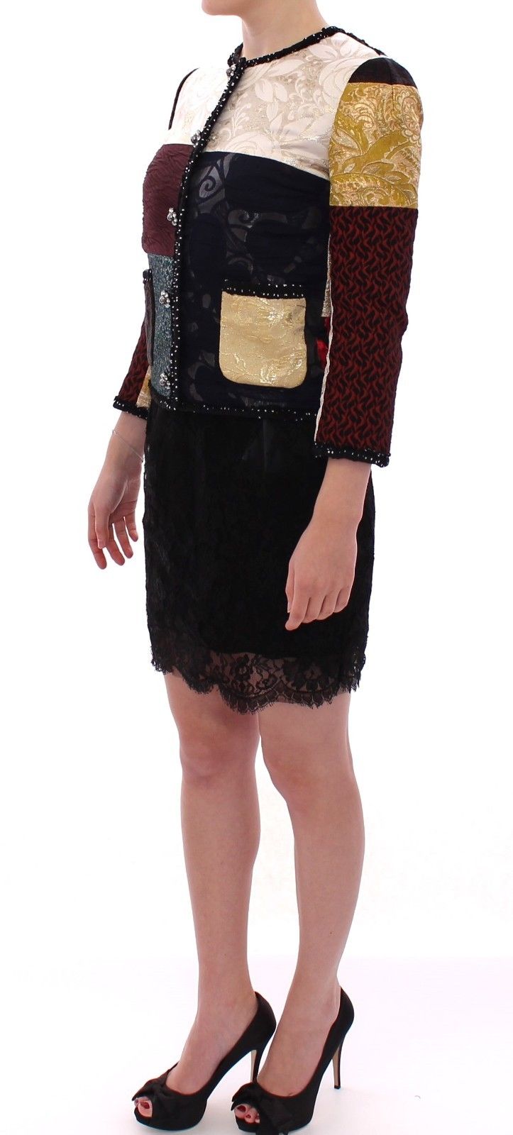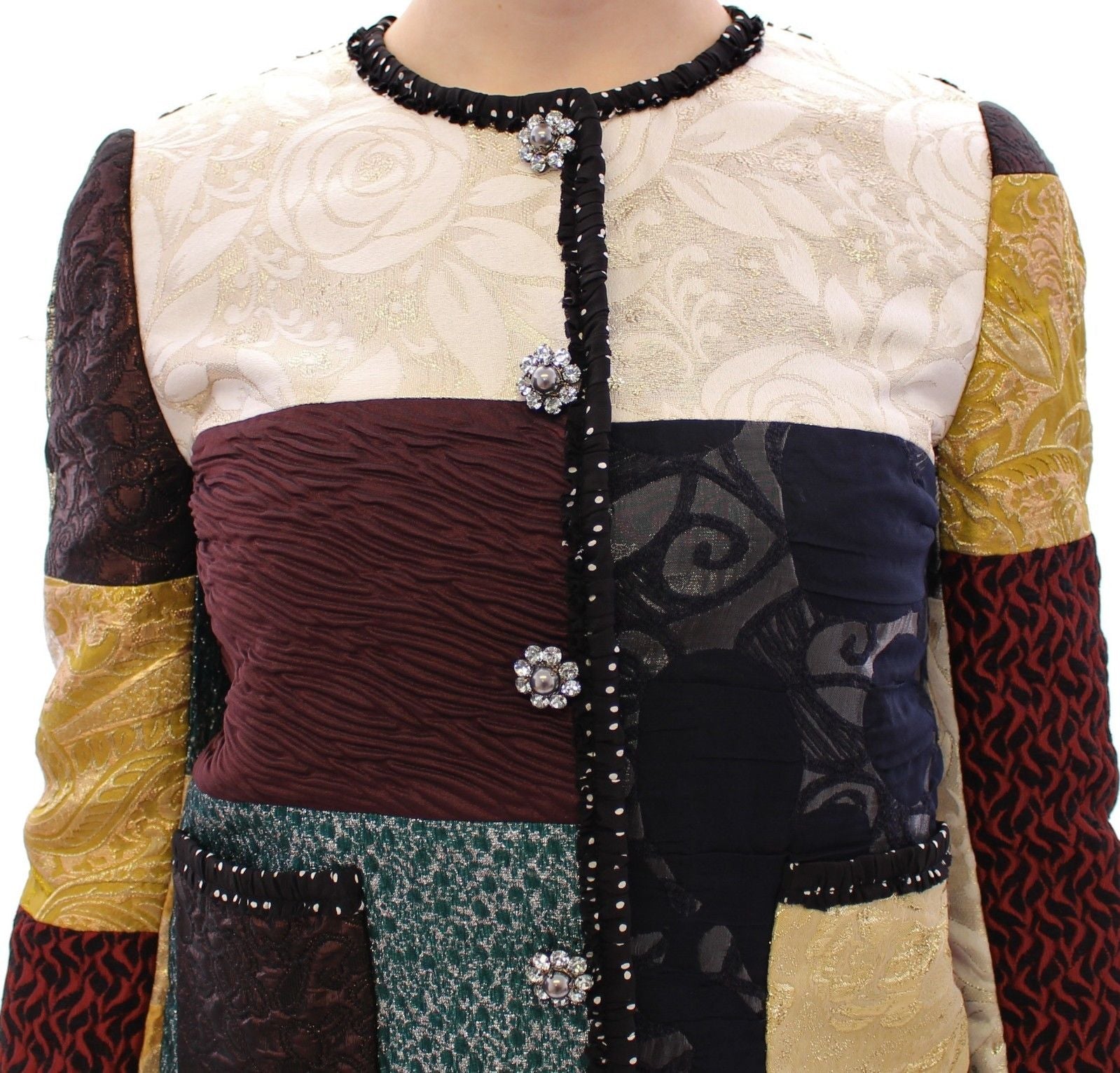 Embrace luxury with this stunning Dolce & Gabbana Exclusive Jacket, a gorgeous display of craftsmanship, ideal for making a bold fashion statement. Meticulously tailored from a rich blend of fabrics, this coat boasts a captivating multicolor patchwork baroque pattern and is opulently adorned with full crystal embedded buttons, ensuring you sparkle with every move. Its unique 3/4 sleeve length and two practical pockets lend both style and functionality, while the chic black and white dotted silk lining offers opulent comfort. Expertly crafted in Italy, this coat is a testament to Dolce & Gabbana’s commitment to excellence and sophistication.