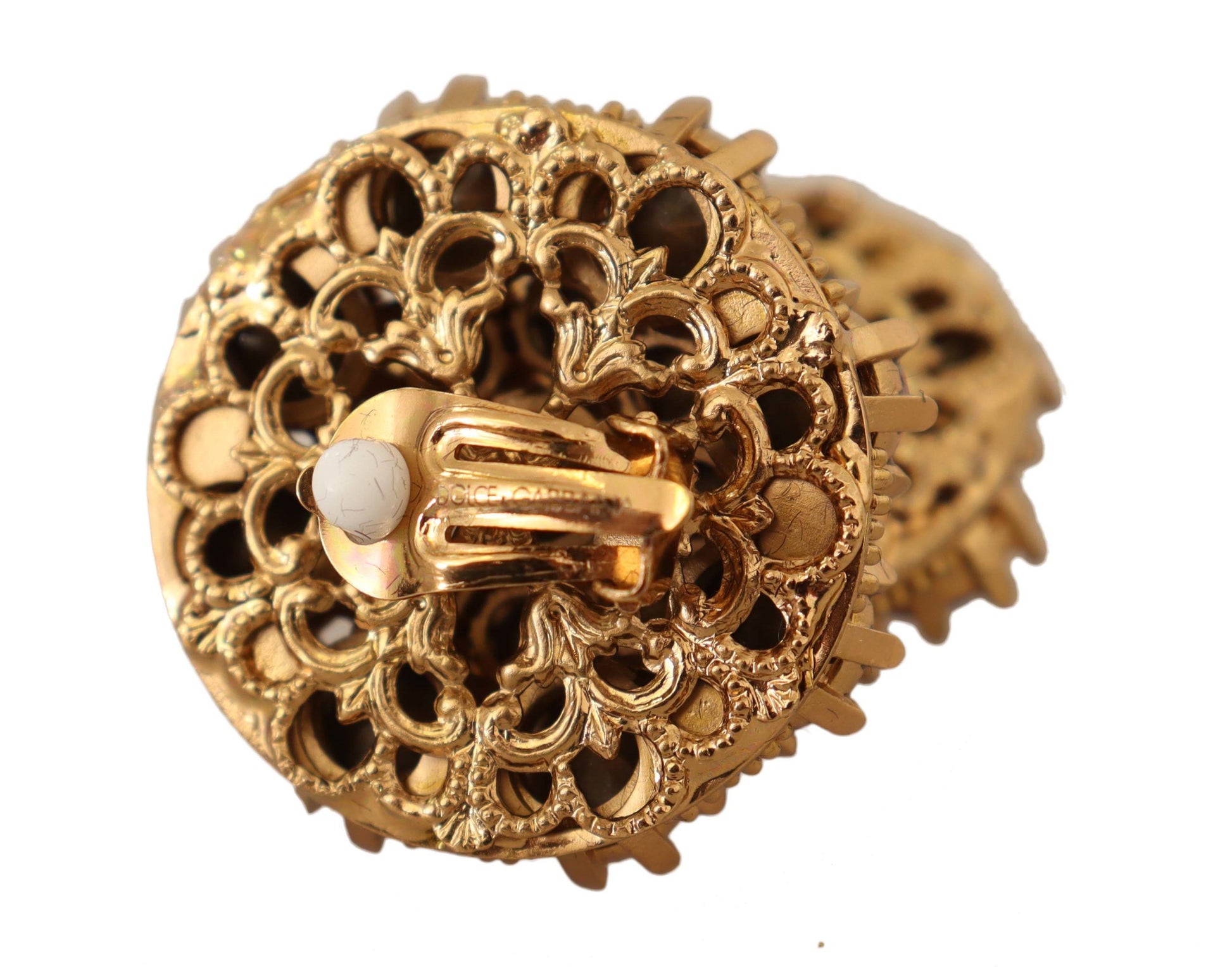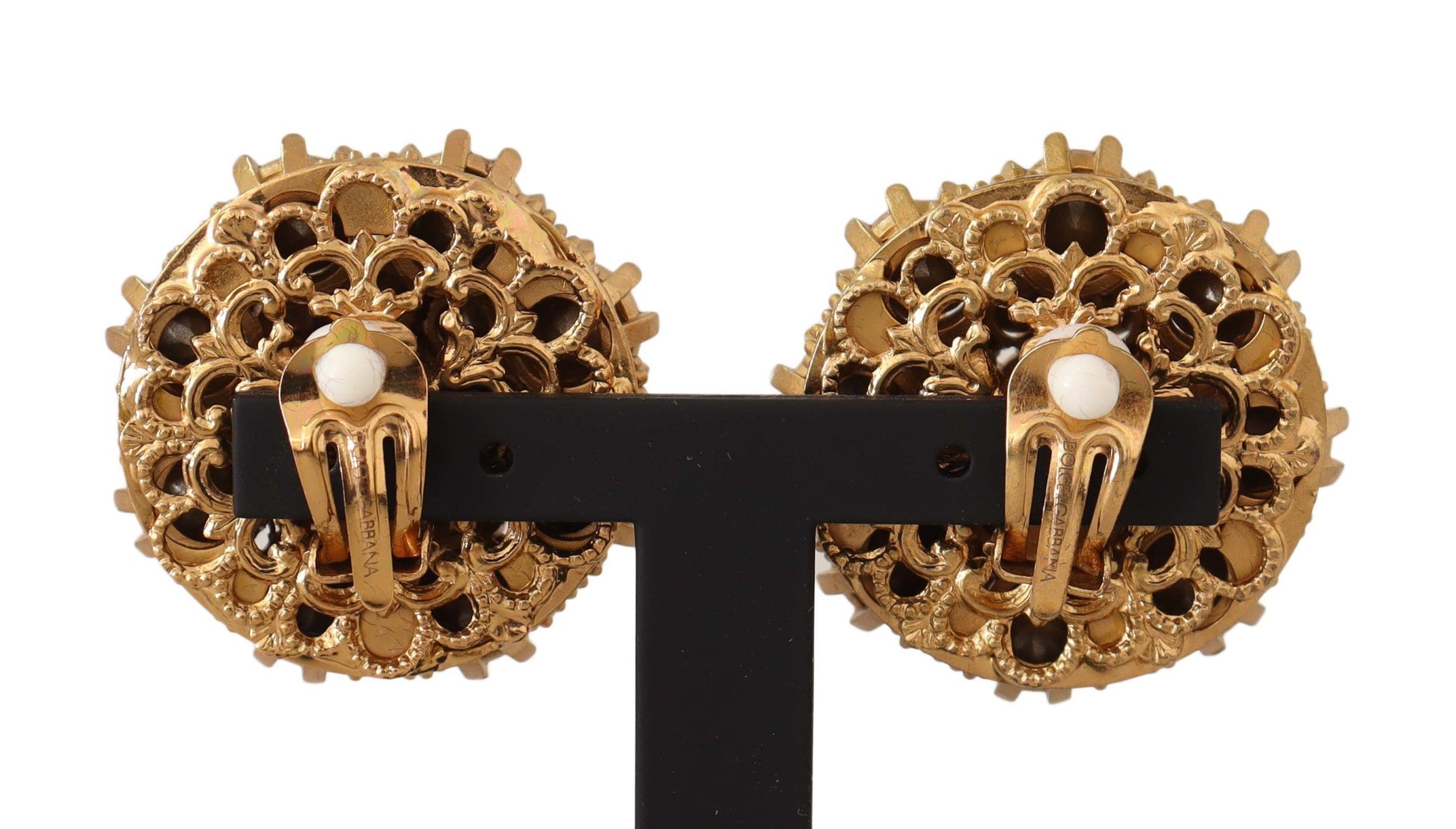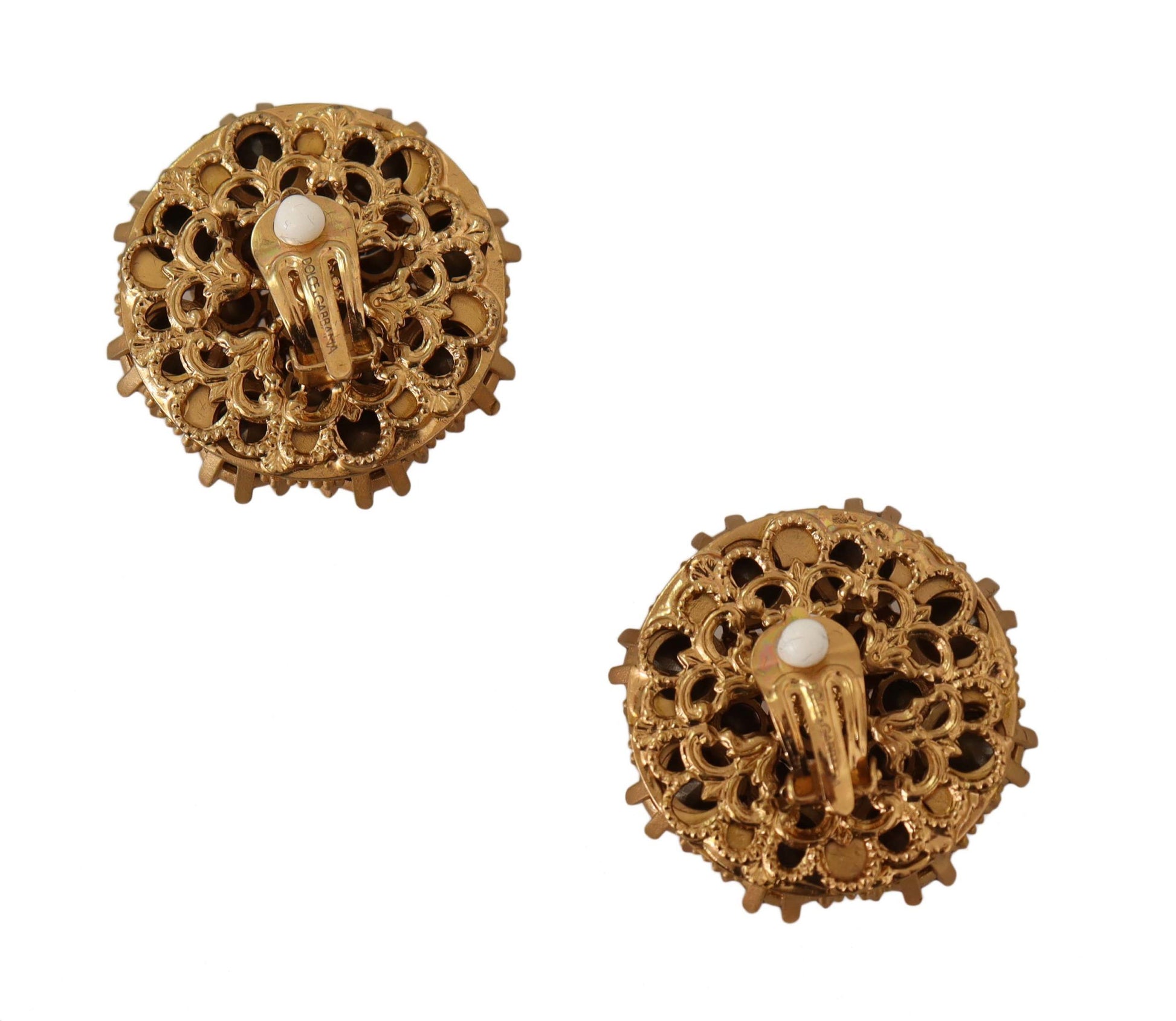 Adorn your evening attire with an opulent touch from these exquisite clip-on earrings. These stunning accessories are a true testament to the masterful craftsmanship of Dolce & Gabbana . Accentuated with a mesmerizing array of clear and pink crystals, and impeccably crafted from a foundation of light brass with a luscious galvanized golden coating, these earrings evoke pure luxury and elegance, perfect for those special, glamorous occasions.