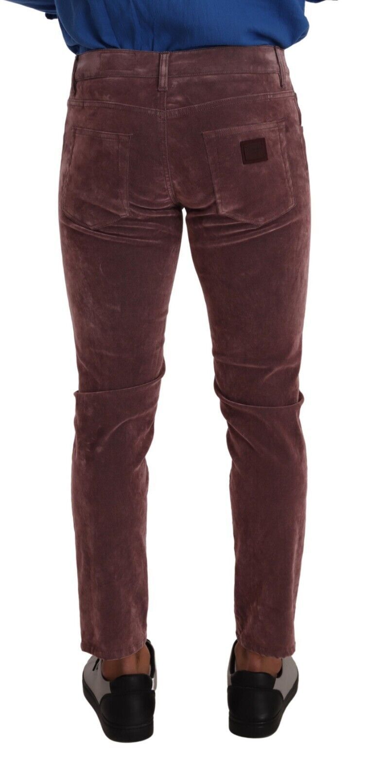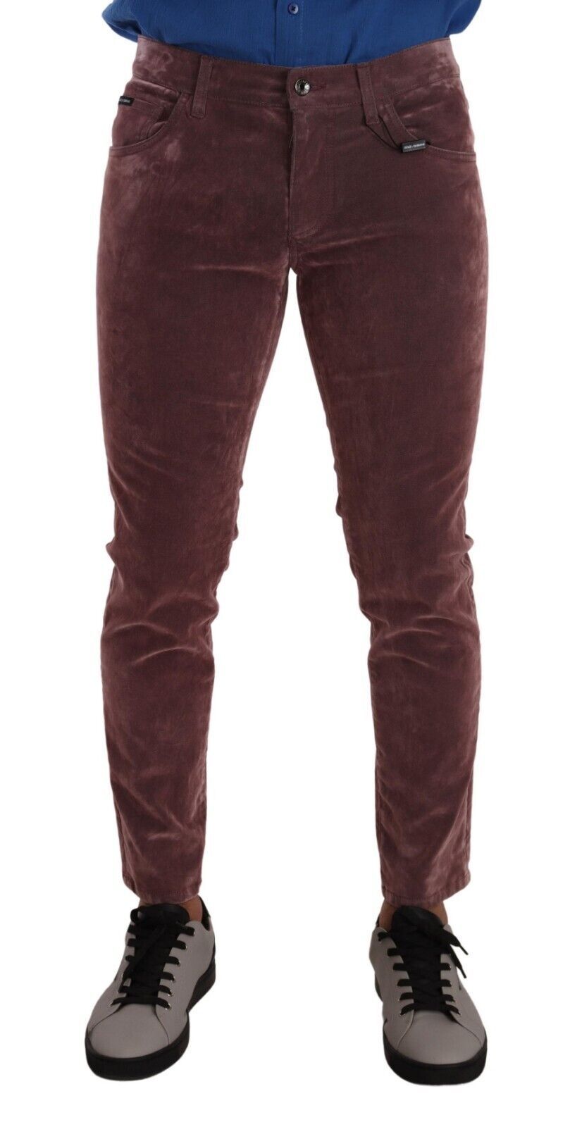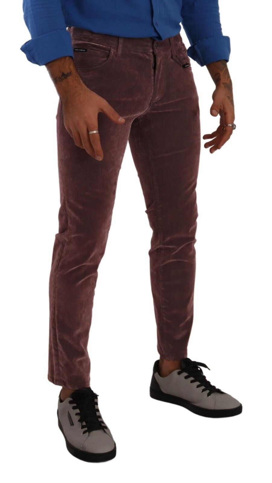 Indulge in the luxury of Italian craftsmanship with these exquisite skinny denim jeans by Dolce & Gabbana. Tailored for a flattering slim fit, these pink cotton velvet jeans feature a sleek zipper and button closure, and come adorned with subtle logo details. Perfect for adding a touch of sophistication to your denim collection, these jeans offer a blend of comfort and style, making them a must-have for fashion enthusiasts.