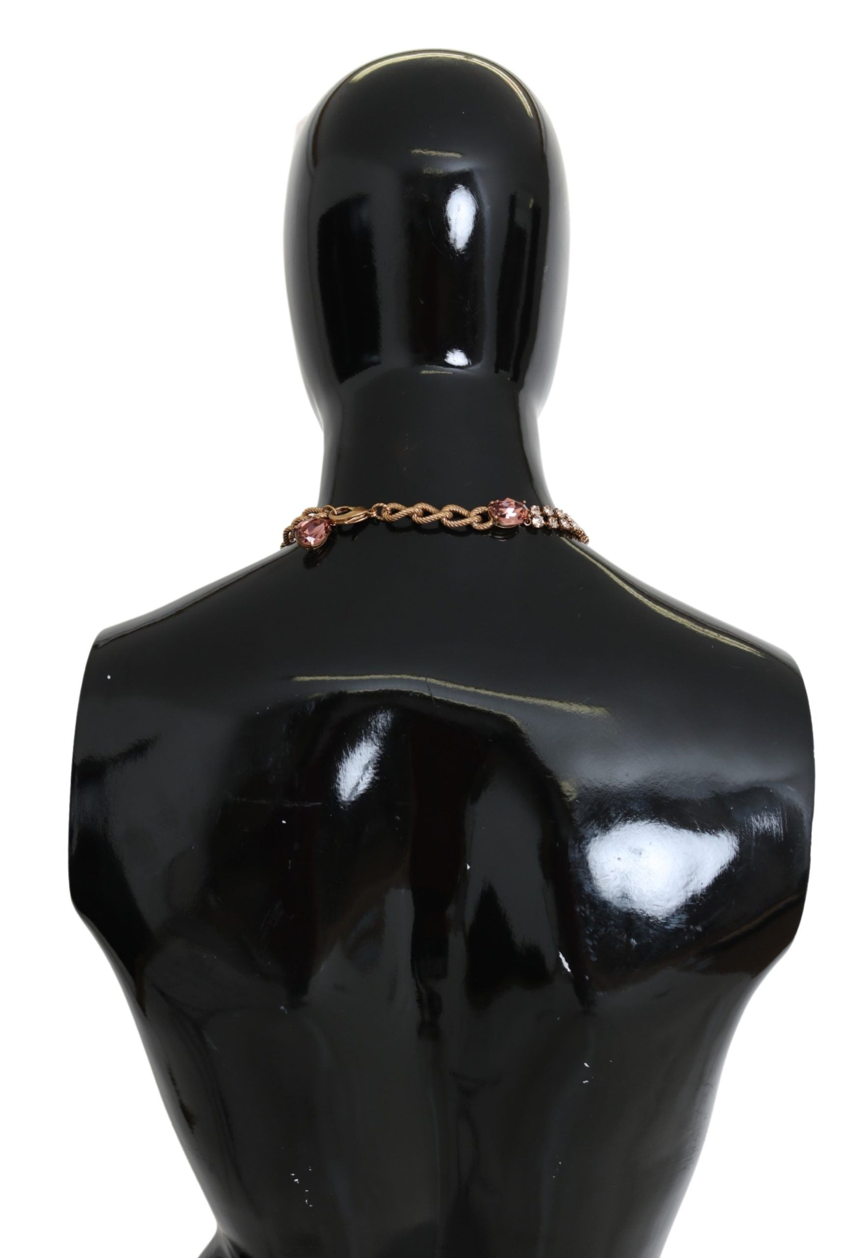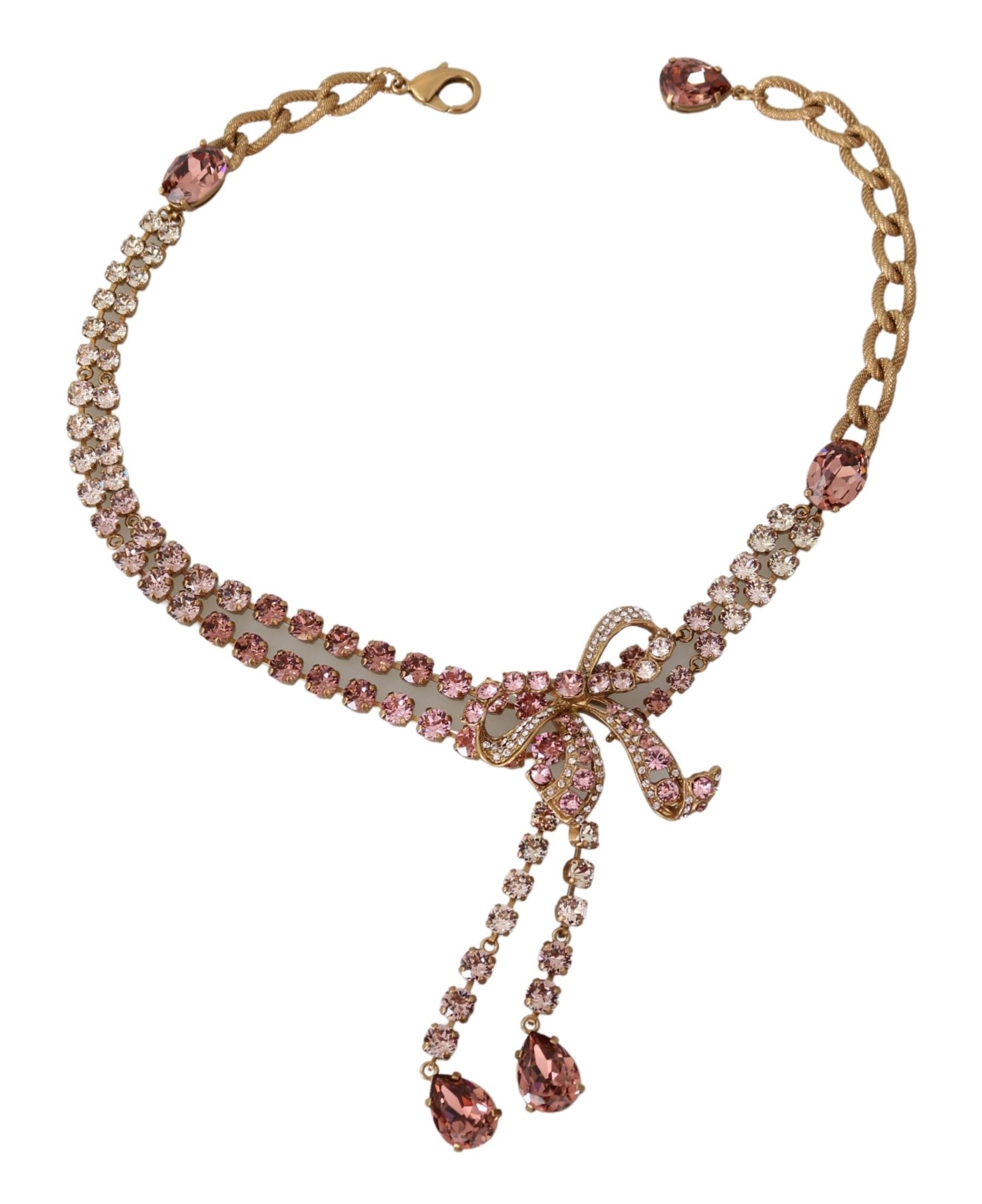 Discover the epitome of elegance with this intricate Dolce & Gabbana choker necklace, crafted to perfection with a stunning off-centre bow motif. Adorned with a luxurious blend of inset crystals in soft hues, this statement piece is the quintessence of ladylike charm paired with a whisper of opulence. Its robust antiqued gold-tone brass chain and enchanting pink crystals make for an eye-catching accessory, ensuring you captivate at every turn. Complete with a lobster clasp closure and the signature logo detail, this Italian-made masterpiece is a timeless addition to any jewelry collection.