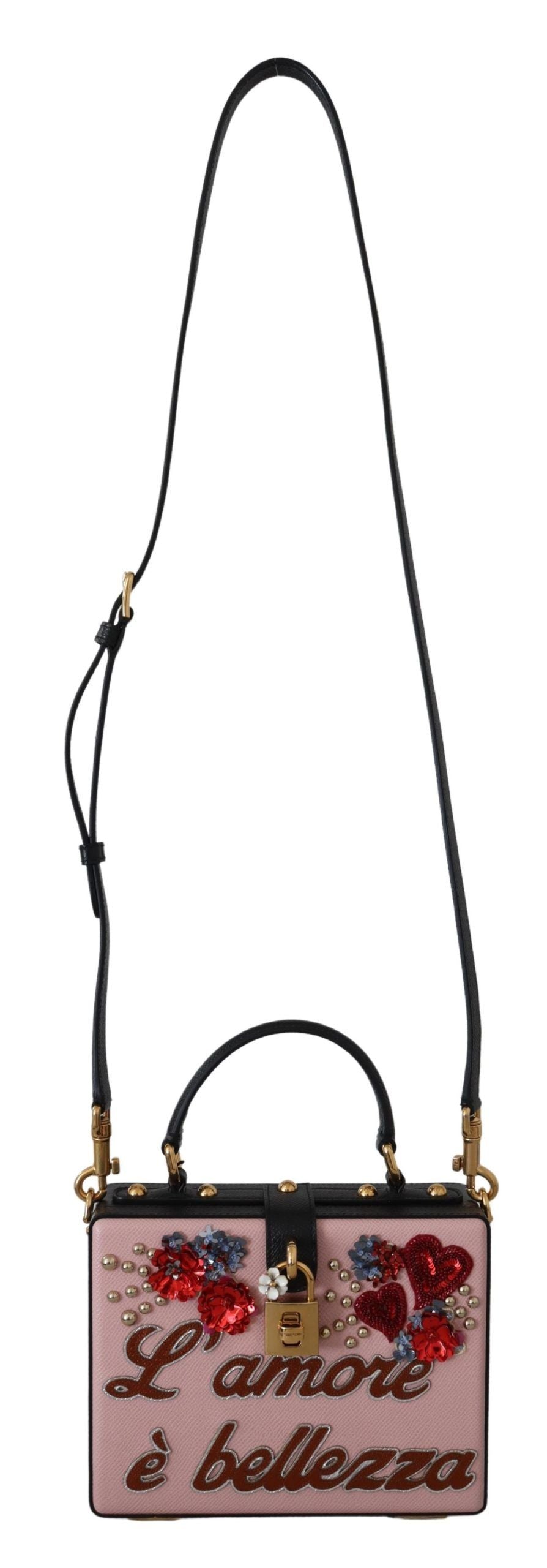 Indulge in the epitome of Italian luxury with this stunning Dolce & Gabbana Dolce Box Bag. A perfect harmony of style and function, this bag is meticulously crafted from premium leather and is adorned with a vibrant sequined heart floral motif, embodying the brand’s iconic ‘L’Amore e Bellezza’ theme. With its striking pink and black colorway and gleaming gold metal accents, including the signature gold logo padlock, this piece isn’t just a bag—it’s a statement.