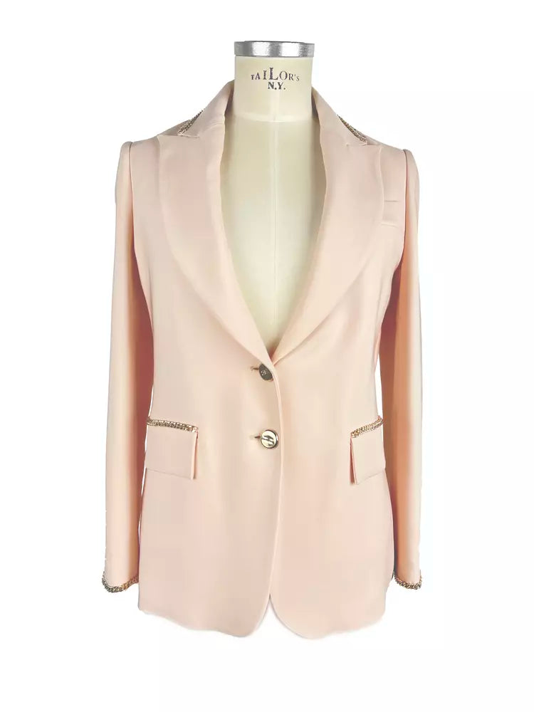 Immerse yourself in the elegance of an Elisabetta Franchi blazer, crafted in a sophisticated blush hue that exudes femininity. Adorned with gold-colored button details and chains, this blazer brings a touch of Italian luxury to any ensemble. Perfect for upscale events or adding a flair of sophistication to your workwear.