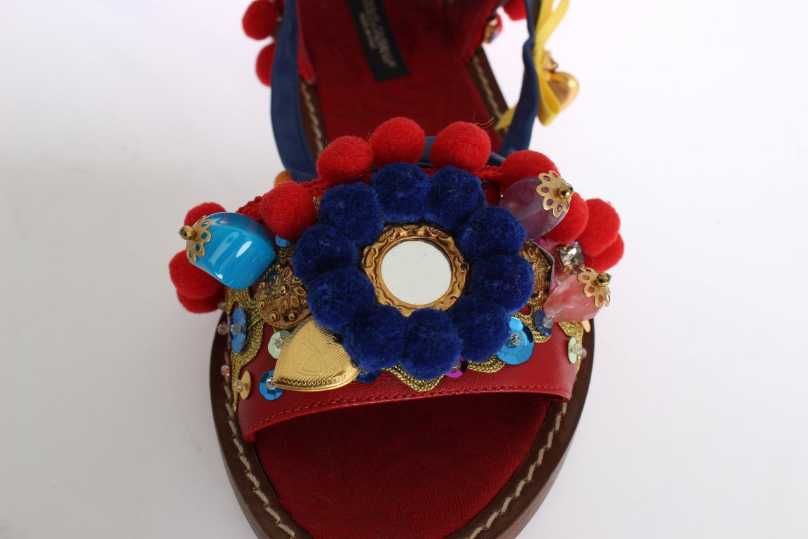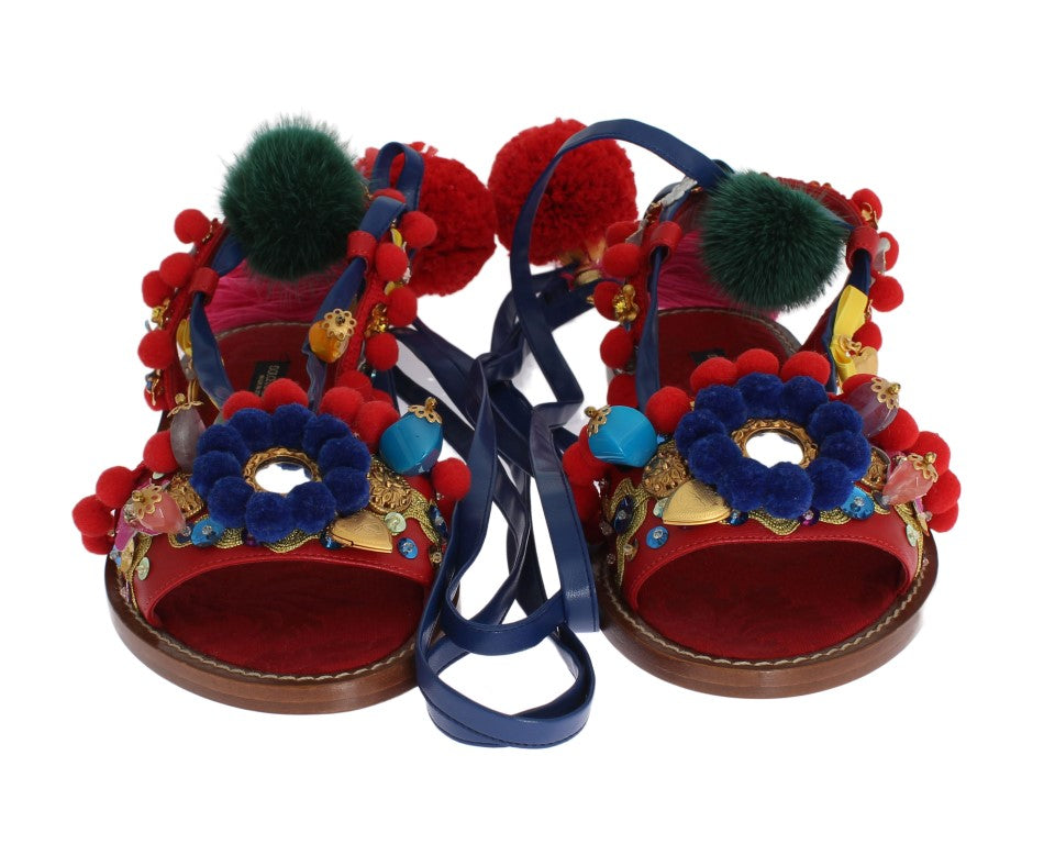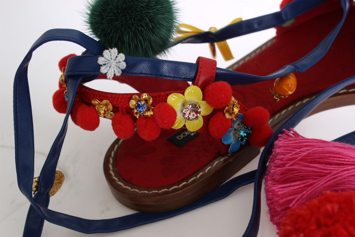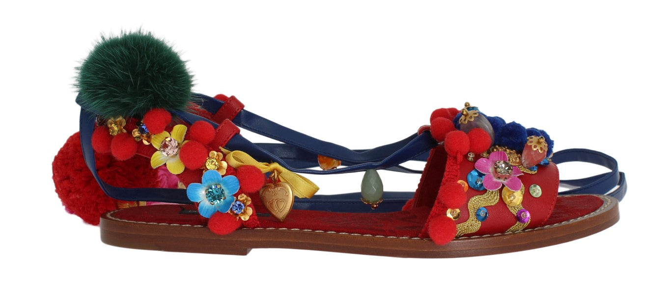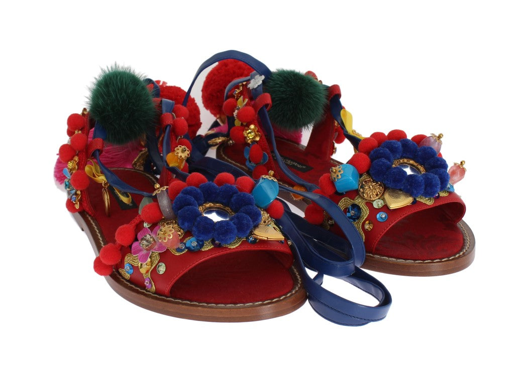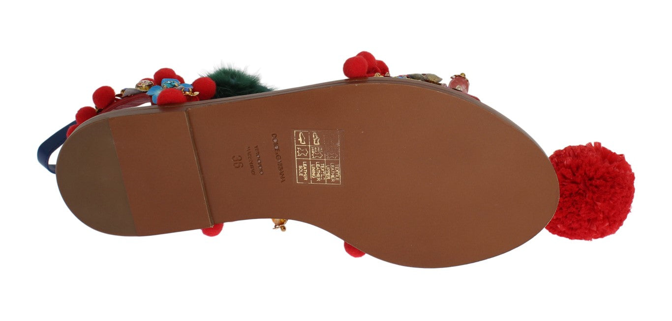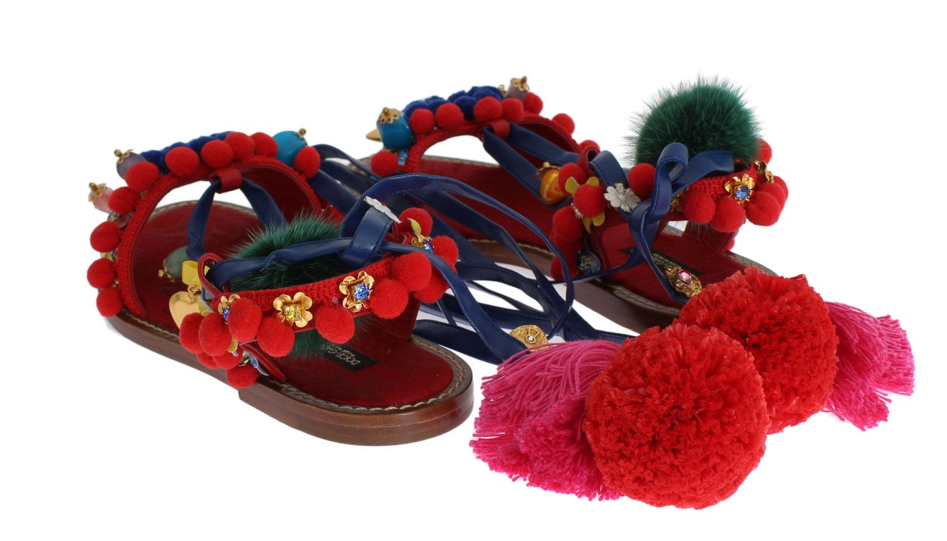 Step out in vibrant elegance with these exquisite Dolce & Gabbana ankle strap flat sandals, designed for the fashionista who revels in uniqueness and sophistication. Expertly crafted in Italy with attention to detail, these sandals feature a lively Torero Pom Pom motive that is sure to turn heads. Indulge in the luxury of 100% Leather, adorned with a kaleidoscope of multicolor crystals that beautifully capture the light with every step you take. Perfect for adding a touch of glamour to any outfit!
