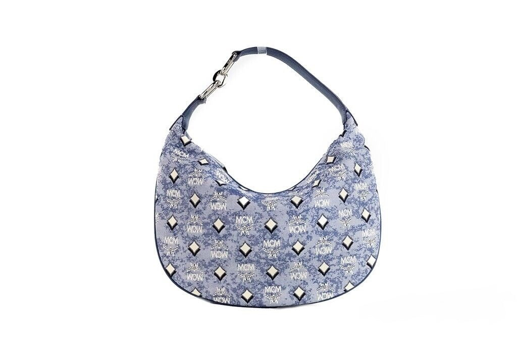 Style: MCM Portuna Large Crescent Blue Vintage Denim Fabric Hobo Bag Shoulder Handbag