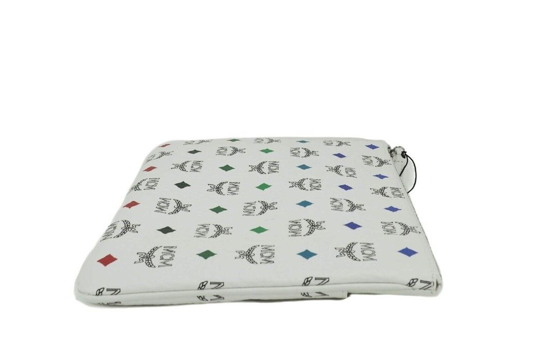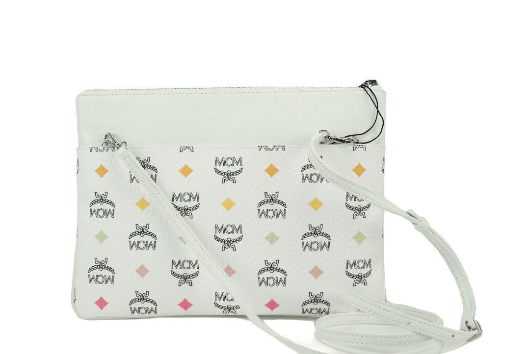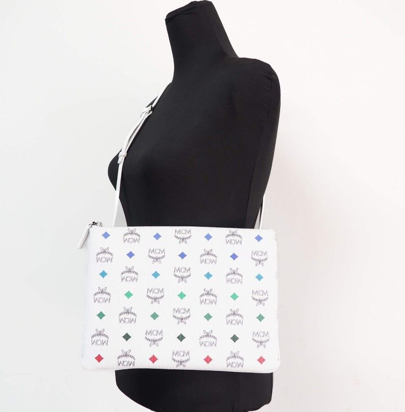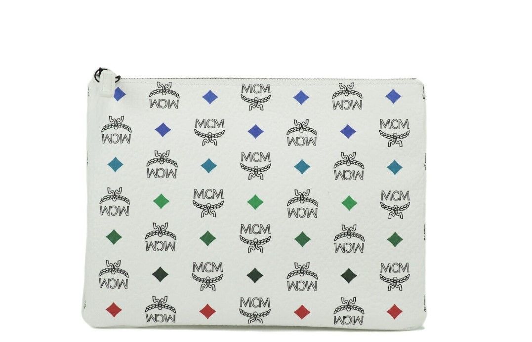 Style: MCM Portuna Medium Visetos Flat Pouch Bag (White)