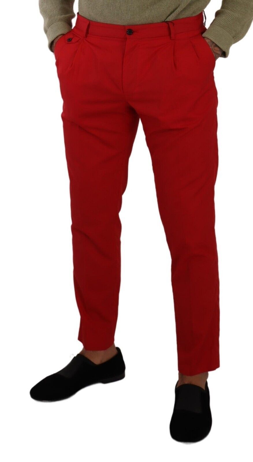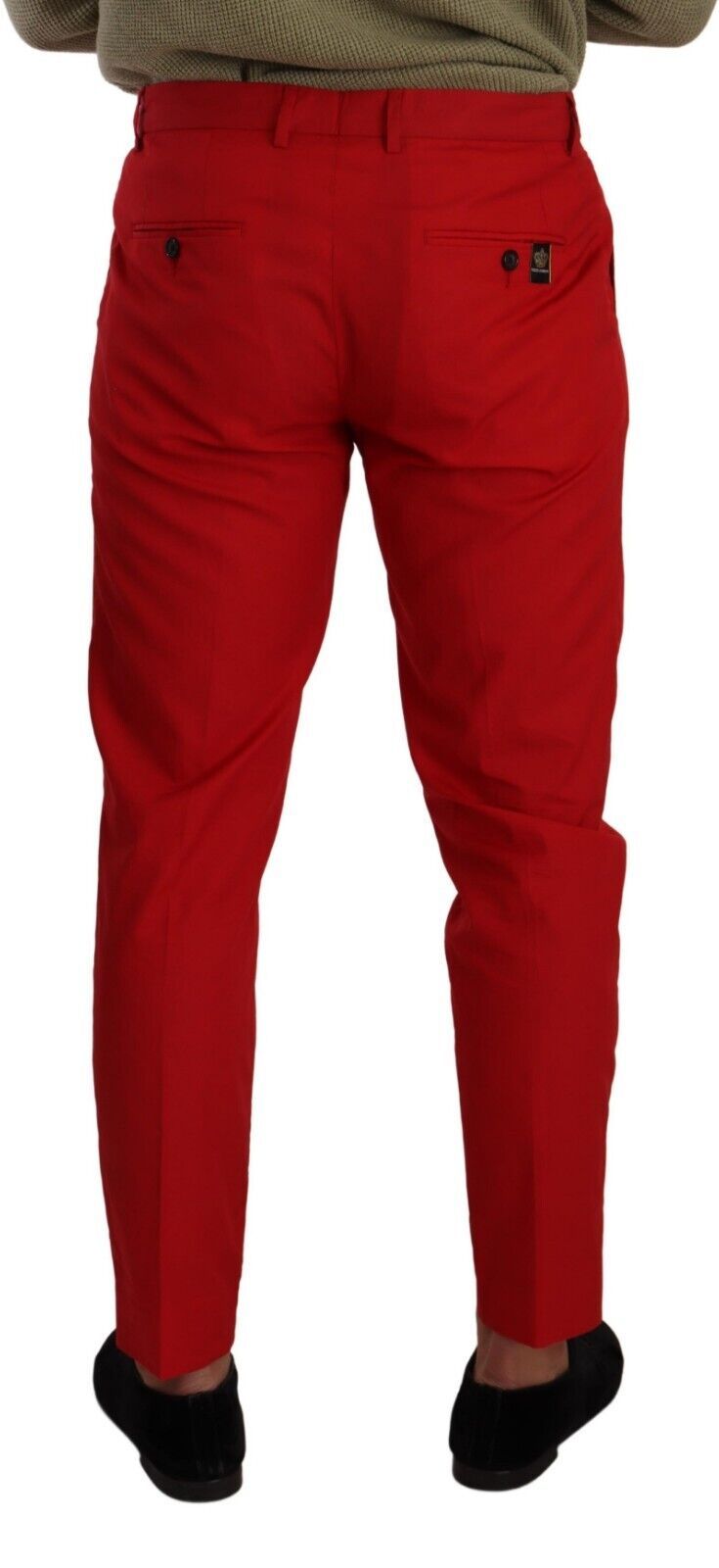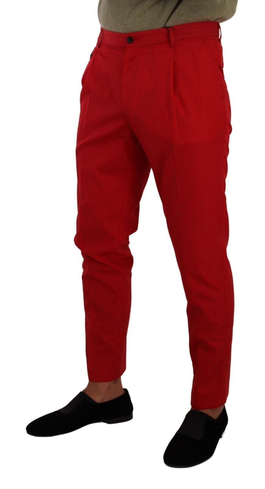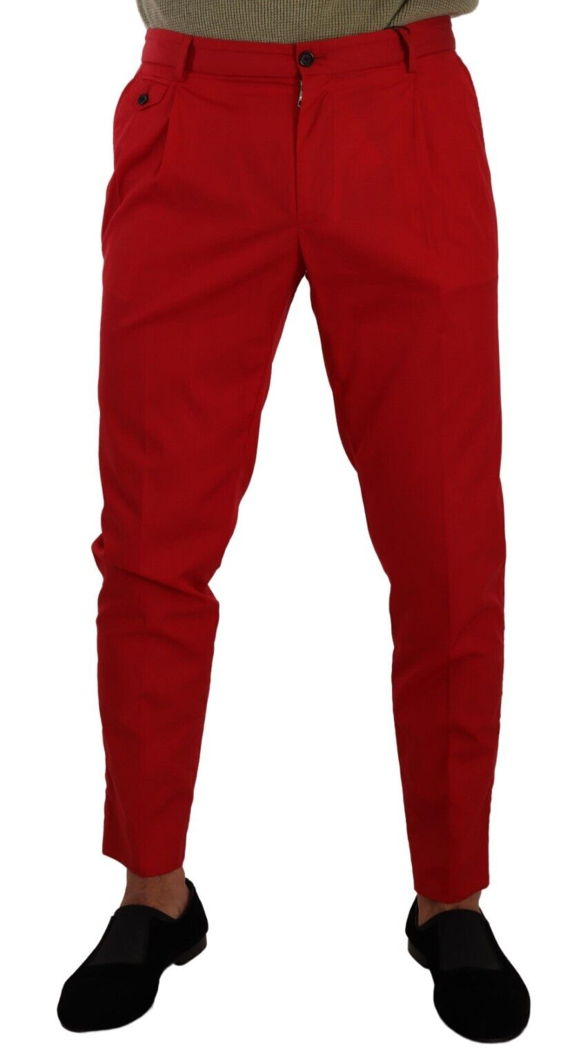 Introduce a touch of elegance to your wardrobe with these stunning slim fit dress pants from the luxurious Dolce & Gabbana. Crafted in Italy, these brand new, tag-attached trousers are the perfect blend of comfort and style, featuring a sharp red hue that is bound to turn heads. With a sleek zipper and button closure, these pants signify high-end fashion with every detail.