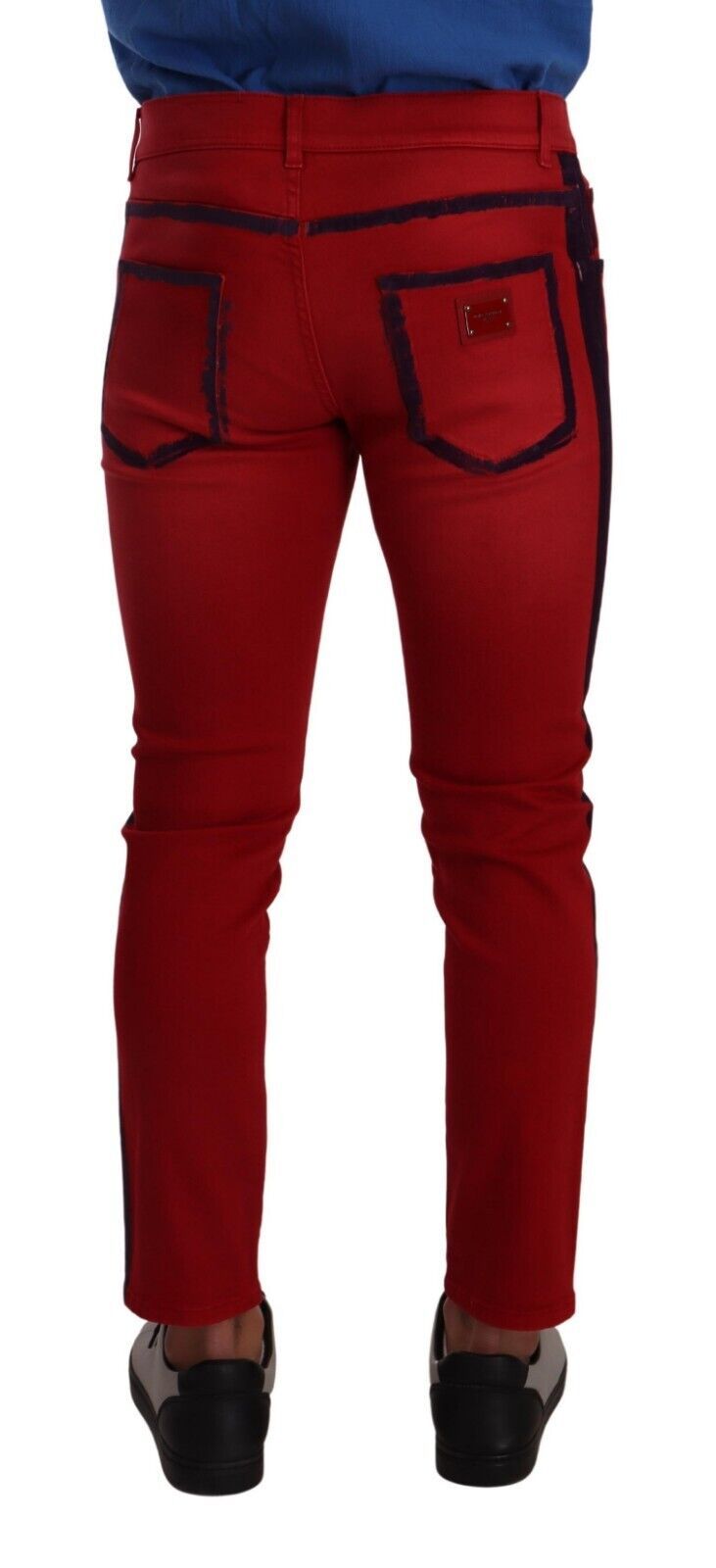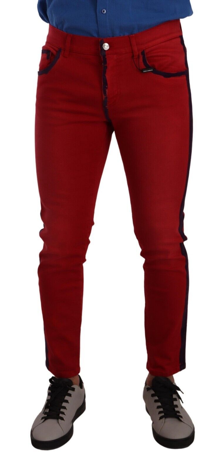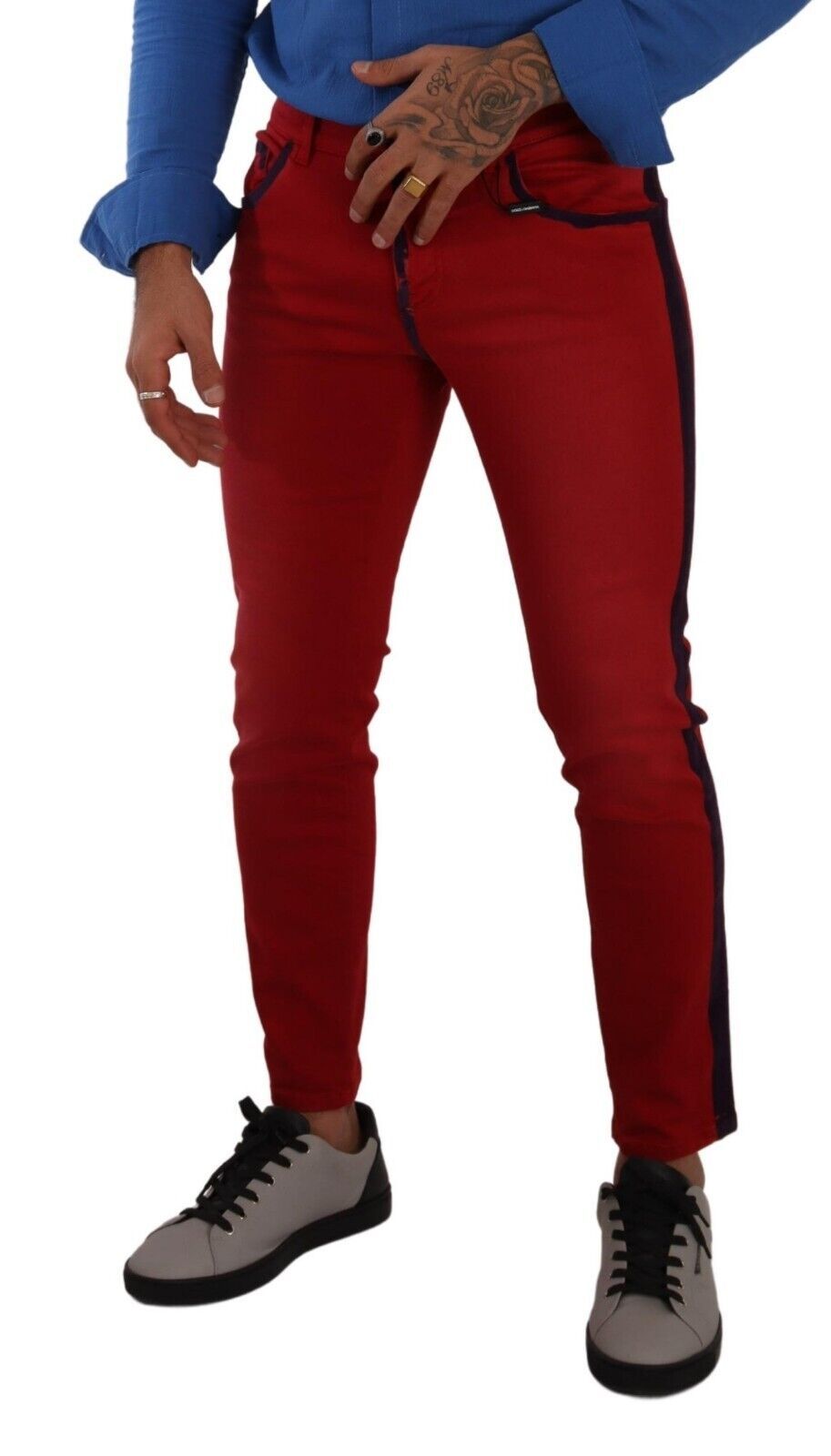Inject a pop of color into your wardrobe with these stunning red skinny jeans from Dolce & Gabbana. Perfectly blending high fashion with casual style, these slim fit jeans are brand new with tags, promising 100% Authenticity. Crafted for those who love to stand out, the cotton stretch denim ensures both comfort and a flattering fit. Straight from Italy, these jeans feature a timeless zipper and button closure with subtle logo details to complete your look.