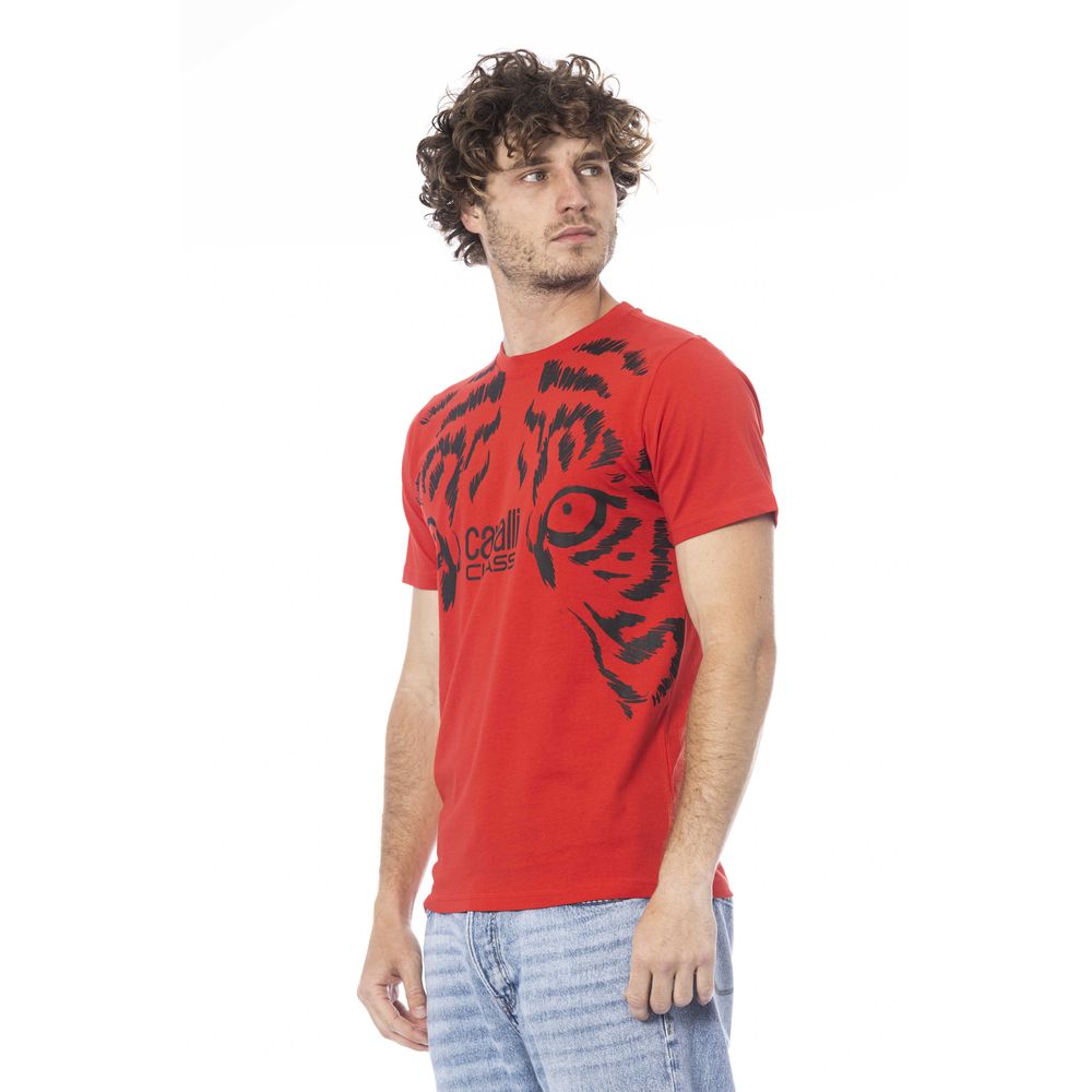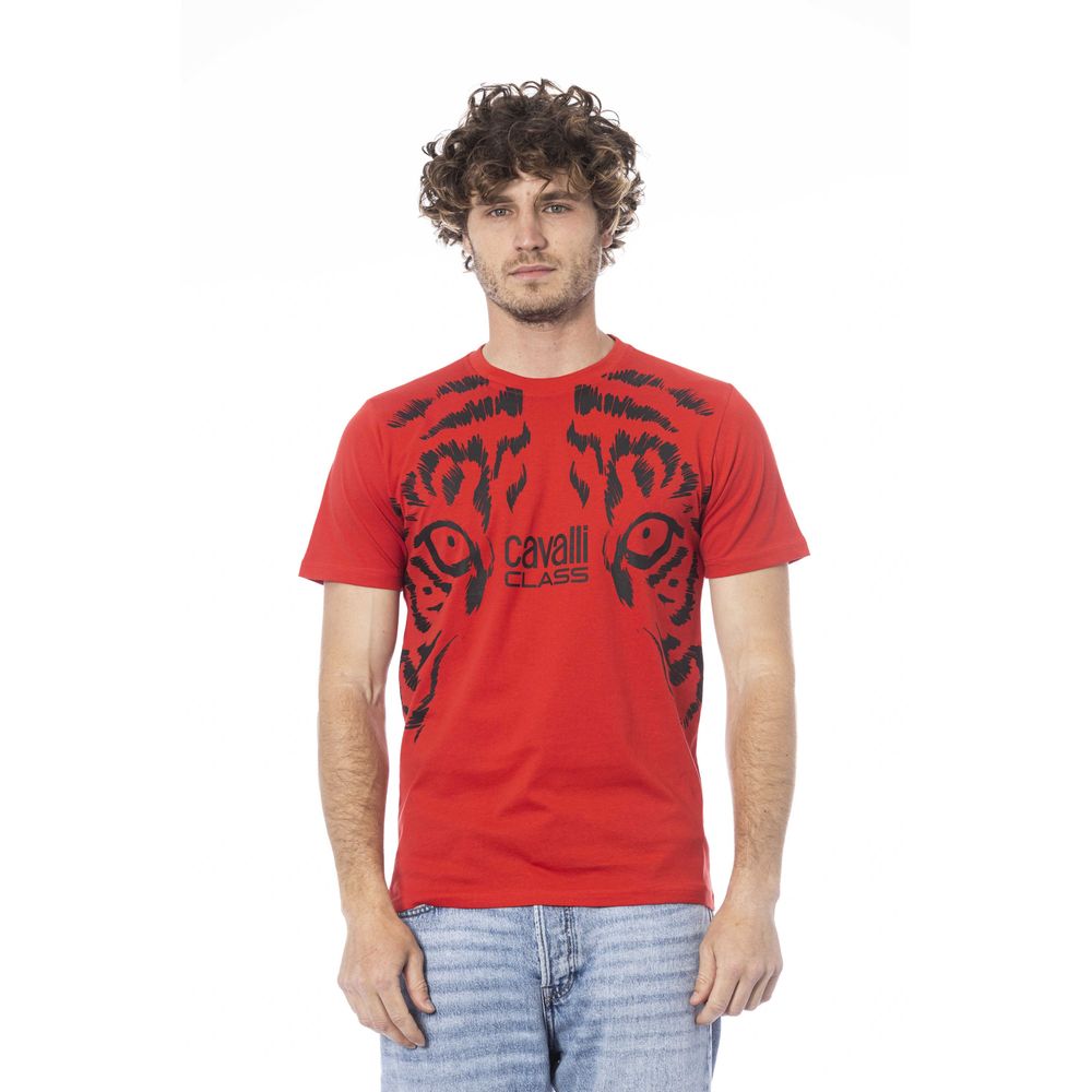 Elevate your off-duty ensemble with this vibrant red T-shirt from Cavalli Class, an epitome of casual luxury. Crafted from 100% premium cotton for maximum comfort, this tee features a chic crew neck and short sleeves, perfect for versatile styling. The highlight, a bold Cavalli Class logo, sits proudly on the chest, making it an instant statement piece. Dive into the blend of sophistication and practicality with this must-have addition to your wardrobe.