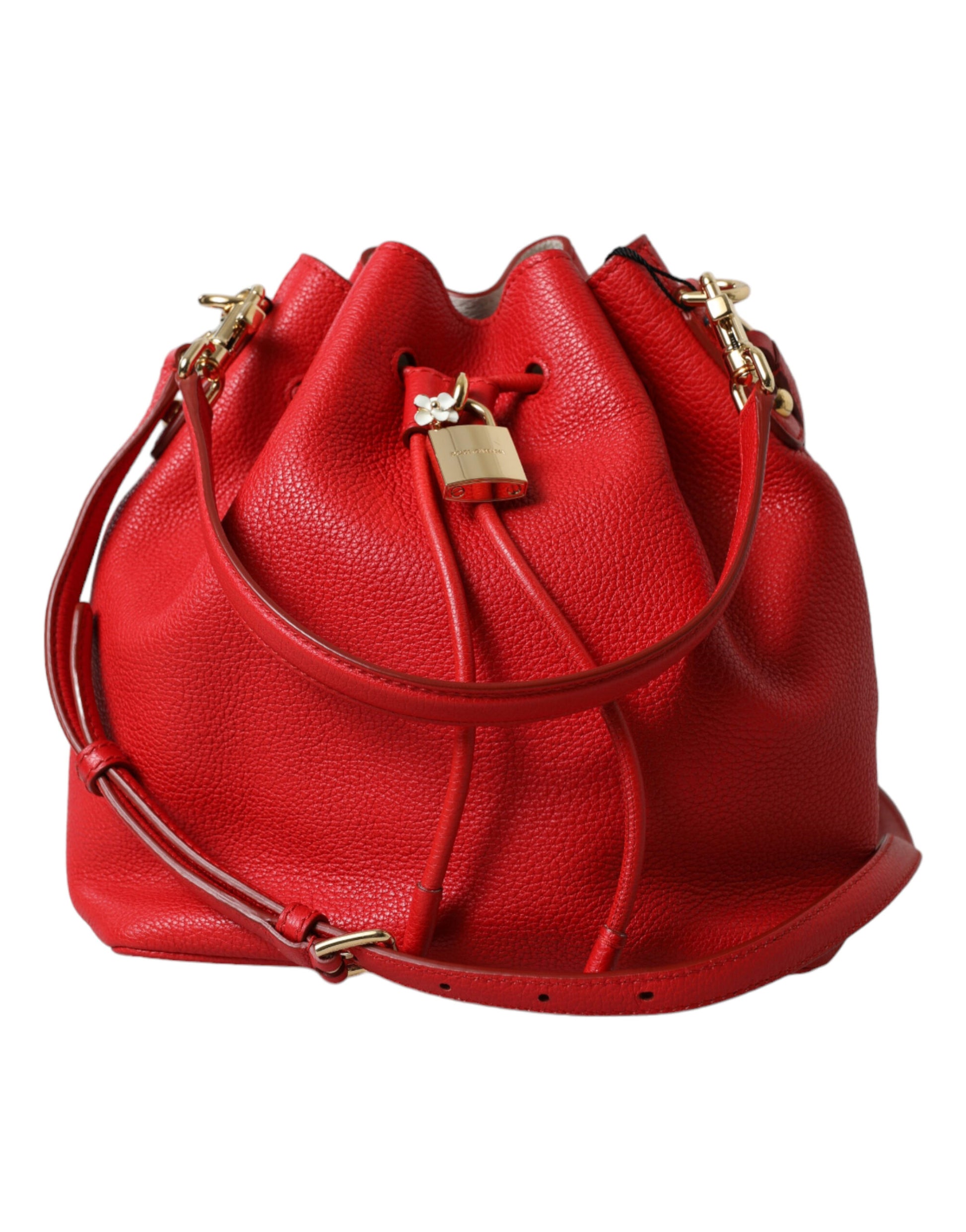Indulge in the epitome of Italian luxury with this immaculate Dolce & Gabbana leather bag. This ‘Claudia’ model is a testament to elegant design, featuring a radiant red hue accented by lustrous gold-tone metal detailing including a sophisticated padlock on the front. A detachable shoulder strap allows for versatile carrying options, while the beige polka dot interior adds a playful touch to this upscale accessory. With its drawstring closure, the spacious fabric-lined interior ensures all your essentials are secured in style. Crafted with the highest craftsmanship, this bag is a true statement piece for any fashion connoisseur.