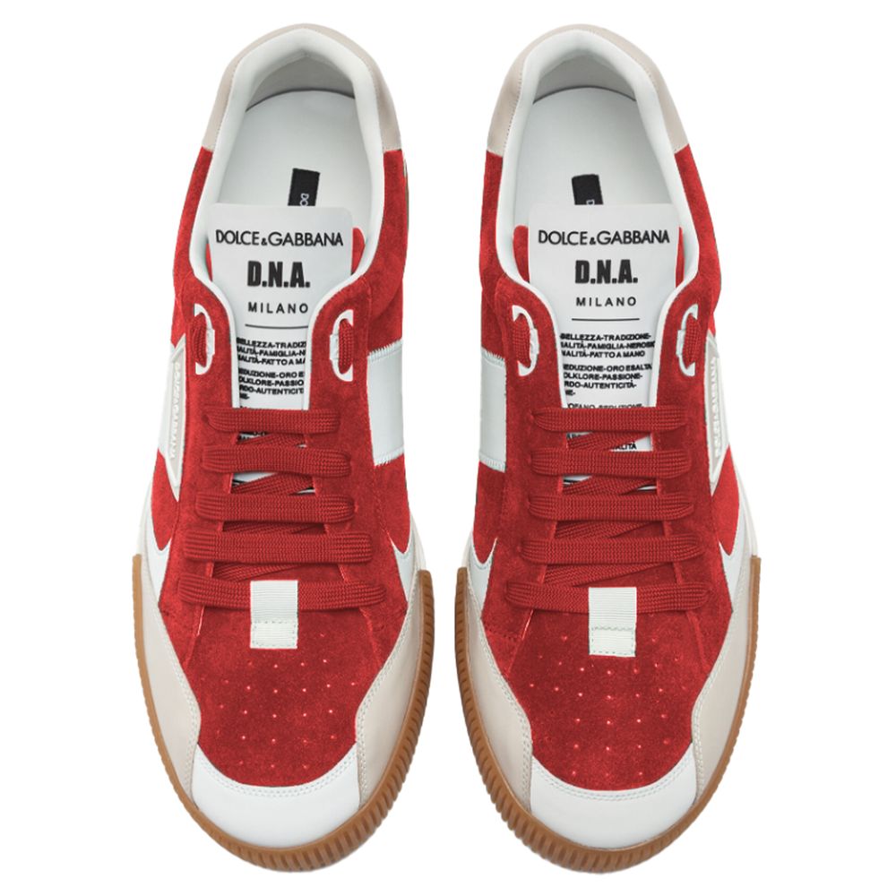Dolce & Gabbana red suede calfskin and white leather parts low sneaker, rubber logo on the side, white and brown rubber sole