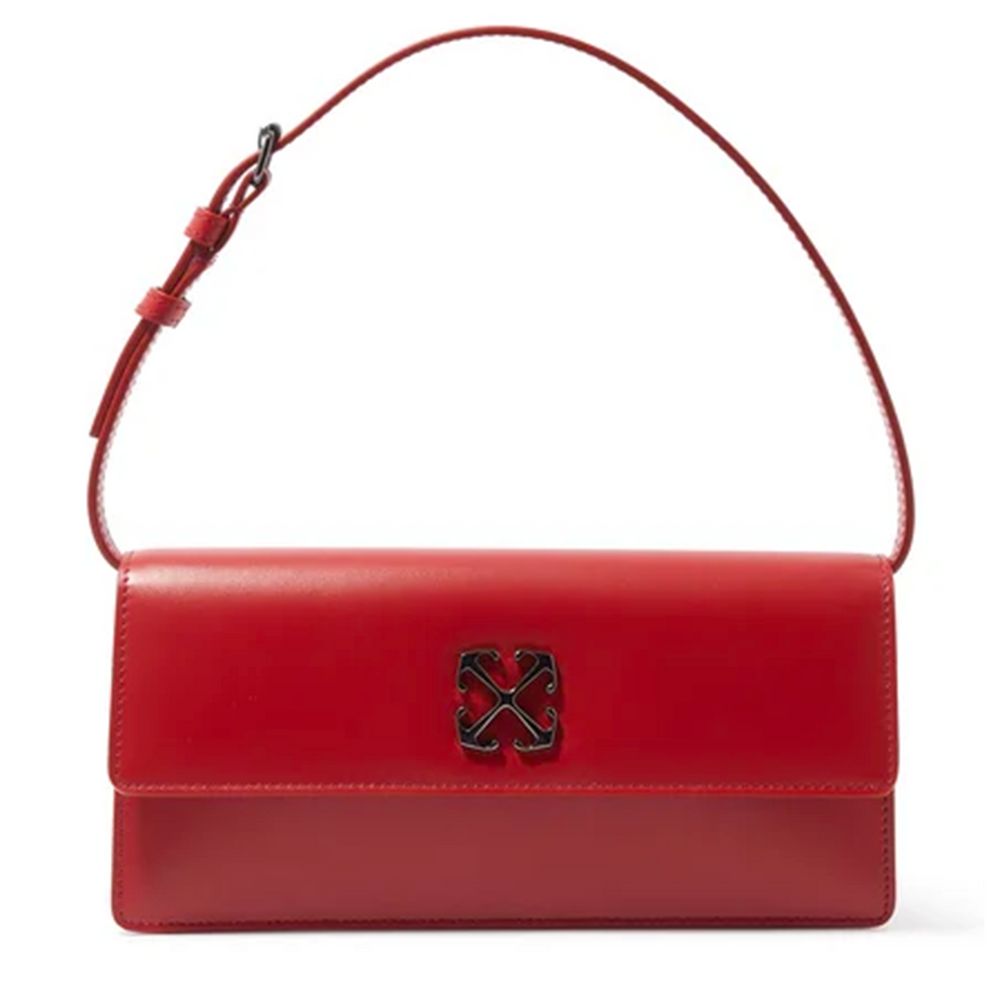 Off-White Jitney 1 shoulder bag, metal details, including an Arrow pattern plaque. It features a single handle. The accessory is made in Italy from 100% calfskin leather. 26x14x7 cm