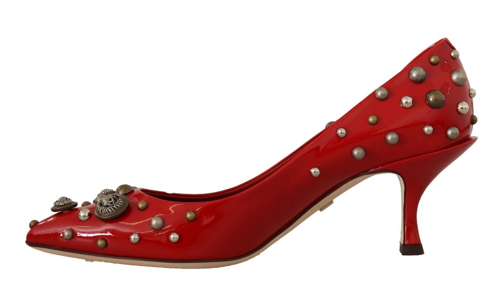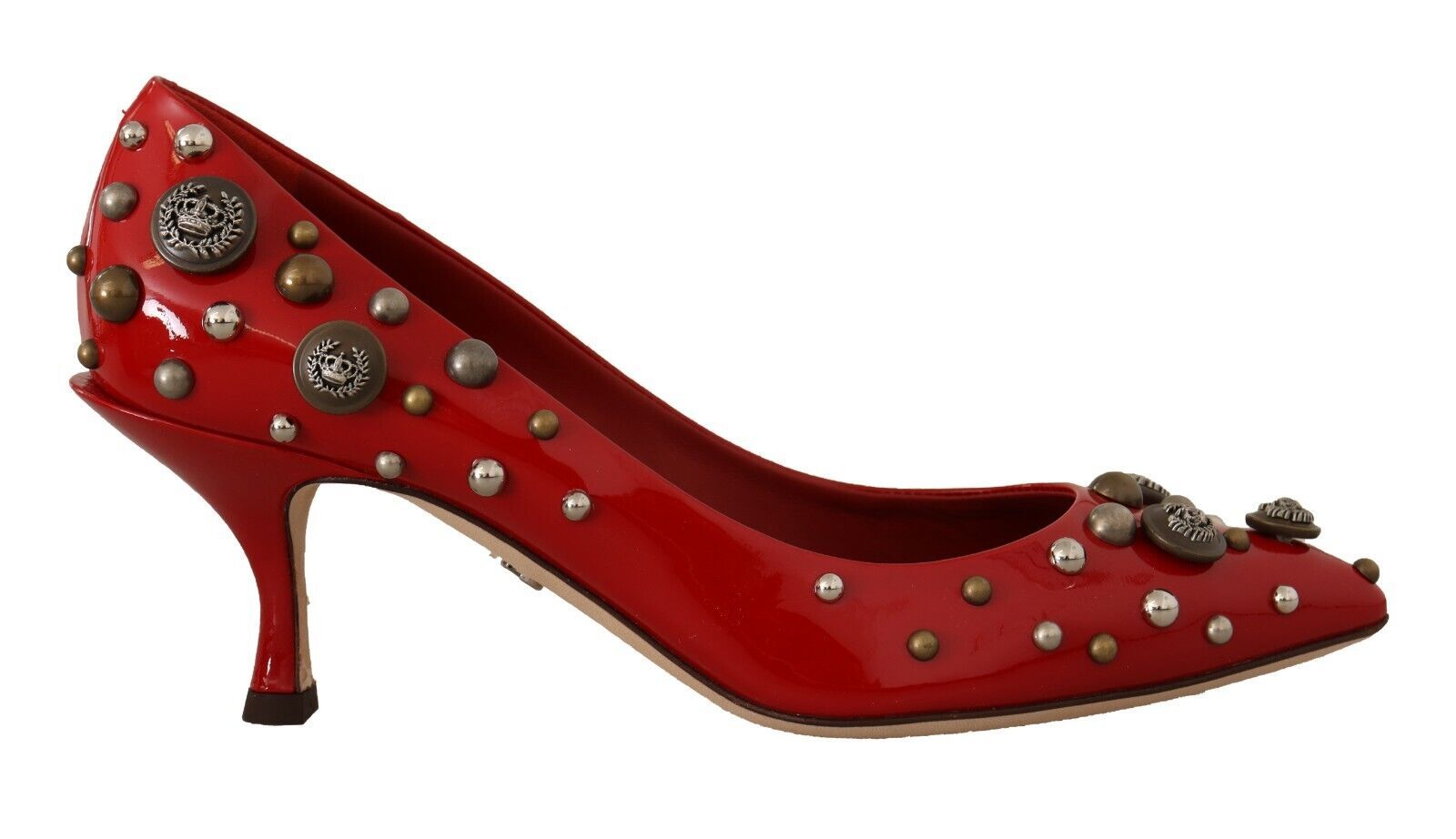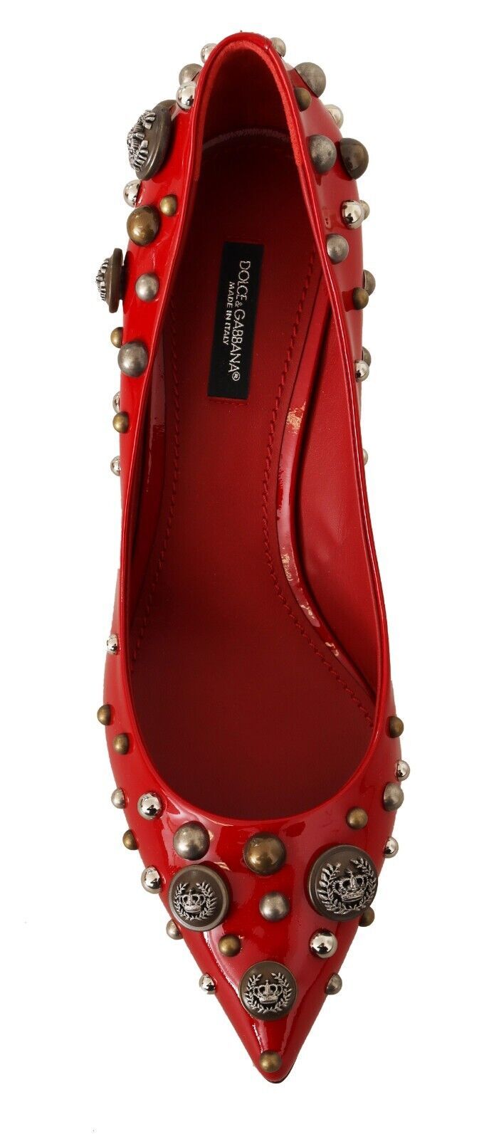 Step into luxury with these stunning, brand new with tags pumps from Dolce & Gabbana. Impeccably crafted in Italy, these shoes are a statement piece with luxurious patent leather adorned with bold studs. The desirable kitten heels paired with the chic pointed toe design are sure to elevate any ensemble, offering both high-end style and comfort.