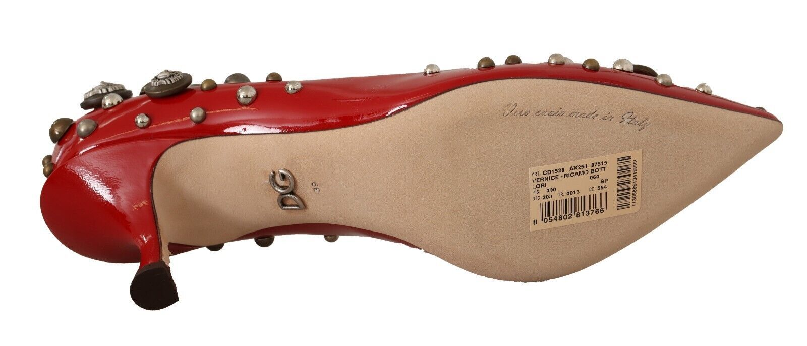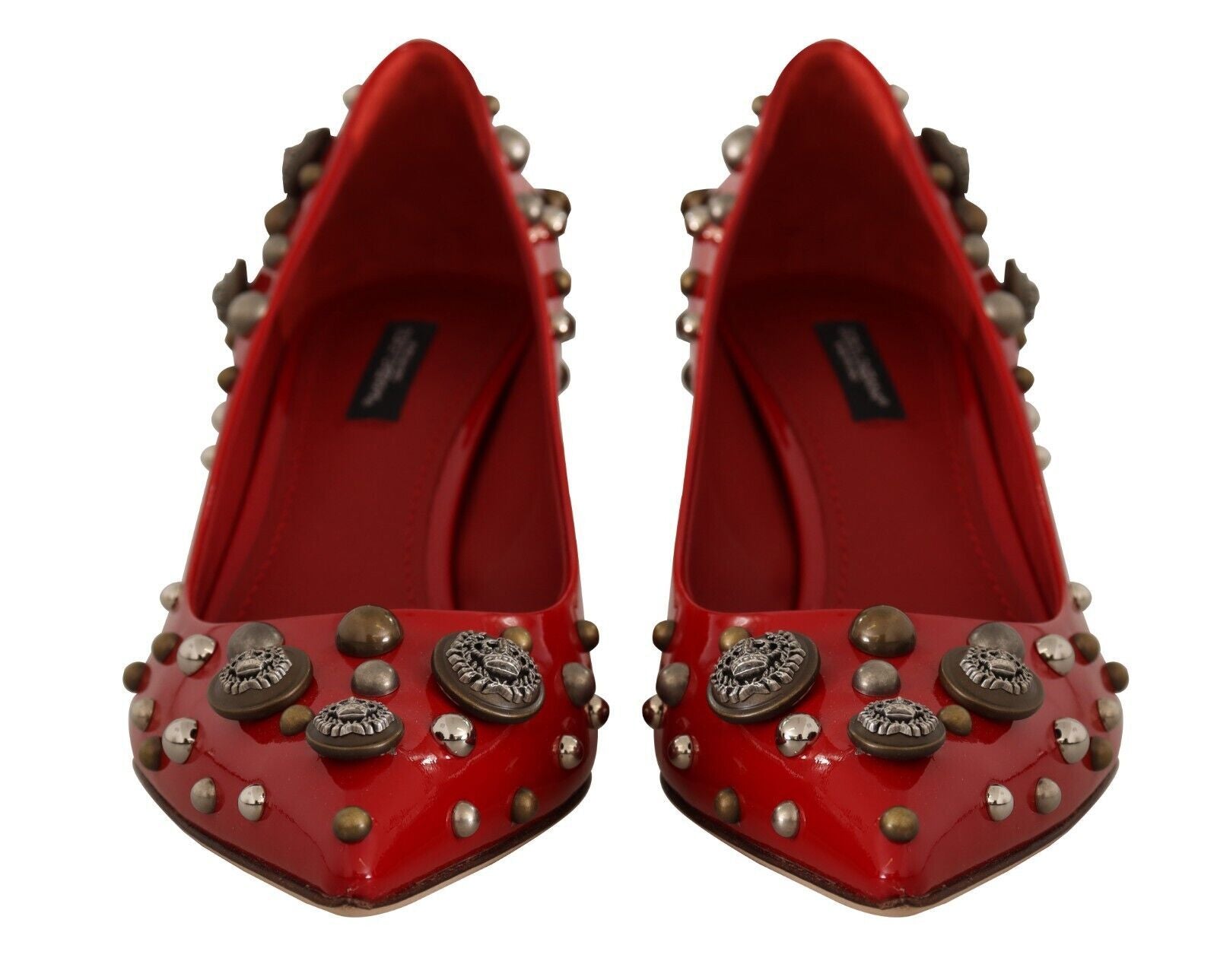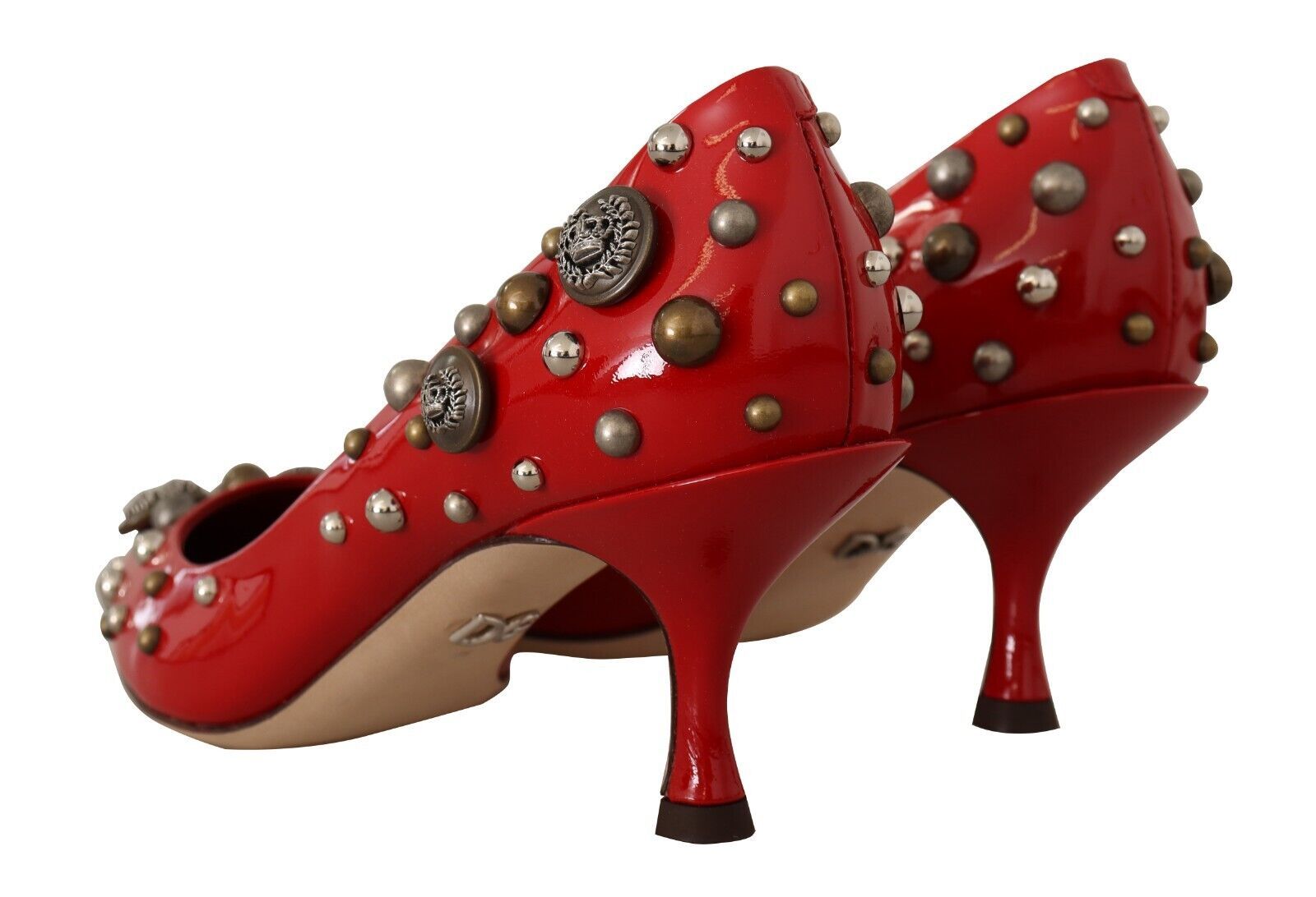Step into luxury with these stunning, brand new with tags pumps from Dolce & Gabbana. Impeccably crafted in Italy, these shoes are a statement piece with luxurious patent leather adorned with bold studs. The desirable kitten heels paired with the chic pointed toe design are sure to elevate any ensemble, offering both high-end style and comfort.