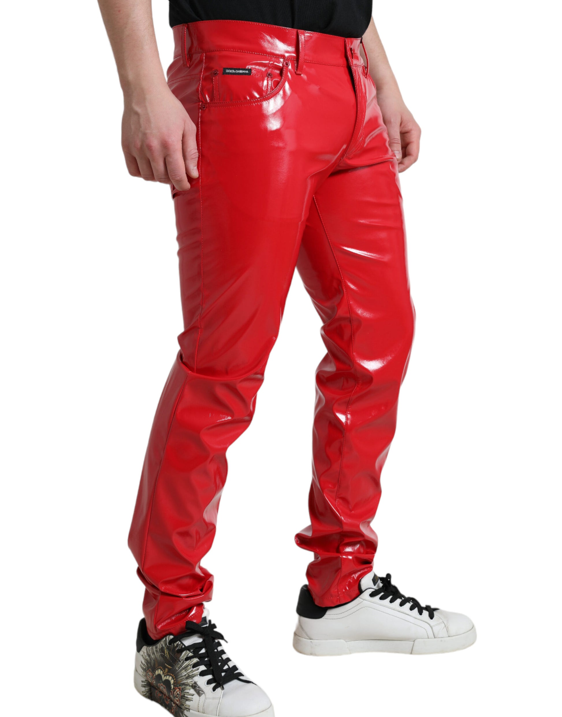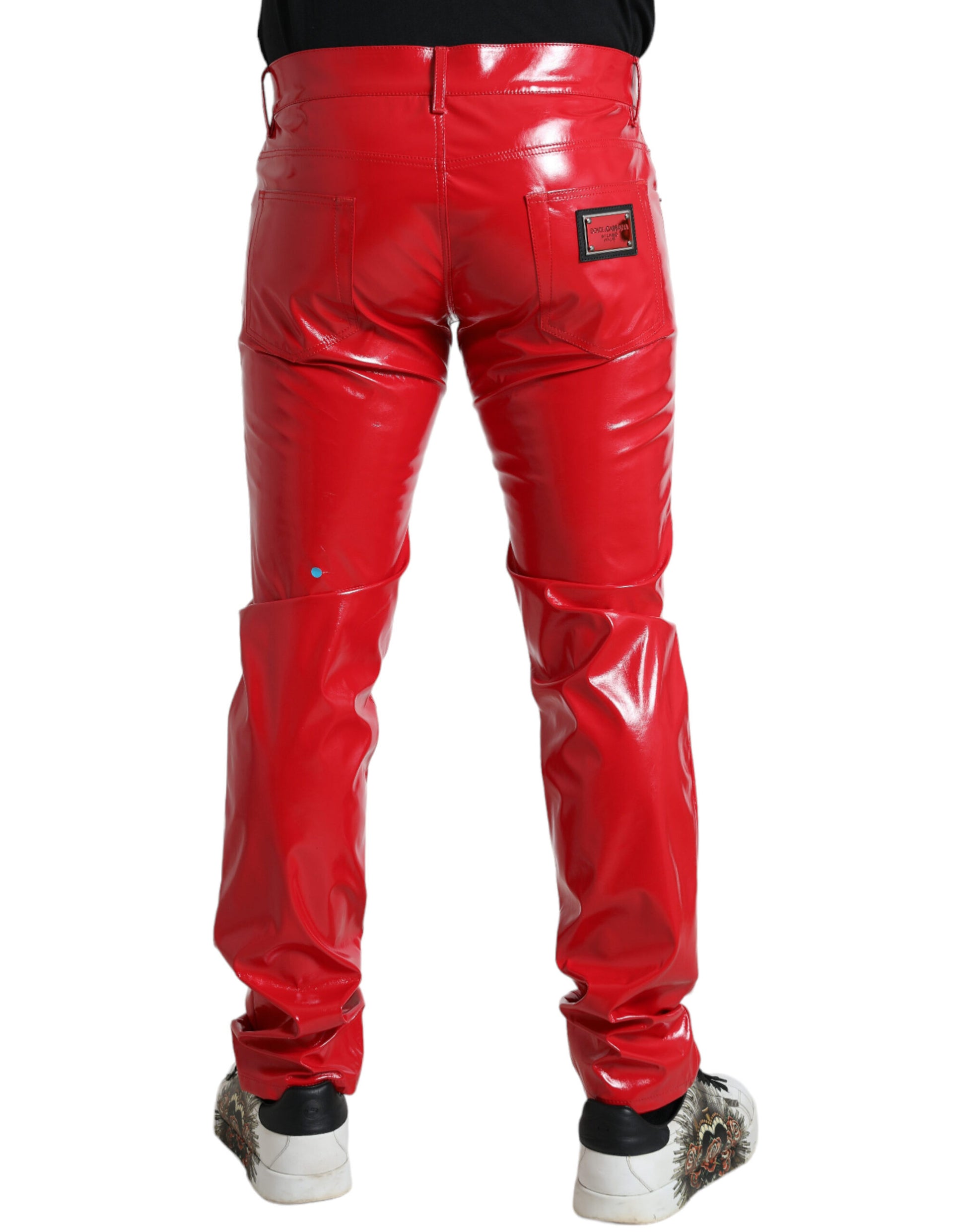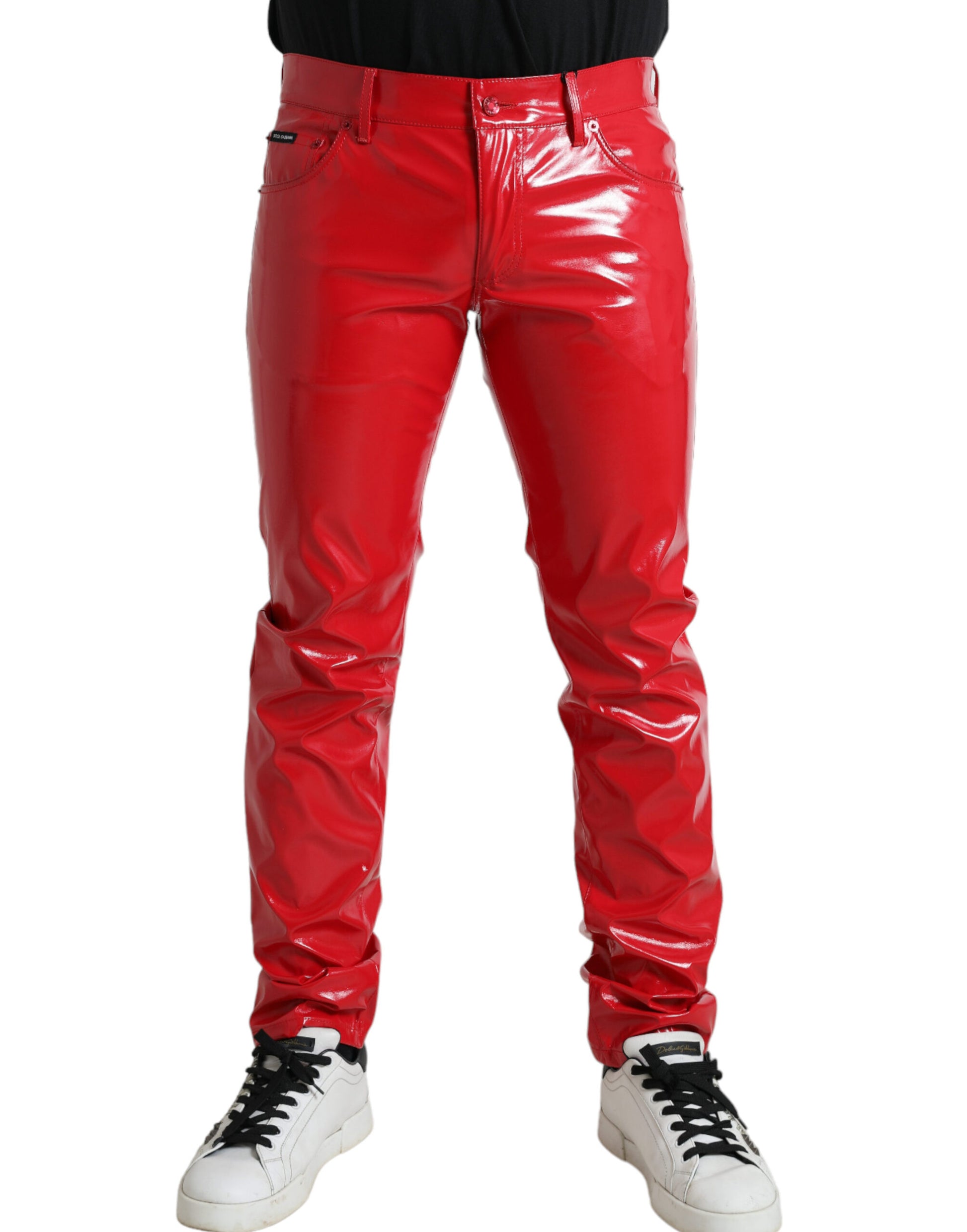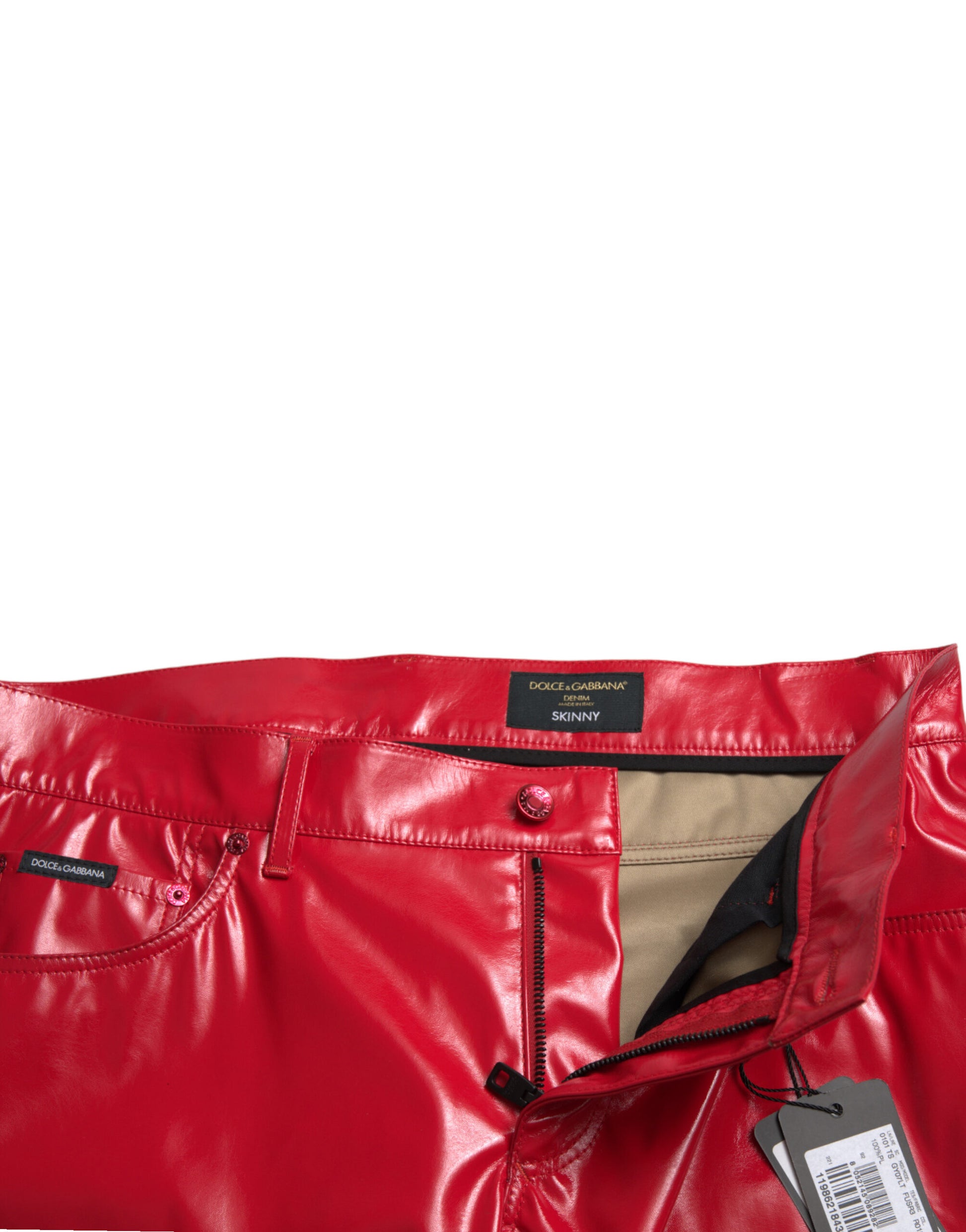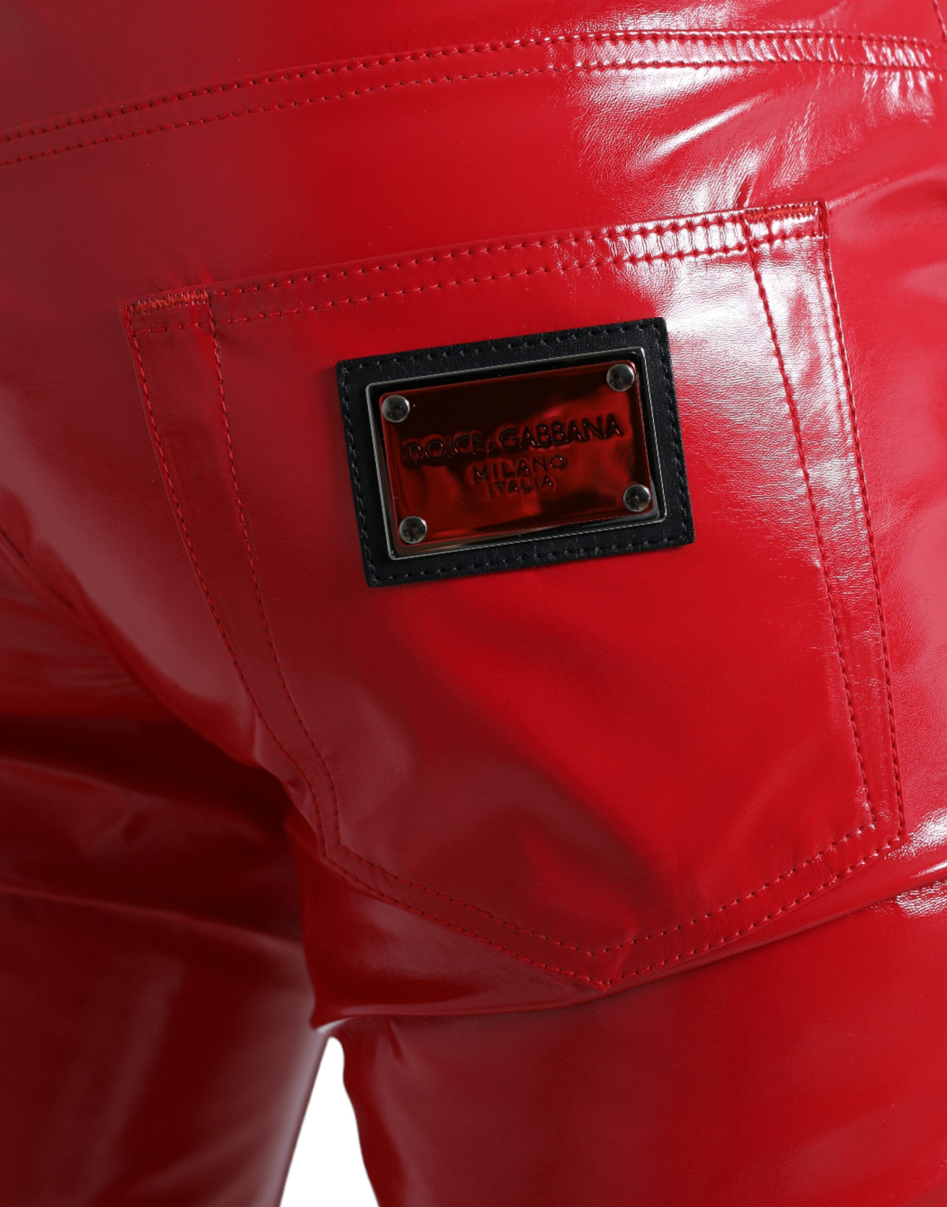 Step out in style with these striking glossy red skinny pants, perfect for adding a pop of color and sophistication to your wardrobe. These pants are brand new, complete with tags, and embody the luxurious essence that Dolce & Gabbana is renowned for. Designed in Italy, they’re crafted with utmost attention to detail, featuring a clean zipper and button closure. Adorned with subtle logo details, they are an epitome of high-end fashion.