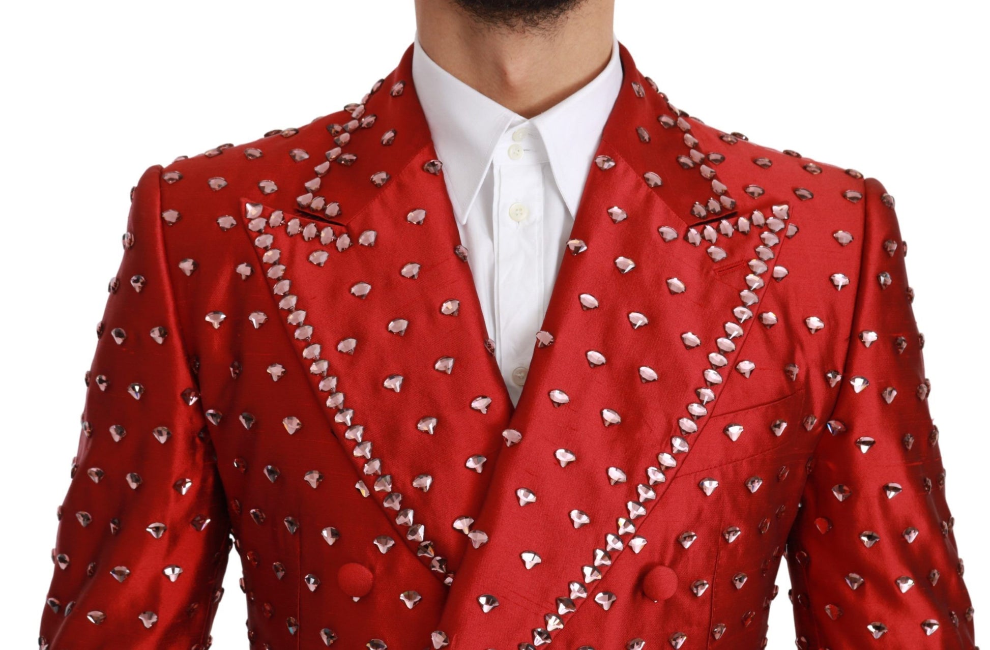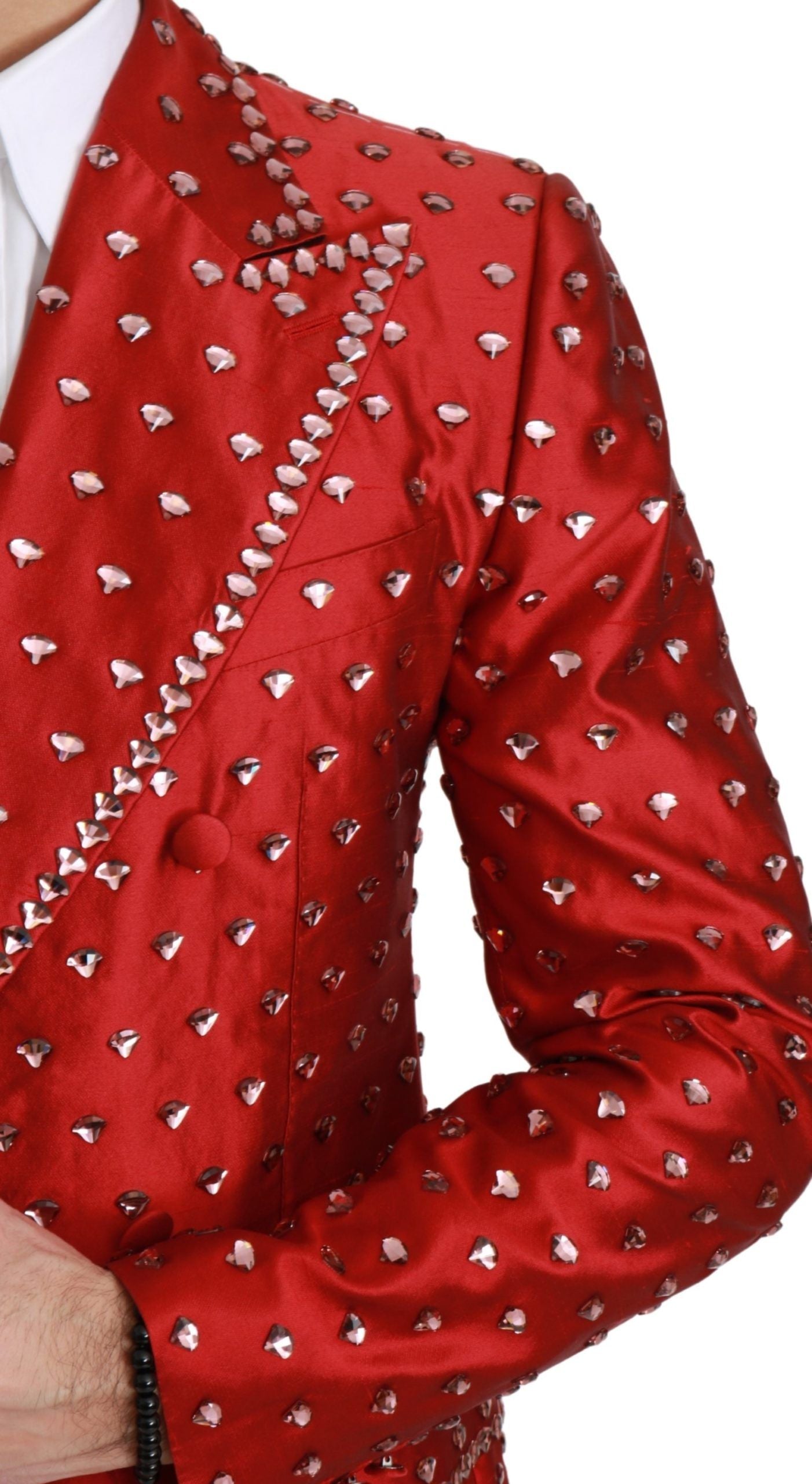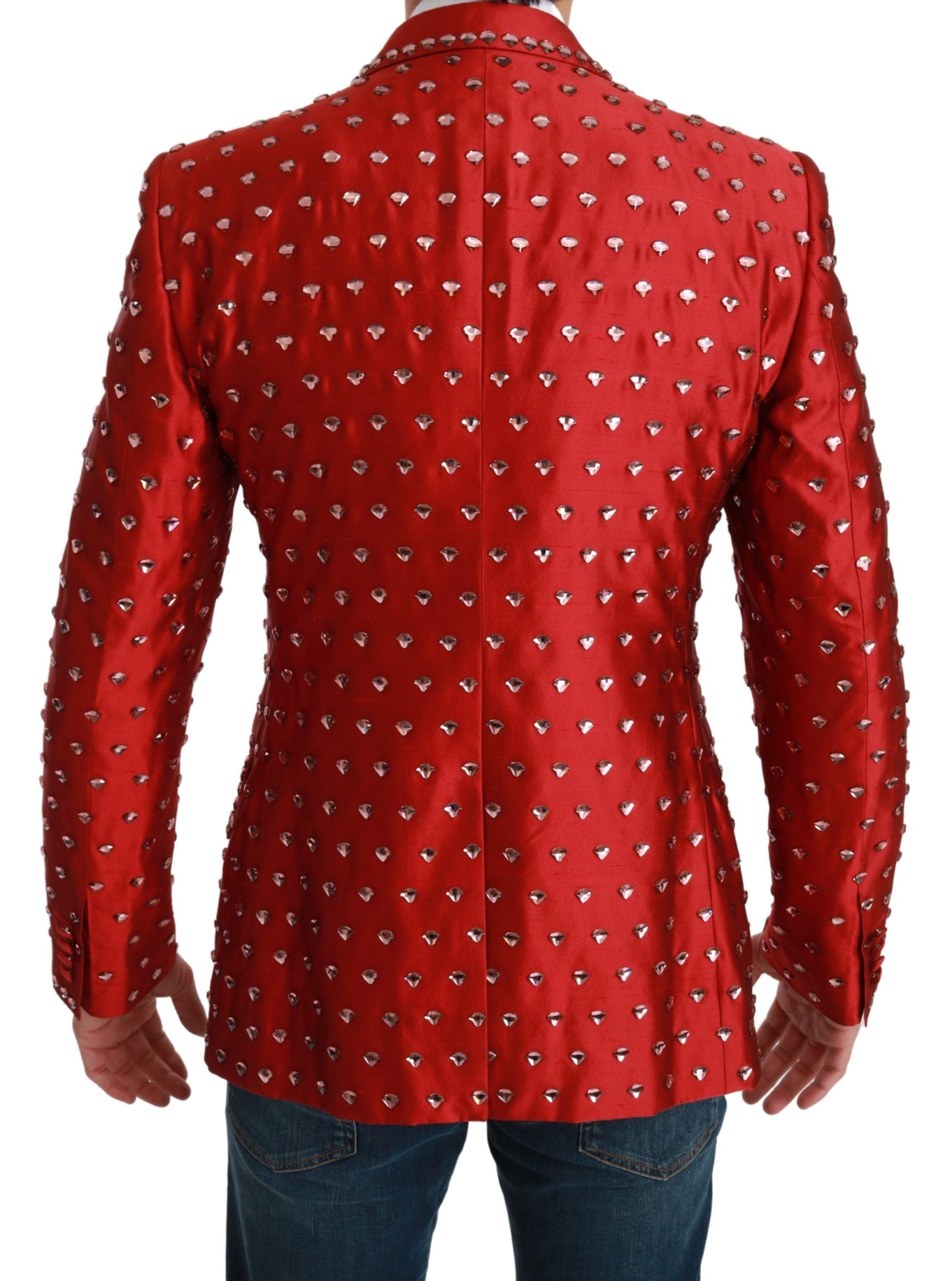 Step out in style with this stunning, 100% authentic red silk blazer by Dolce & Gabbana. This slim fit, double-breasted formal jacket is brand new with tags and features exquisite craftsmanship. It boasts a luxurious red silk inner lining for ultimate comfort and sophistication. Detailed with red crystal embellishments, this blazer elevates any ensemble with its Italian flair and exceptional quality. Perfect for formal occasions or making a statement at any event.