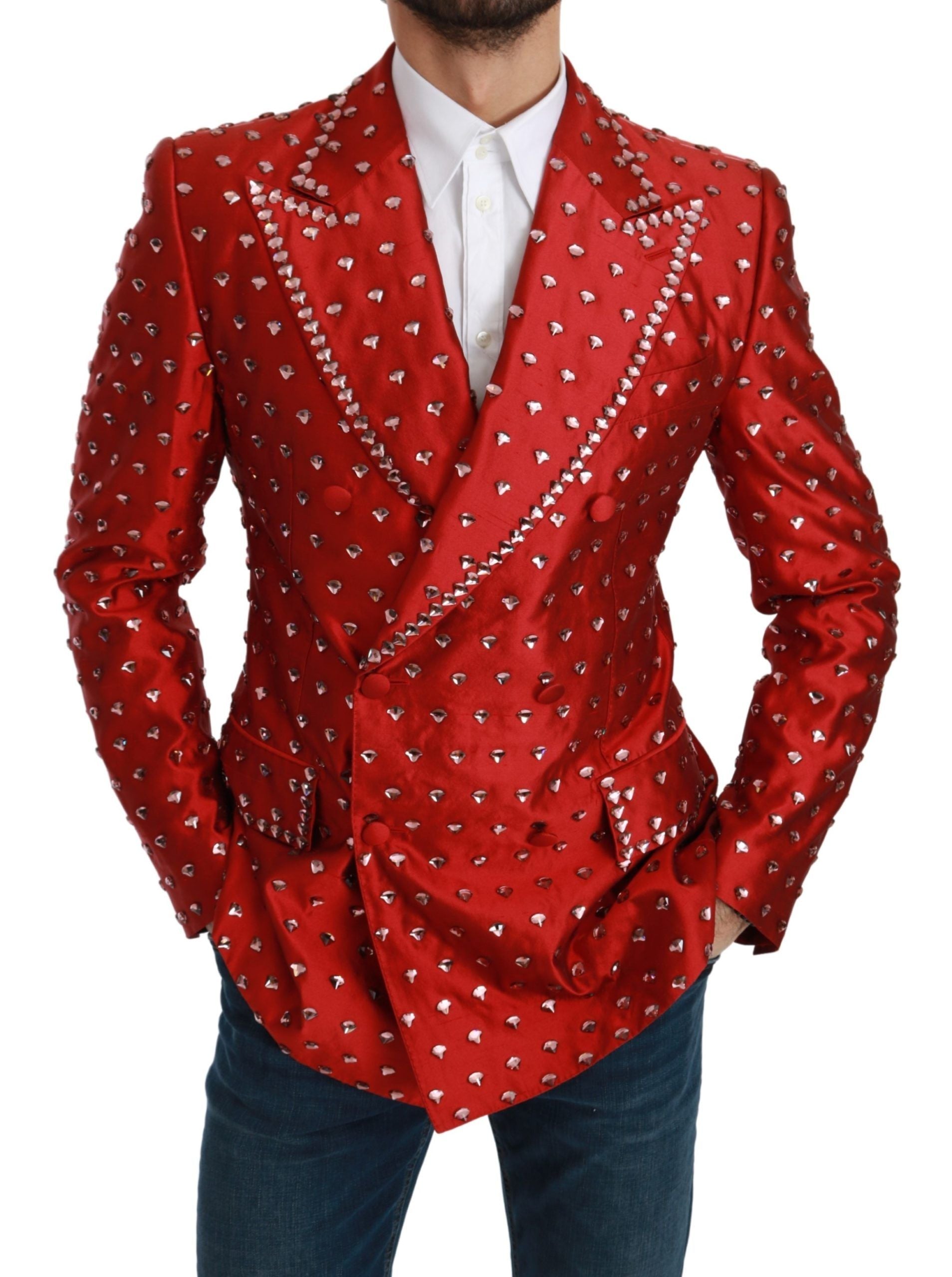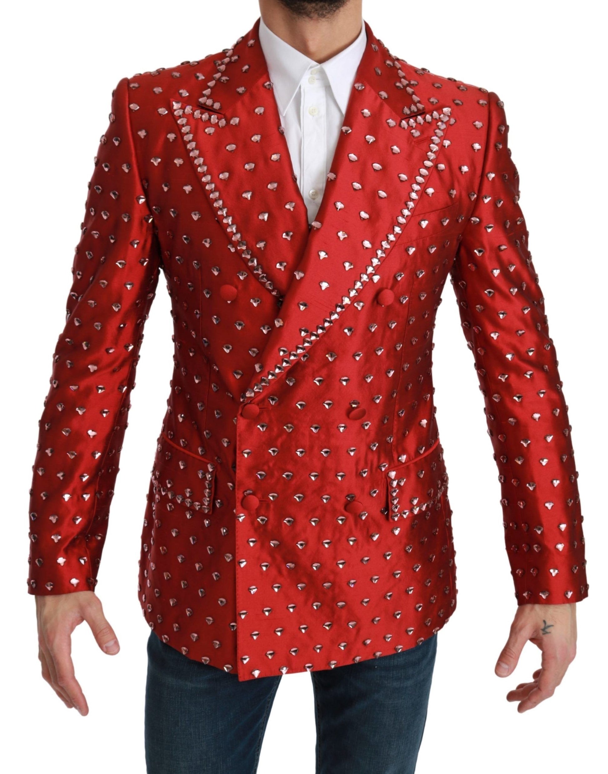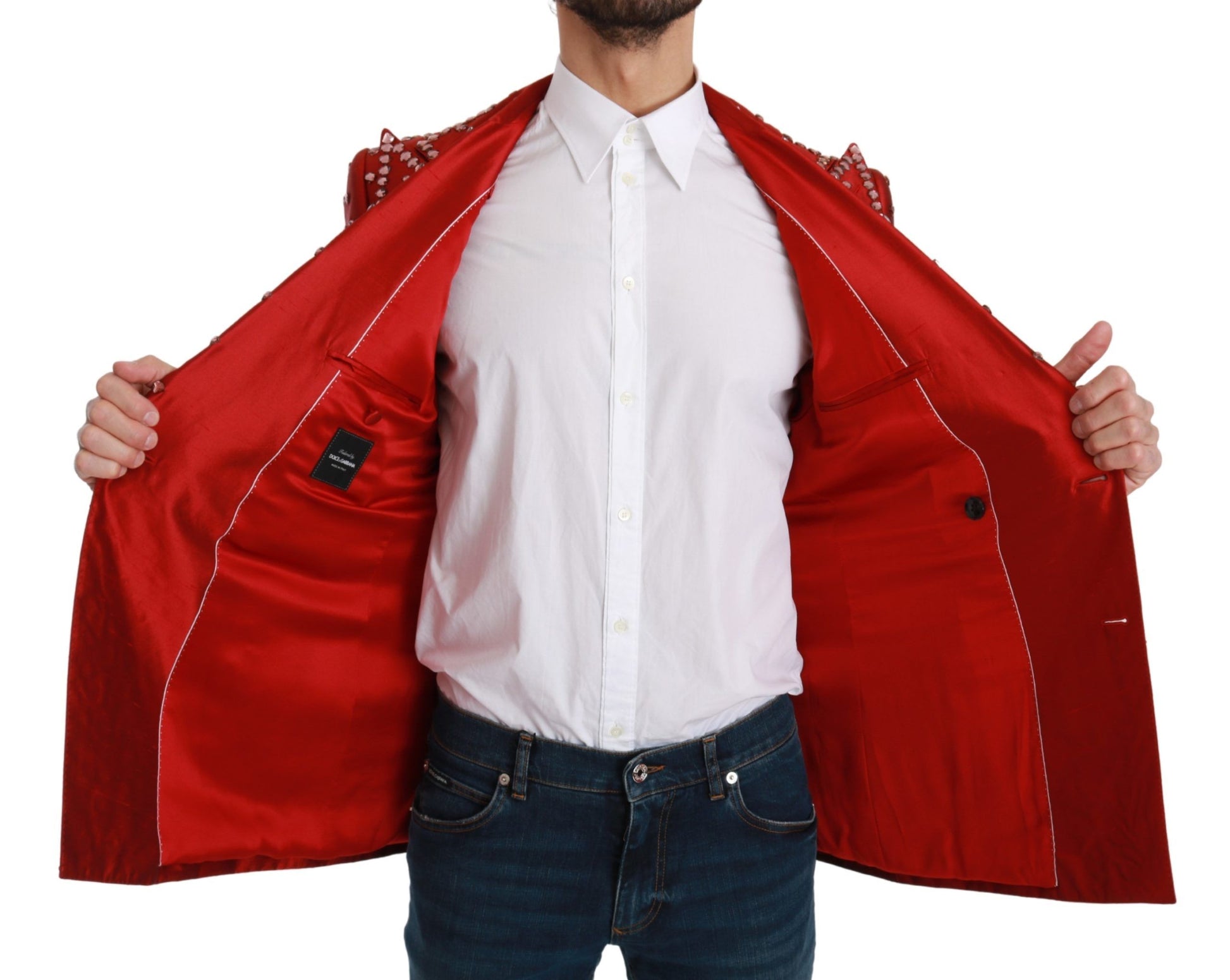 Step out in style with this stunning, 100% authentic red silk blazer by Dolce & Gabbana. This slim fit, double-breasted formal jacket is brand new with tags and features exquisite craftsmanship. It boasts a luxurious red silk inner lining for ultimate comfort and sophistication. Detailed with red crystal embellishments, this blazer elevates any ensemble with its Italian flair and exceptional quality. Perfect for formal occasions or making a statement at any event.