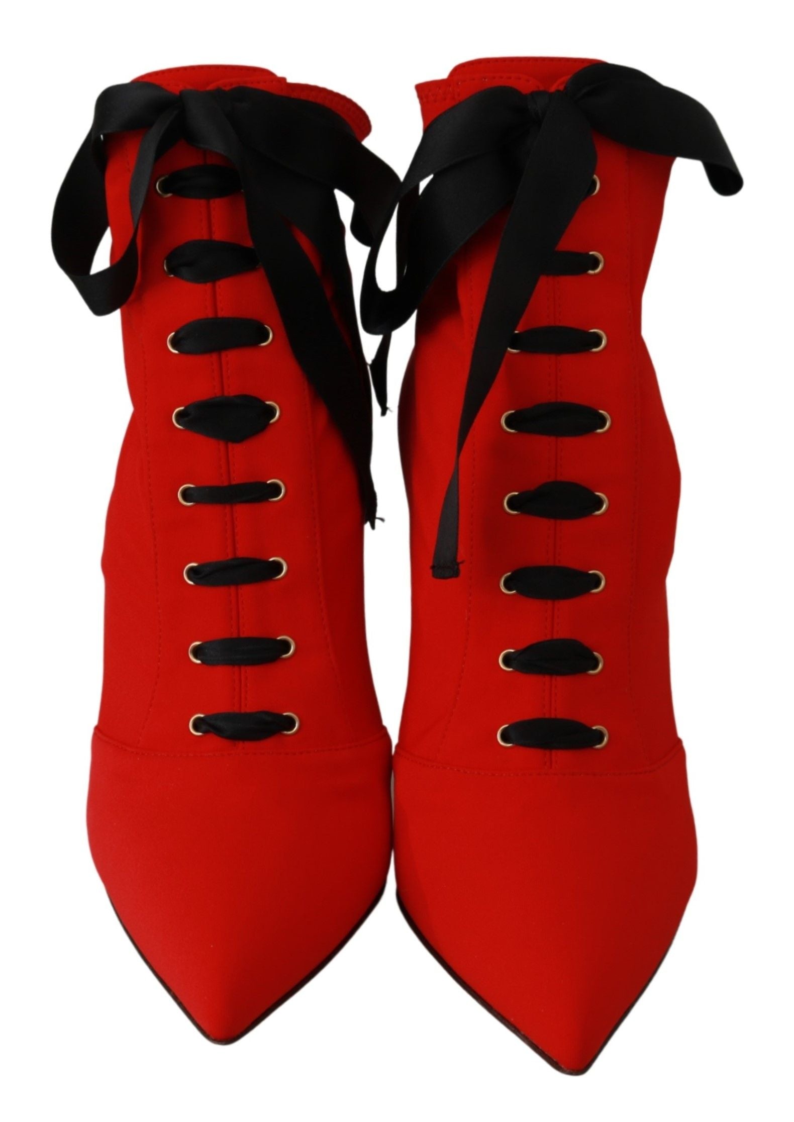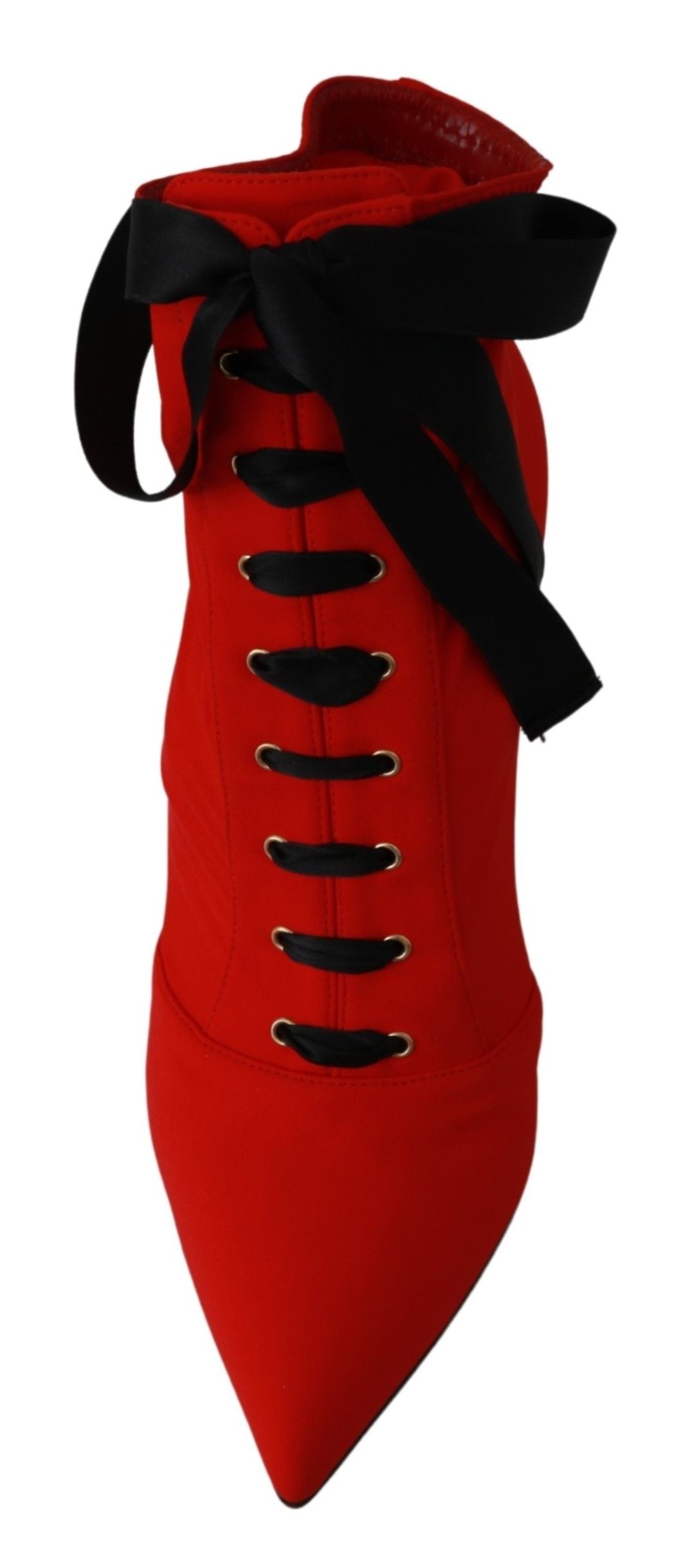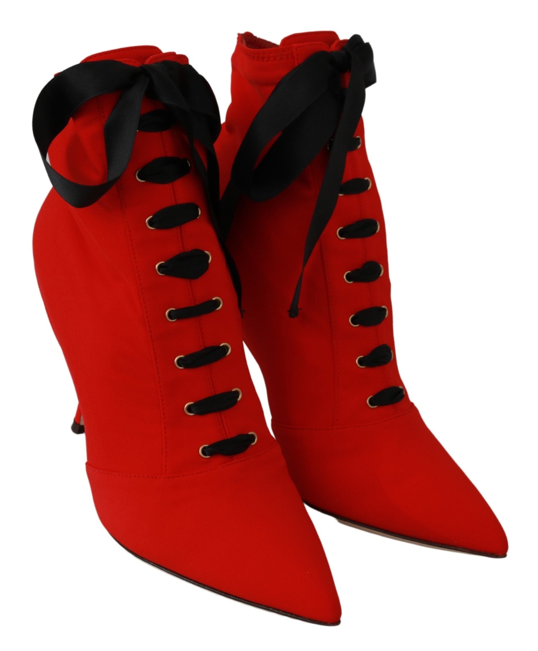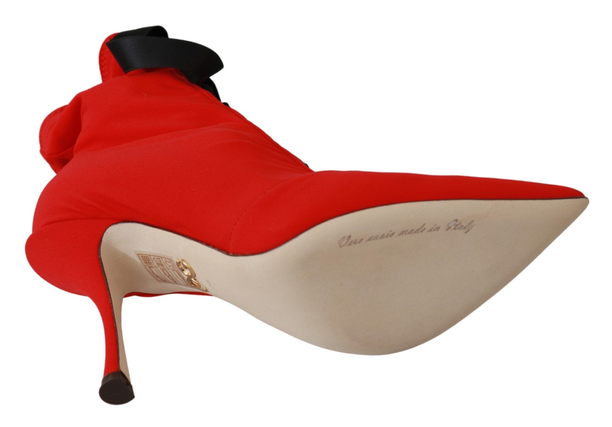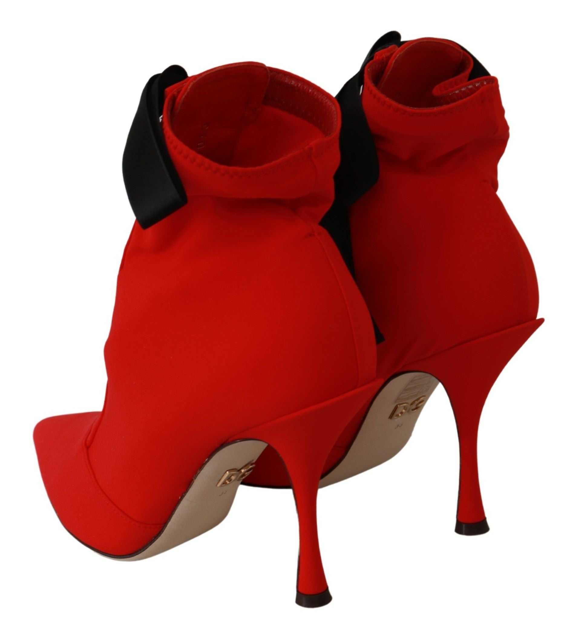 Step out in style with these exquisite red bootie pumps by Dolce & Gabbana . Perfect for any high-fashion ensemble, these stunning heels are crafted from a spandex elastane polyester mix, ensuring a comfortable yet chic fit that molds to your feet. Complete with a sophisticated leather sole and the iconic Dolce & Gabbana logo details, these shoes are a true statement of luxury and craftsmanship straight from Italy.