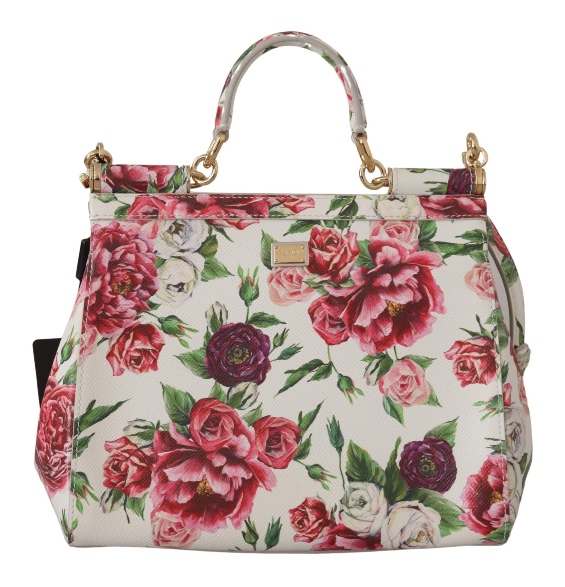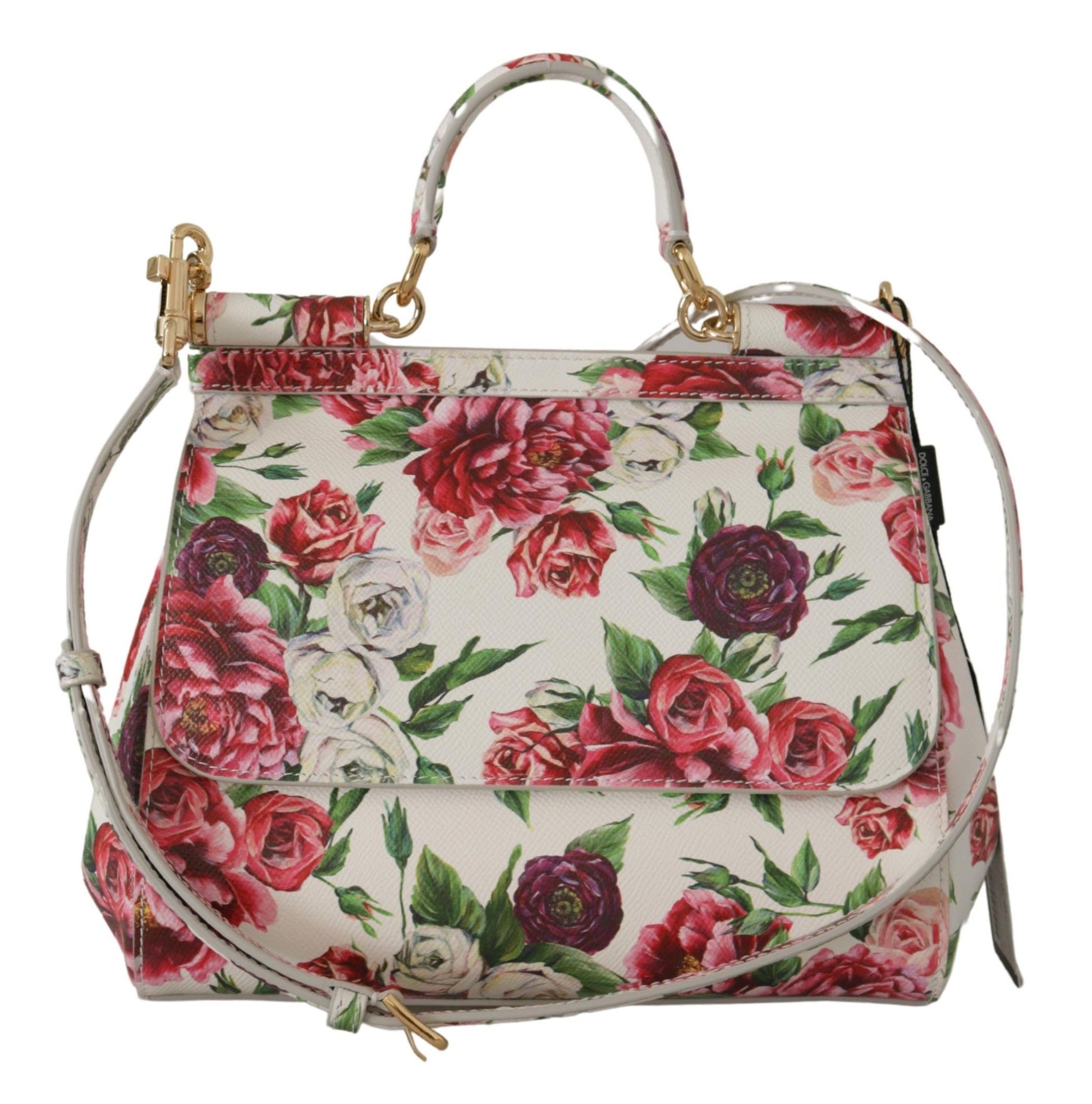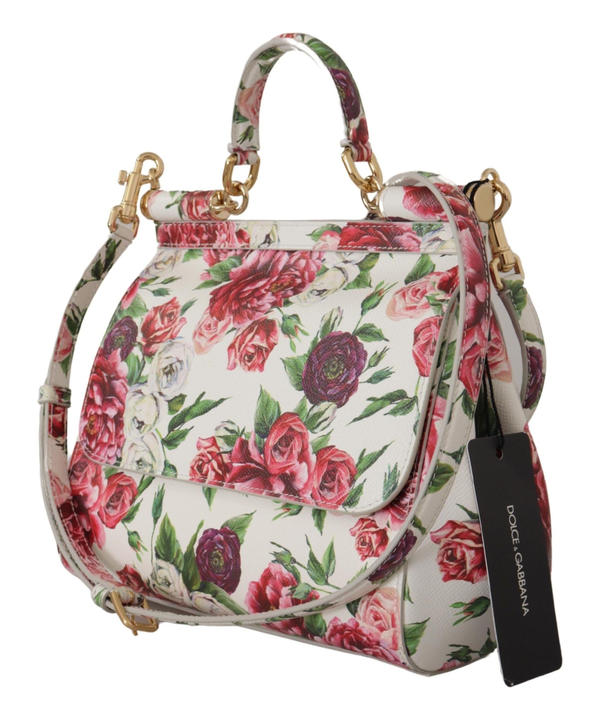 Exquisite Floral Elegance Leather Shoulder Bag – A statement piece imbued with the luxury and craftsmanship Dolce & Gabbana is renowned for. This stunning accessory boasts a vibrant multicolor floral roses print, accented by lustrous gold metal details. The iconic SICILY model is not only a sight to behold but also a masterpiece of functional design with its convenient magnetic flap closure, internal slot, and versatile carrying options courtesy of its handle and adjustable, detachable shoulder strap. The elegant blue inner lining provides a subtle contrast, ensuring your belongings are cradled in style. Crafted with meticulous attention to detail in Italy, this medium-sized bag is the epitome of fashion-meets-function.