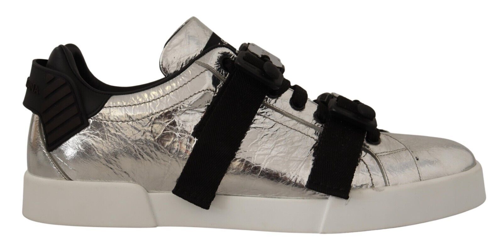 Step into luxury and style with these 100% Authentic sneakers from Dolce & Gabbana. These black and silver low top casual sneakers are a testament to Italian craftsmanship, perfect for adding a touch of elegance to your footwear collection. The sleek leather construction pairs with a lace and buckle strap closure for a secure and stylish fit. Finished with the iconic logo detail and set on a durable rubber sole, they are as practical as they are fashionable. A must-have for any fashion-forward individual.