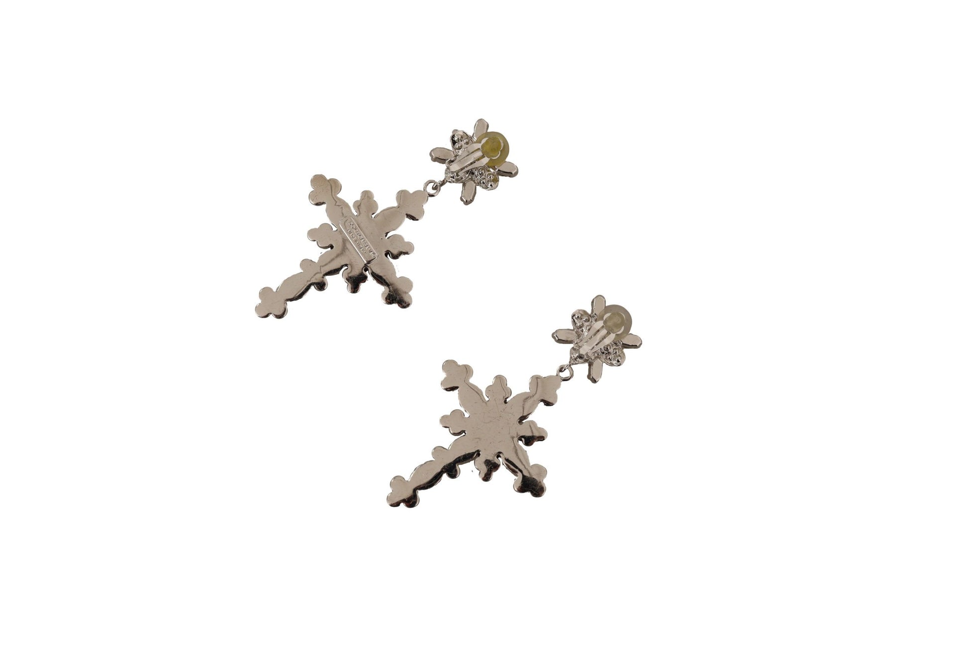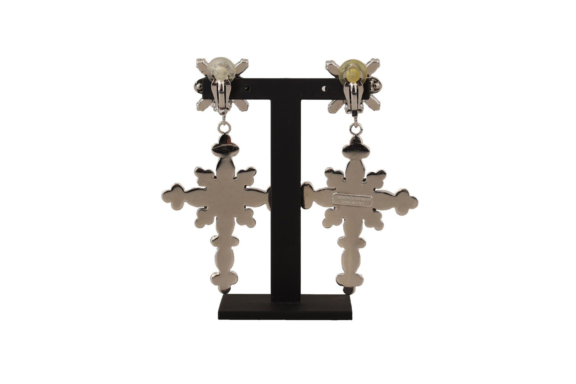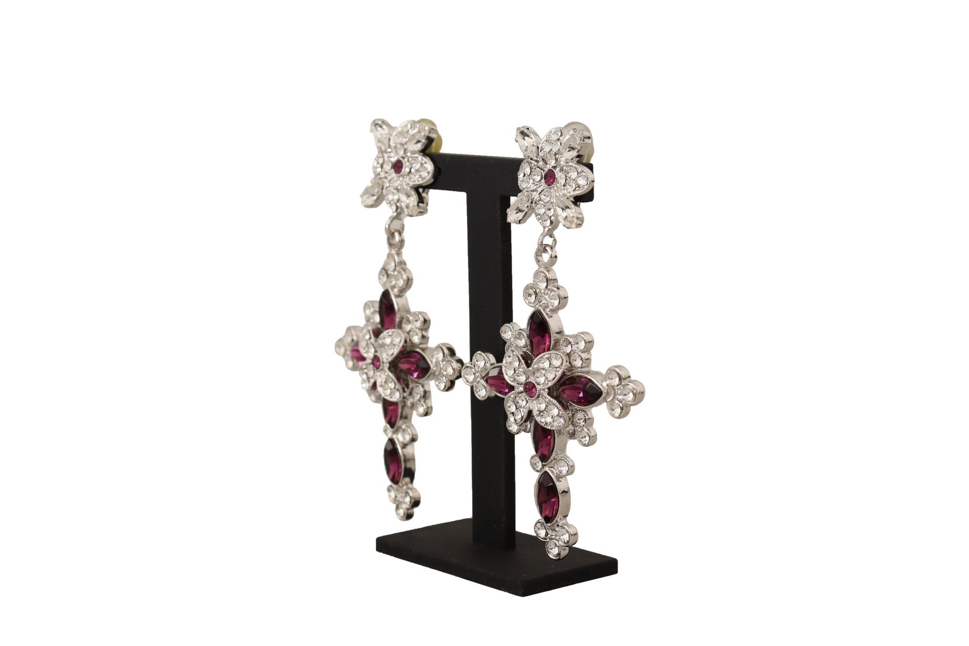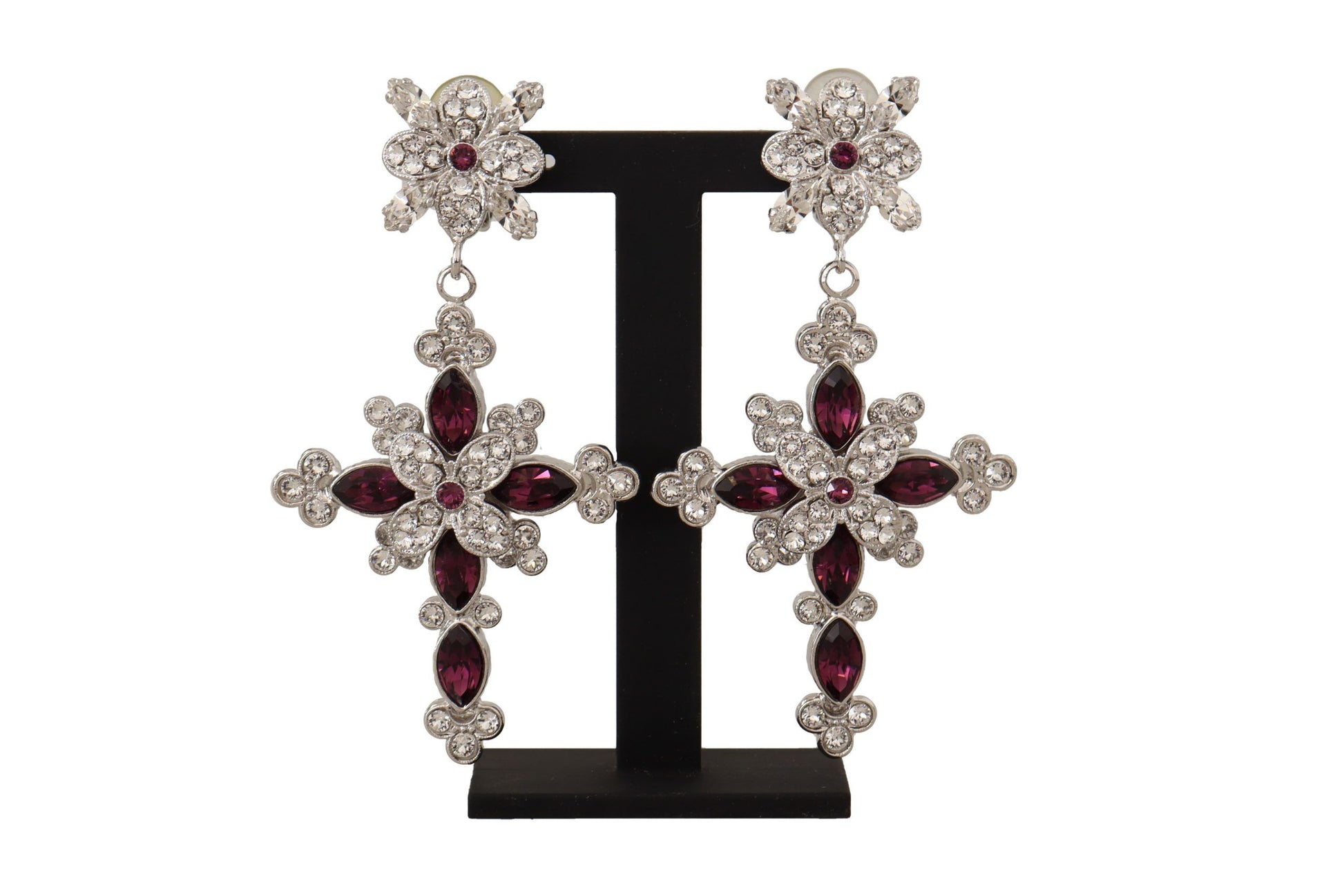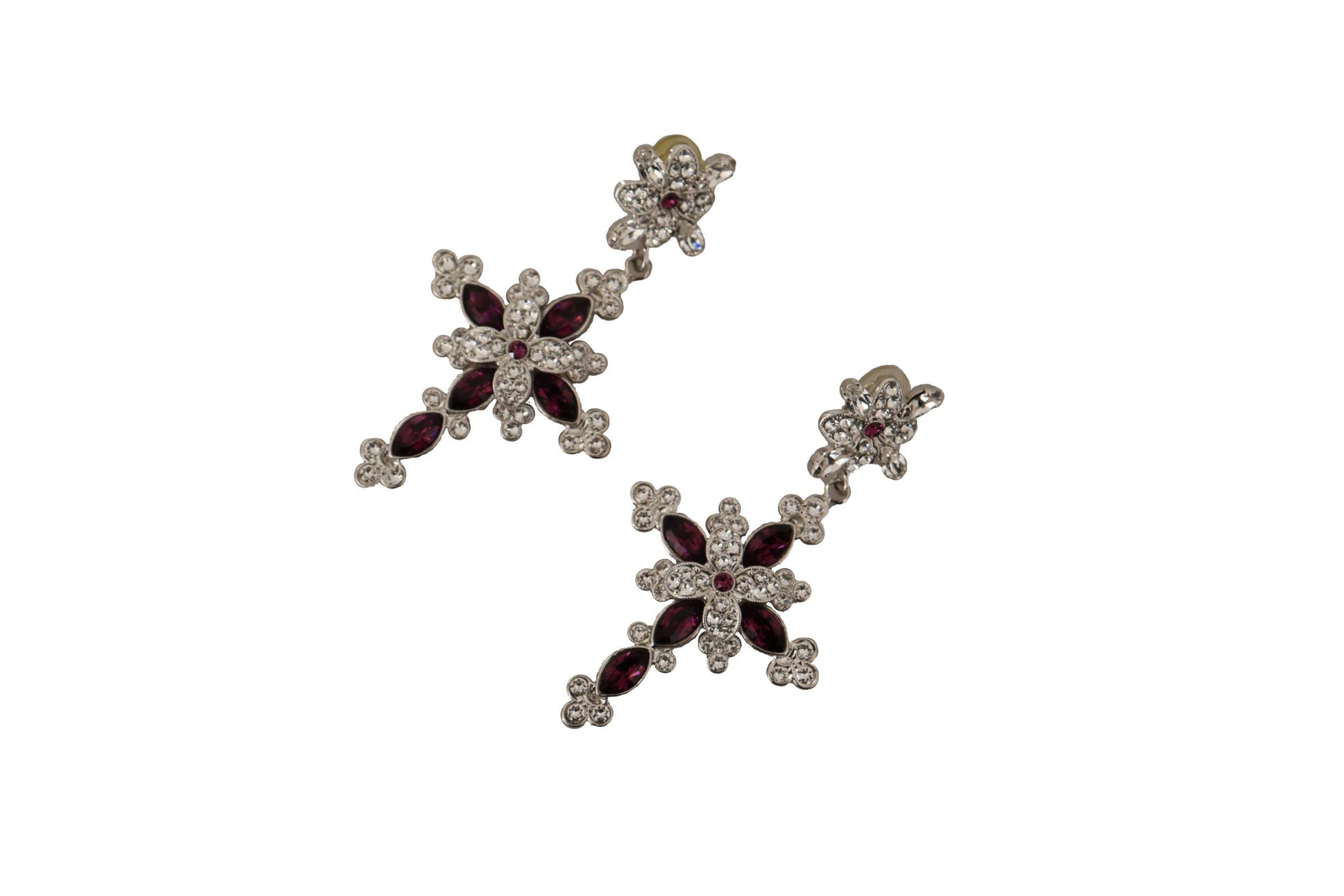 Indulge in the divine elegance of these Gorgeous brand new, 100% Authentic Dolce & Gabbana dangling cross earrings. These clip-on earrings add a touch of grace and sophistication to any ensemble. With exquisite silver color, adorned with clear and purple crystals, they ensure an opulent sparkle from every angle. Logo details attest to the exclusive design, all Made in Italy, providing an epitome of luxury for those special occasions.