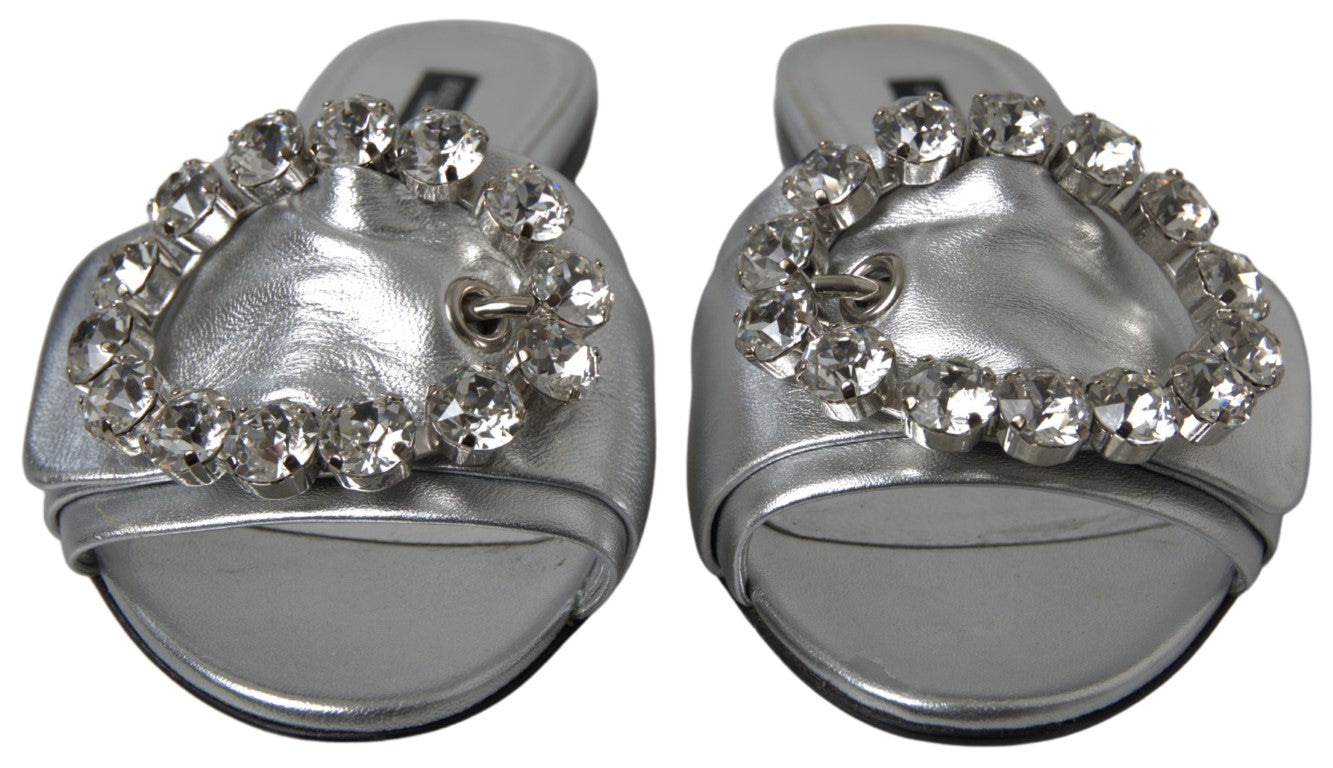 Step into luxury with these stunning, brand new slides, exquisitely crafted by Dolce & Gabbana. Featuring a dazzling crystal embellishment set against sumptuous silver leather, these flats are sure to add a touch of glamour to any ensemble. Designed in Italy, these shoes are a testament to chic elegance and unparalleled craftsmanship. Perfect for those who demand both comfort and style in their stride.
