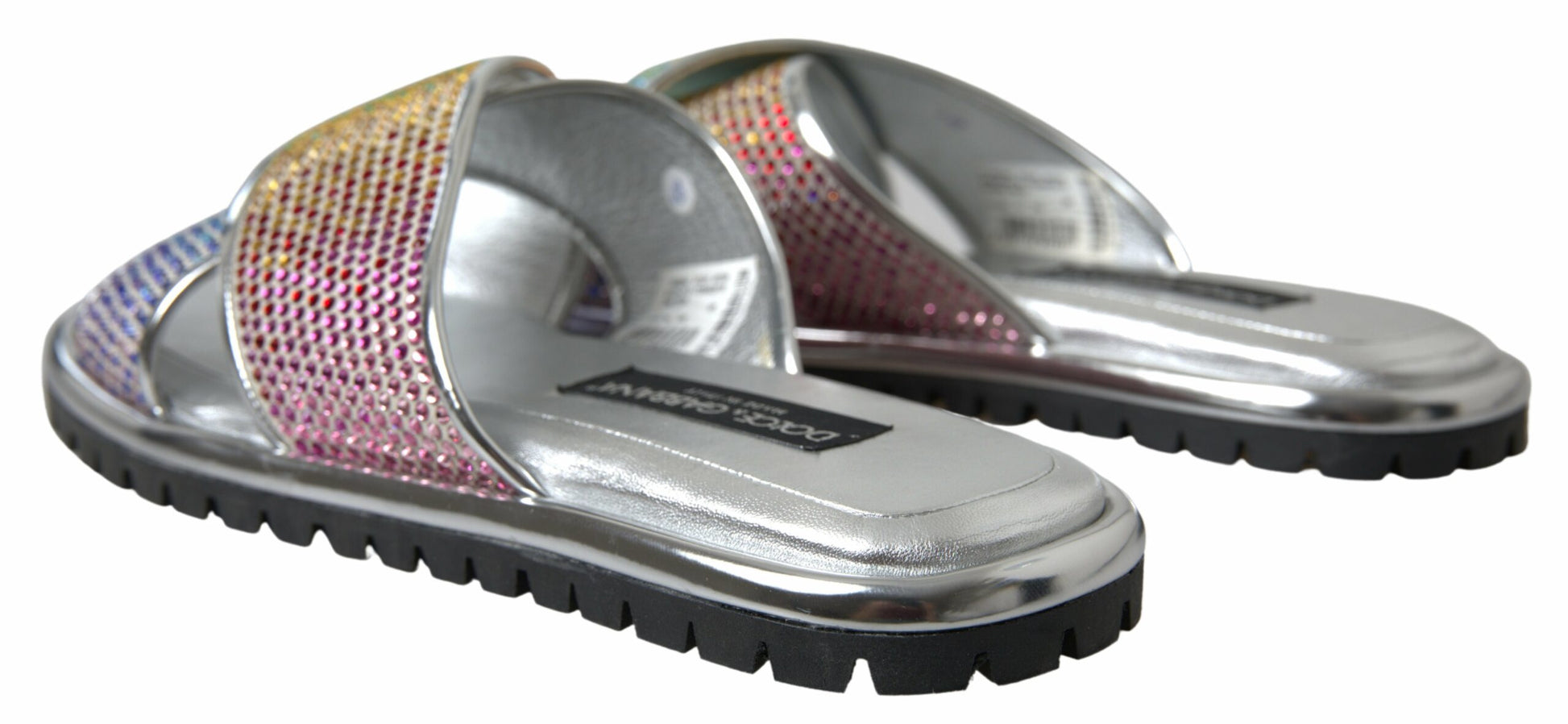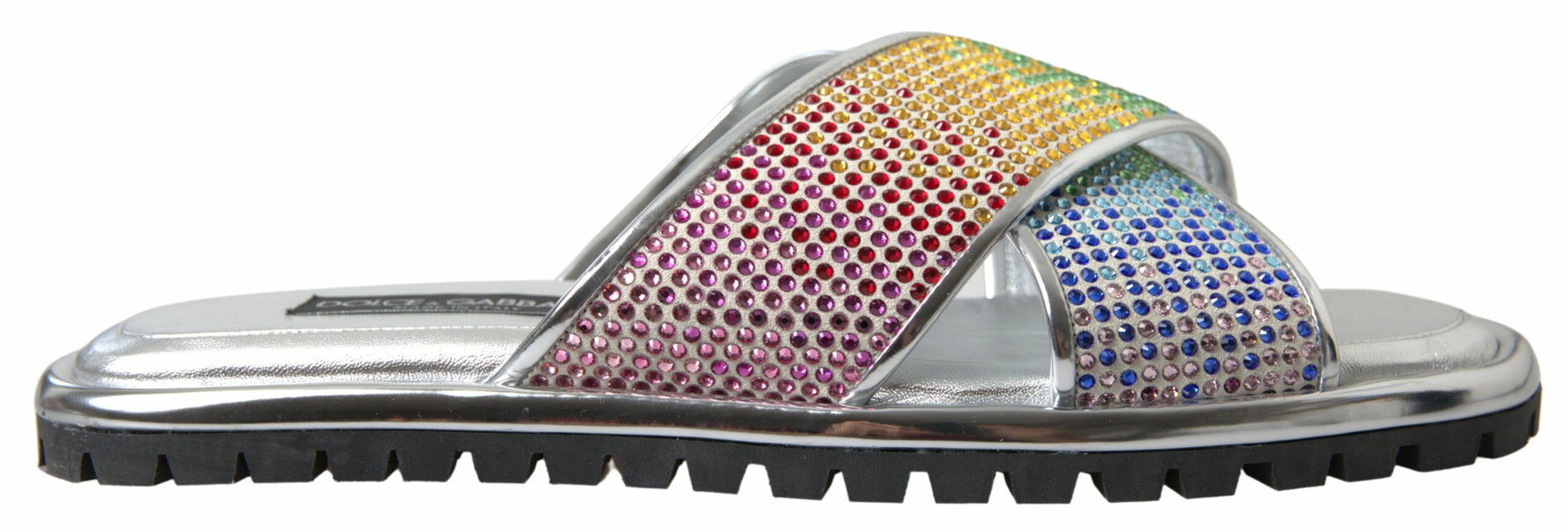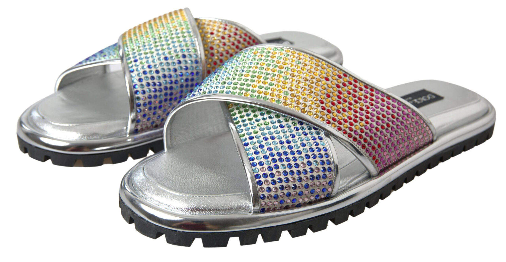 Step into luxury with these exquisite Dolce & Gabbana silver-tone slides, designed for those who appreciate elegance and comfort. Adorned with dazzling rhinestones and crafted with a blend of premium skins, these sandals embody the brand’s renowned Italian craftsmanship. The thoughtful rubber sole ensures a soft and safe tread, making these slides a splendid addition to your refined footwear collection.