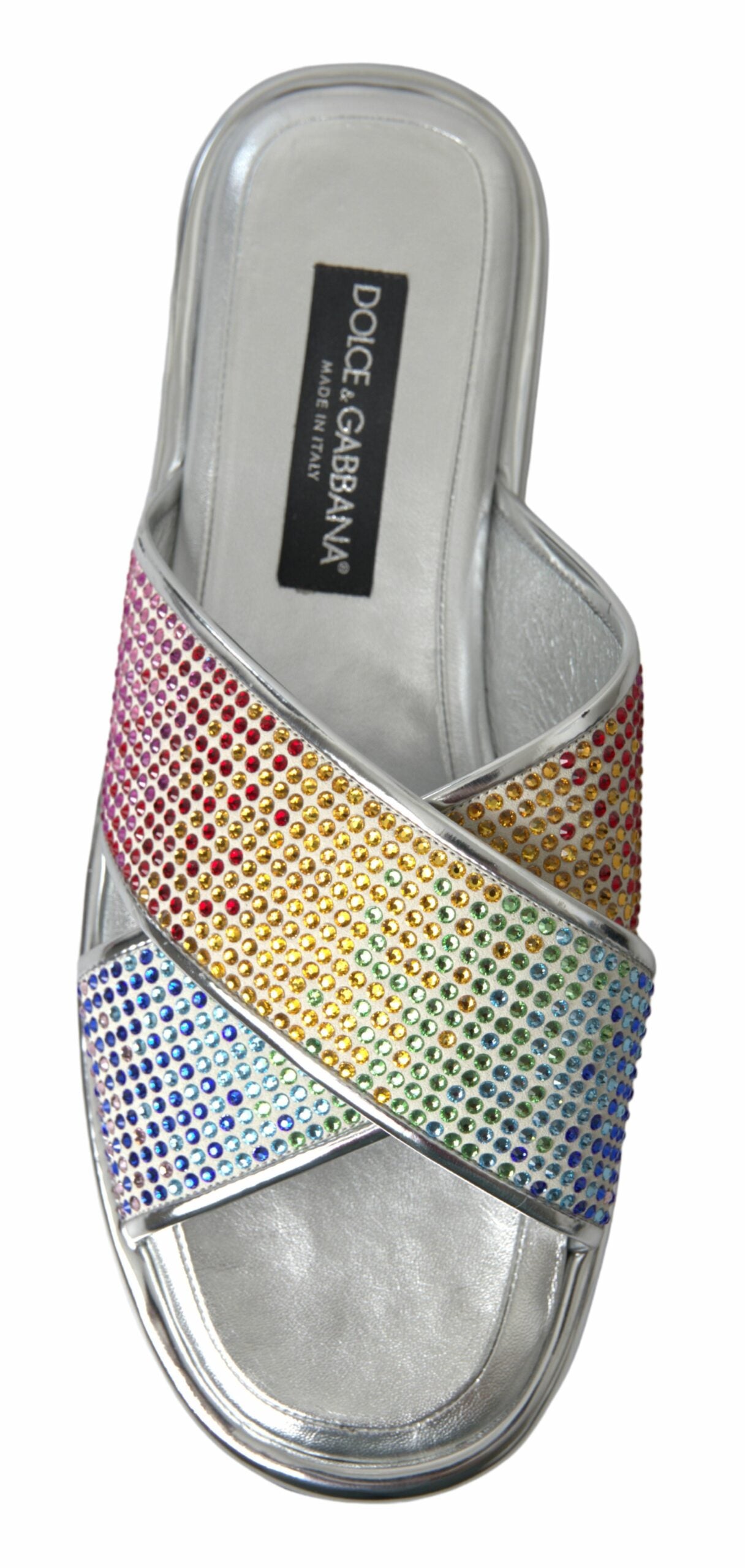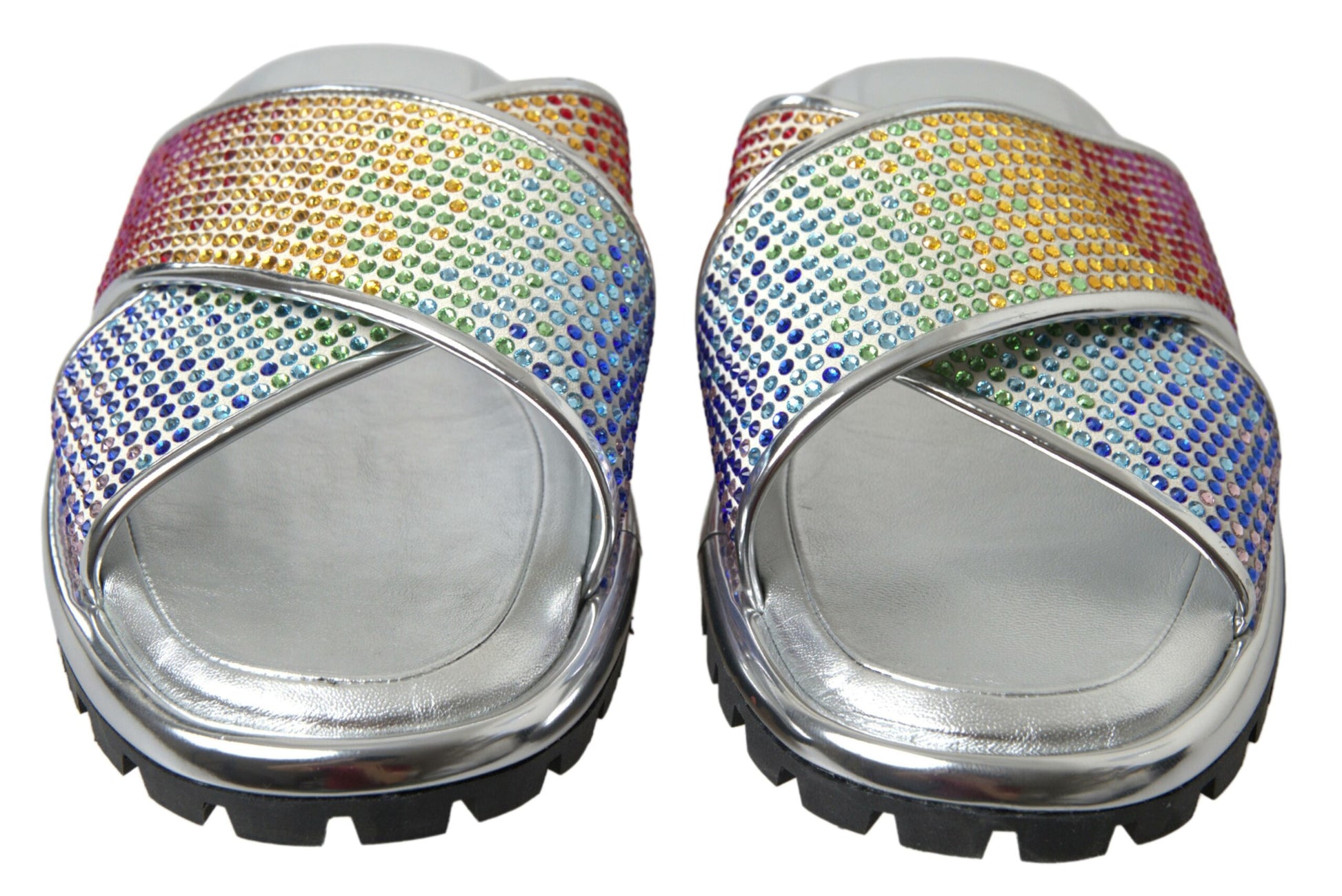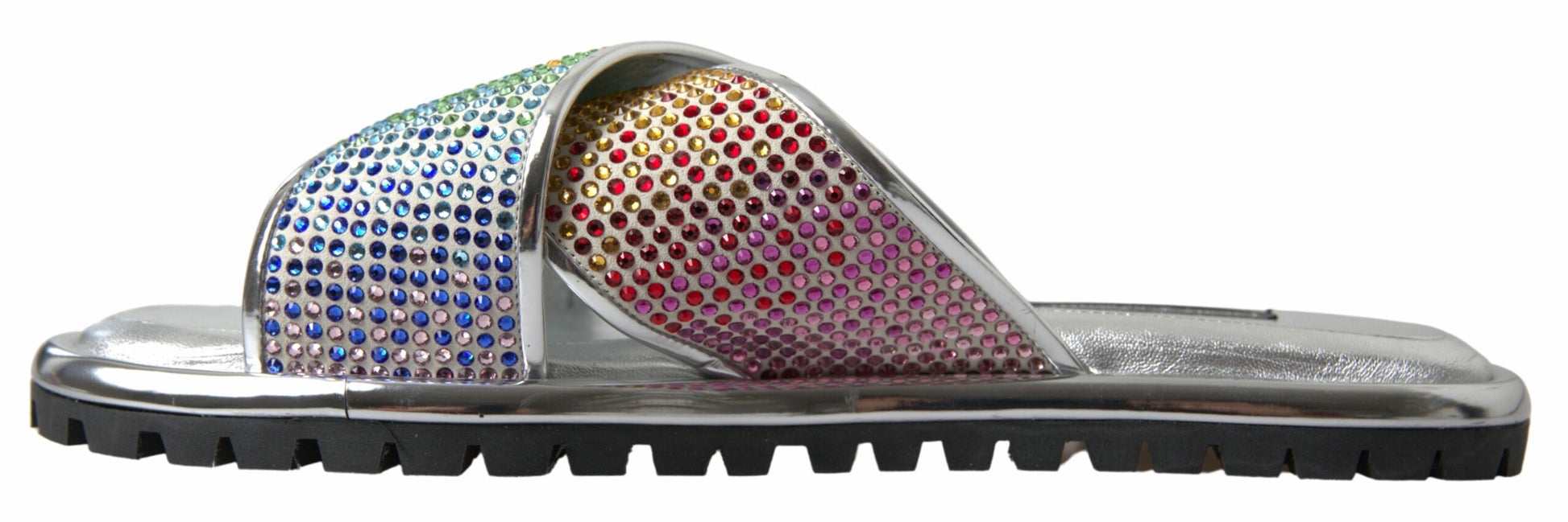 Step into luxury with these exquisite Dolce & Gabbana silver-tone slides, designed for those who appreciate elegance and comfort. Adorned with dazzling rhinestones and crafted with a blend of premium skins, these sandals embody the brand’s renowned Italian craftsmanship. The thoughtful rubber sole ensures a soft and safe tread, making these slides a splendid addition to your refined footwear collection.