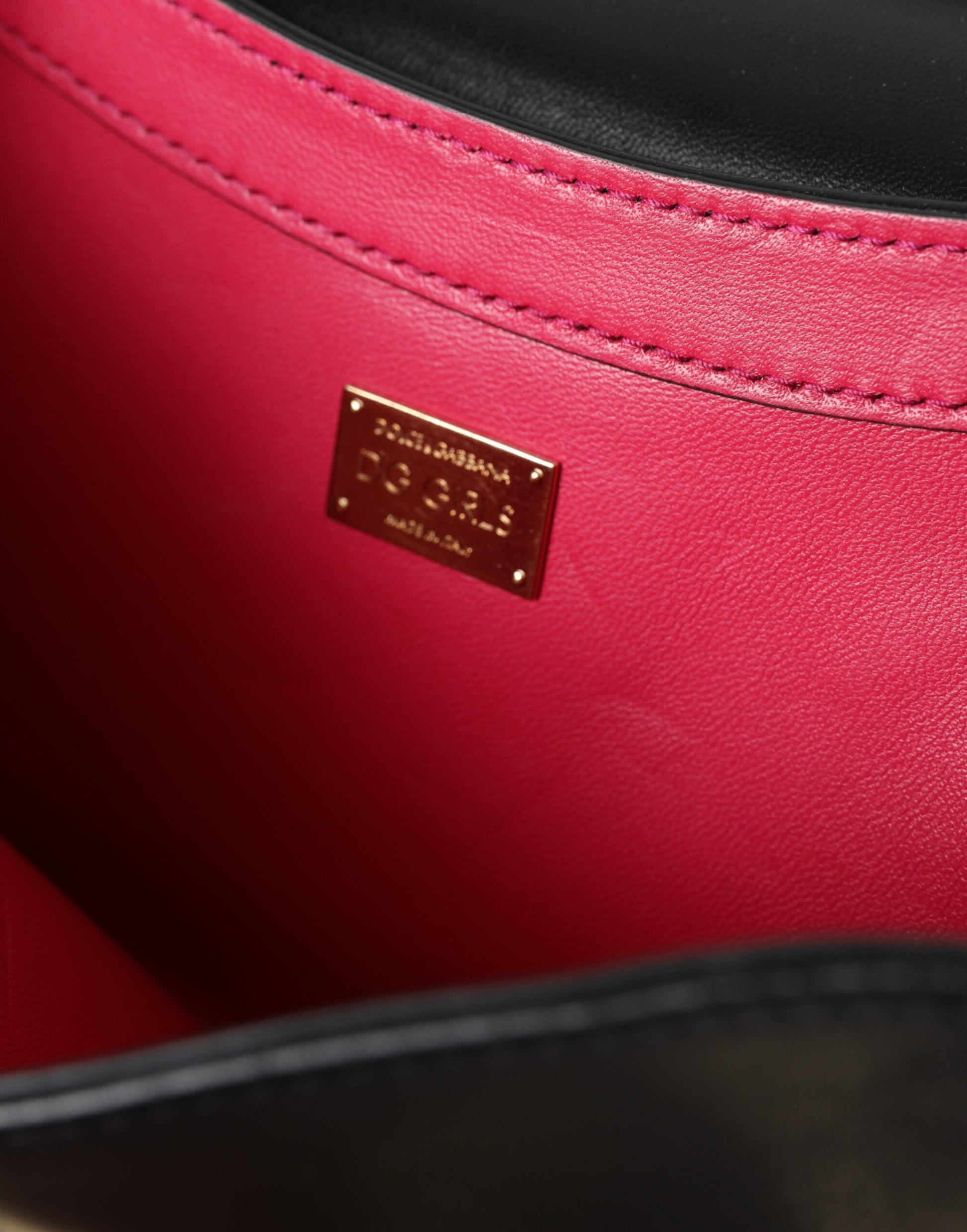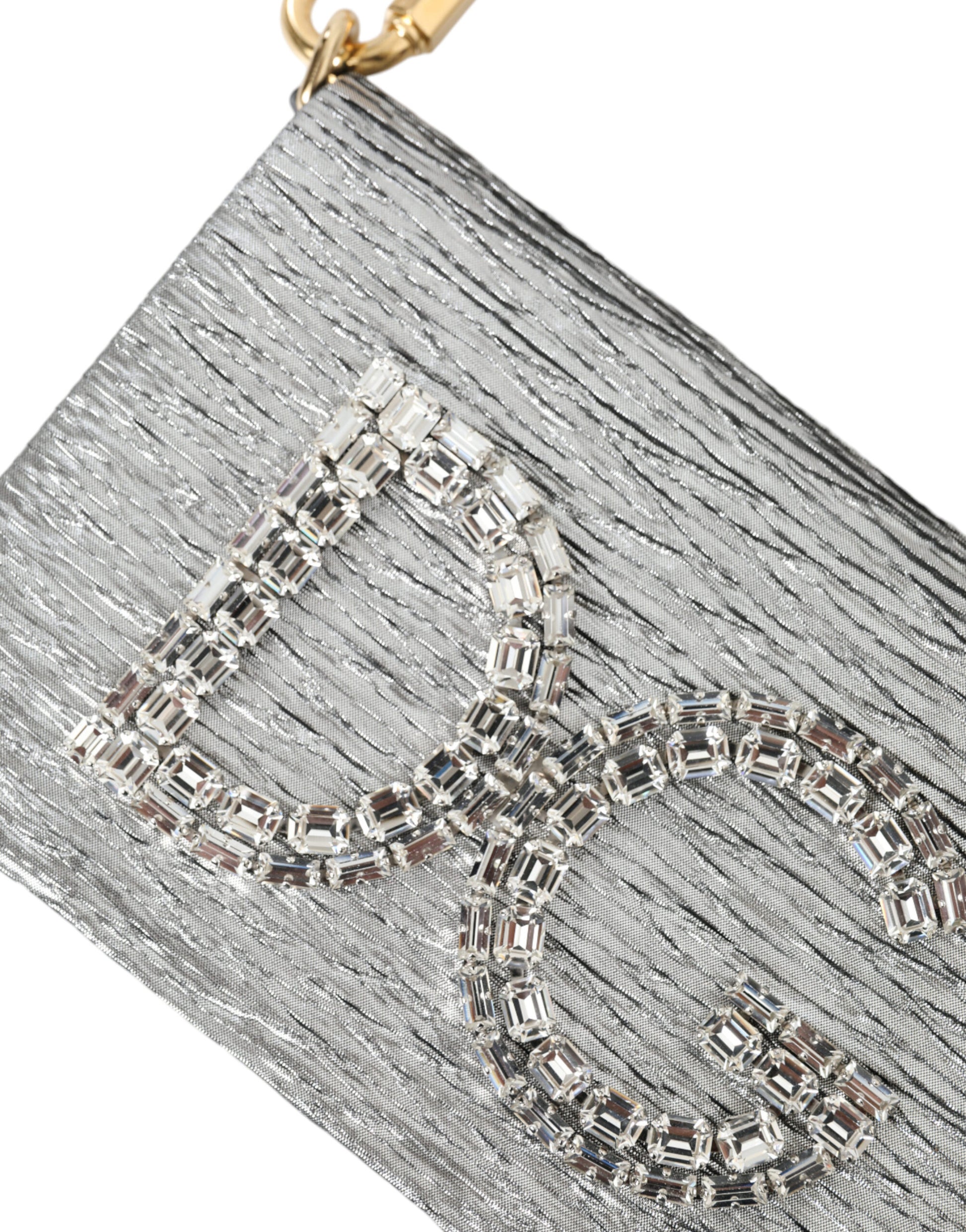 Discover timeless elegance with this Dolce & Gabbana DG GIRLS bag, a true symbol of luxury that fuses embedded Swarovski sparkle with meticulous Italian craftsmanship. Designed for versatility, it transitions effortlessly from a captivating clutch to a chic shoulder bag with its sleek chain strap. The silver fabric is complemented by opulent gold metal accents, and the leather-lined interior exhibits exclusive logo details. An embodiment of the brand’s passion for grandeur and precision.