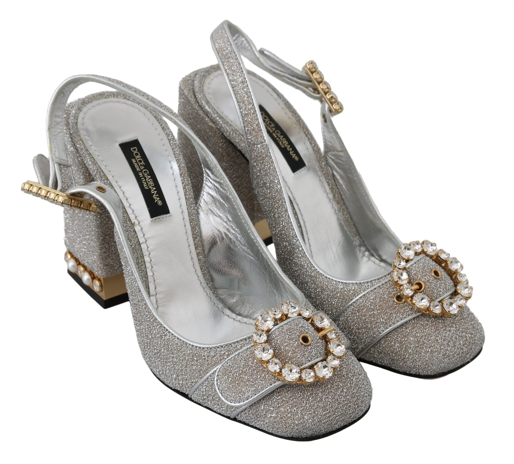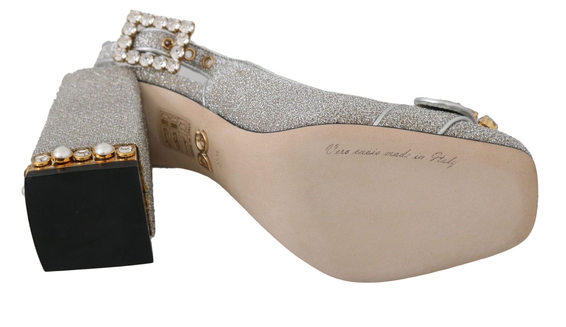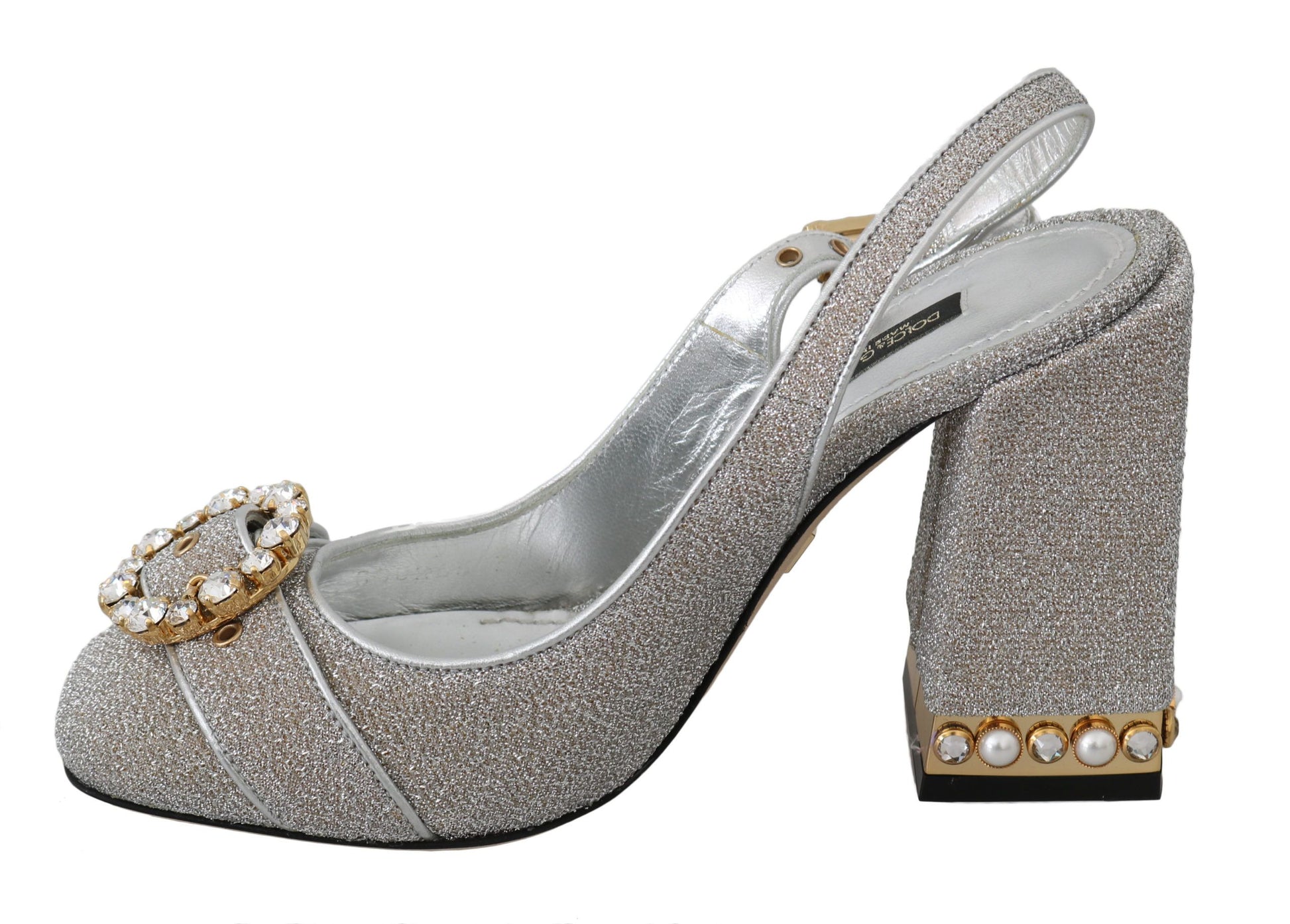 Step into luxury with these exquisite Dolce & Gabbana ankle strap sandals. Perfect for special occasions, these pumps boast a dazzling silver-gold hue complemented by clear crystals and pearls for a touch of opulence. Crafted with a synthetic exterior and a plush leather interior, these shoes promise both style and comfort. Complete with a leather sole and the iconic logo details, they’re a true Italian masterpiece.