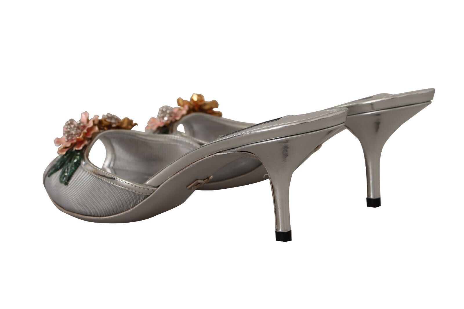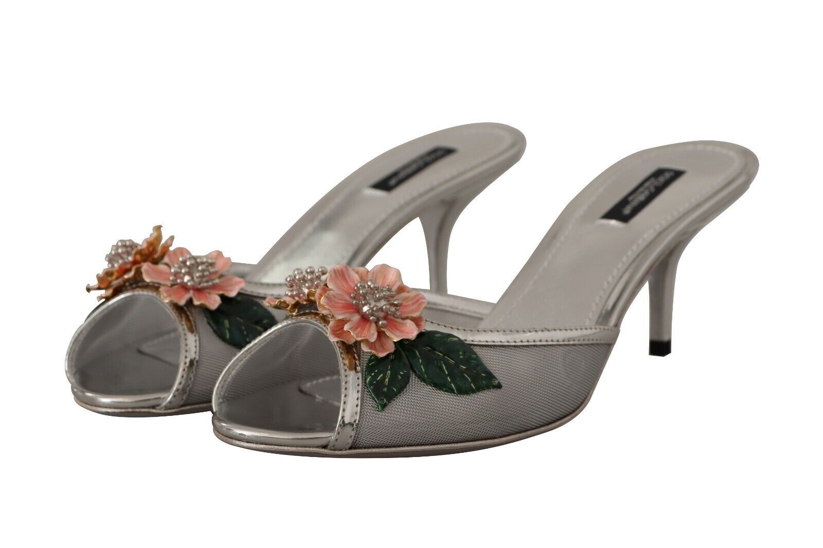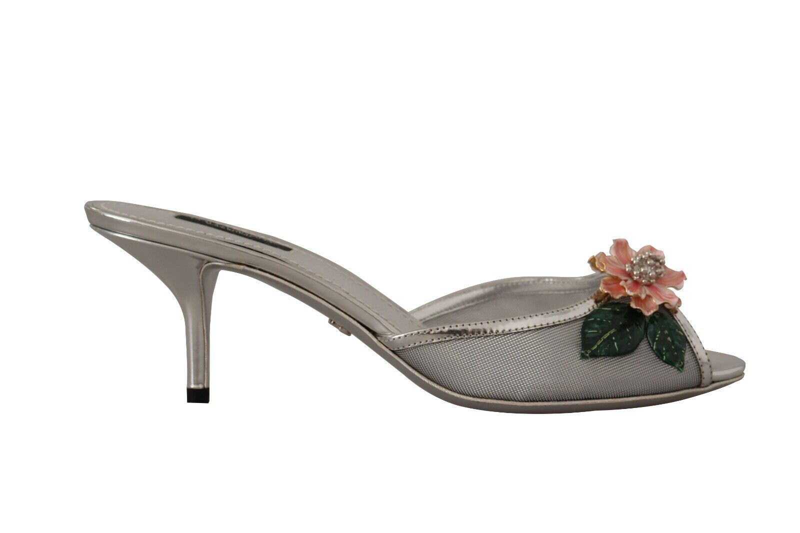 Indulge in the epitome of elegance with these stunning new Dolce & Gabbana slip-on heel sandals. Adorned with exquisite floral applique, these Keira sandals are crafted to elevate your style with their delightful kitten heels and classic open-toe design. With their radiant silver hue, these sandals are a perfect blend of luxury and comfort. Handmade in Italy, they reflect unparalleled quality and are an essential addition to your footwear collection.