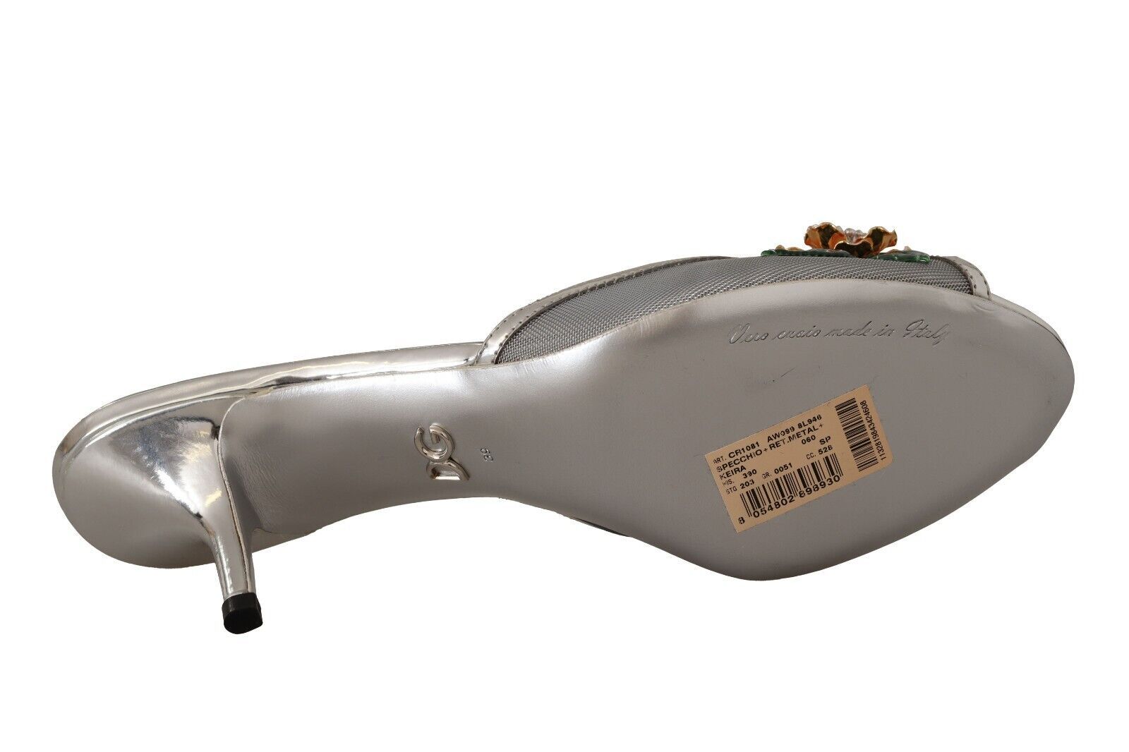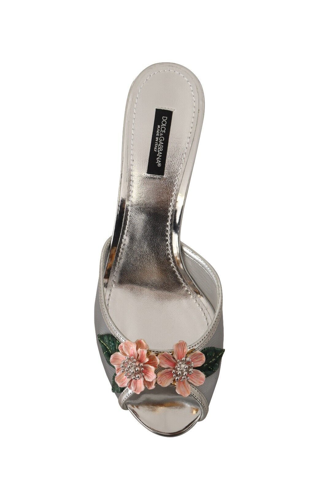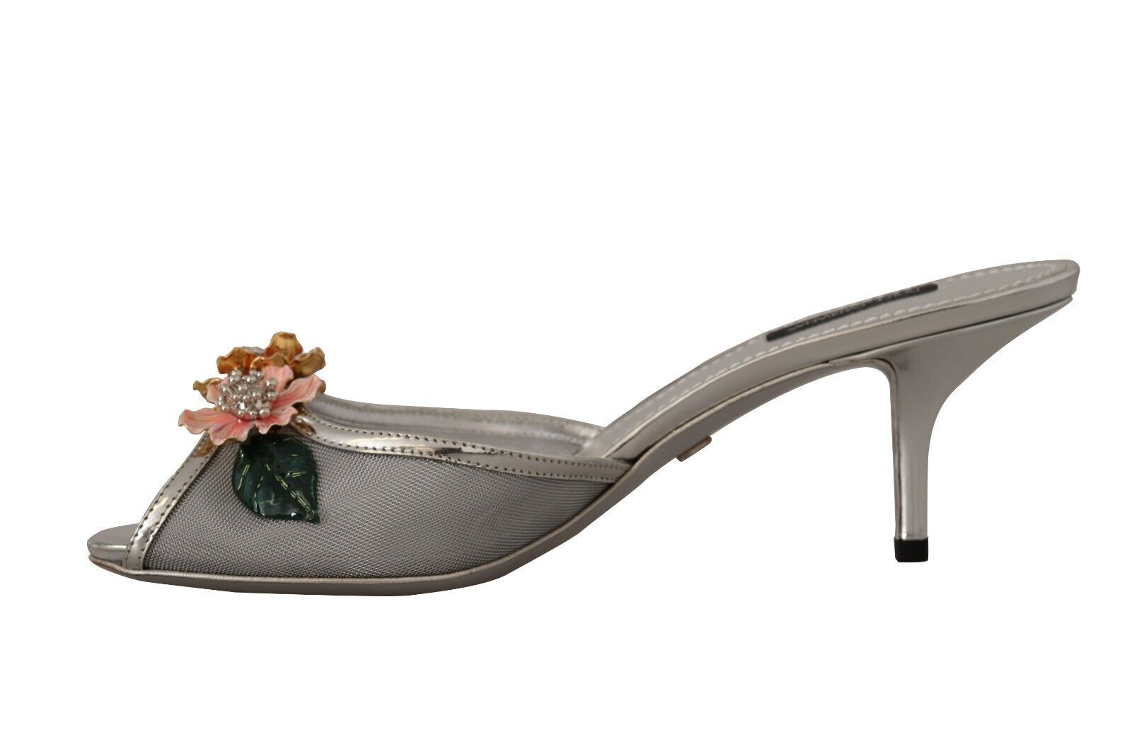 Indulge in the epitome of elegance with these stunning new Dolce & Gabbana slip-on heel sandals. Adorned with exquisite floral applique, these Keira sandals are crafted to elevate your style with their delightful kitten heels and classic open-toe design. With their radiant silver hue, these sandals are a perfect blend of luxury and comfort. Handmade in Italy, they reflect unparalleled quality and are an essential addition to your footwear collection.