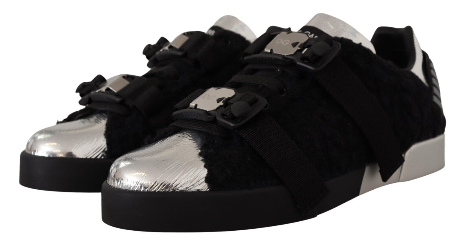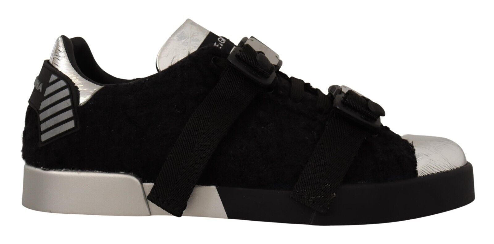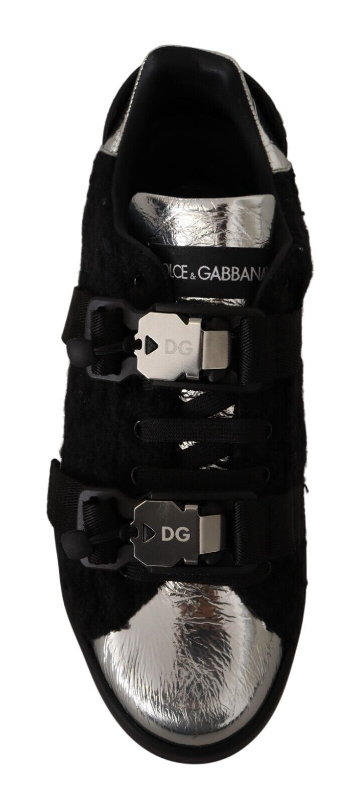Discover the epitome of Italian craftsmanship with these exquisite Dolce & Gabbana sneakers. Designed to elevate your casual look, these shoes feature a lavish blend of premium leather and sumptuous shearling, ensuring both style and comfort. The black and silver hues exude a sense of modern luxury, while the unique lace and buckle closure system adds a distinctive touch to these low-top sneakers. Whether stepping out for an event or taking a casual stroll, the robust rubber sole provides durability and grip, accompanying you in every stride. Proudly made in Italy, these sneakers bring a dash of elegance to your footwear collection.