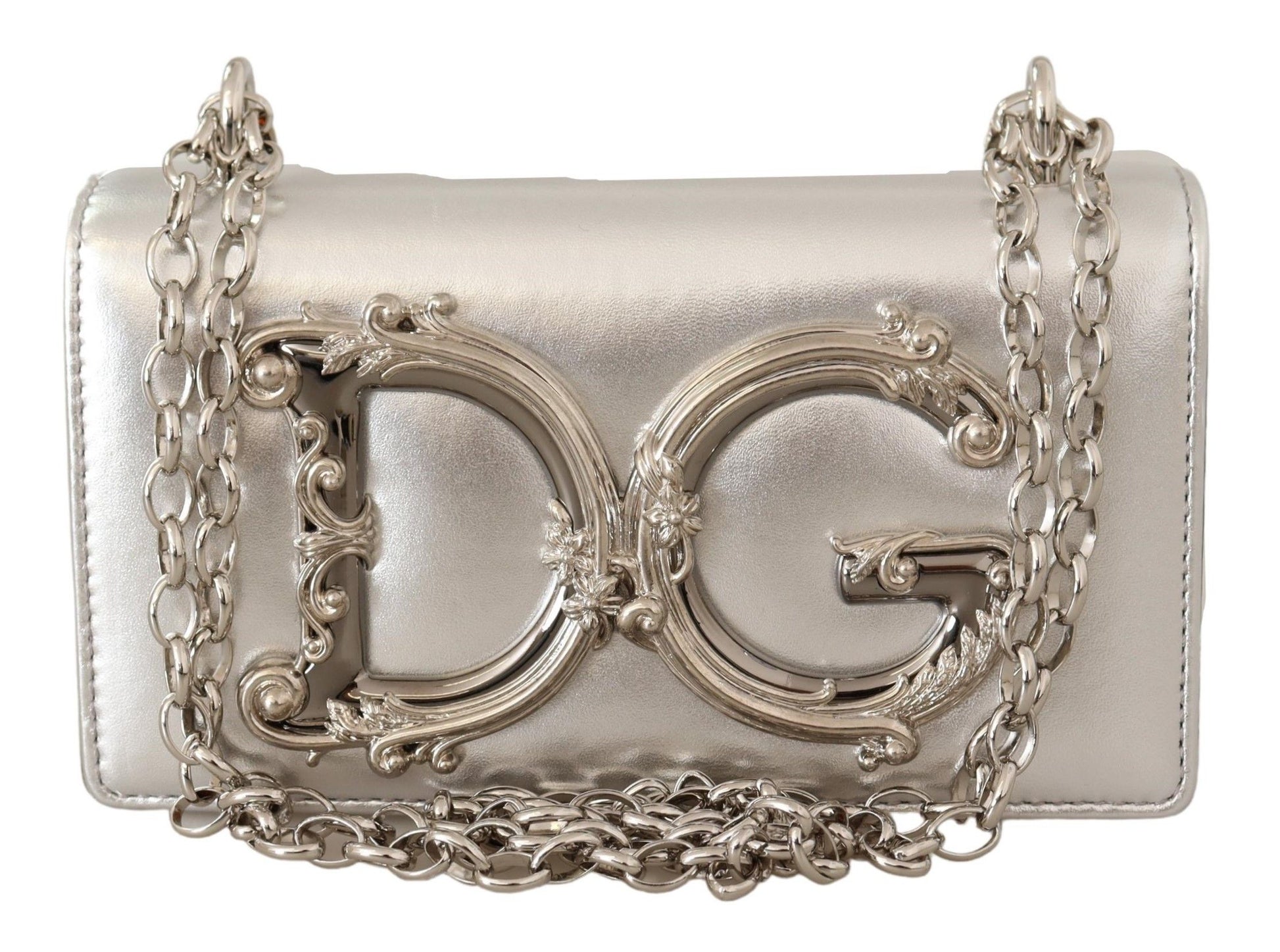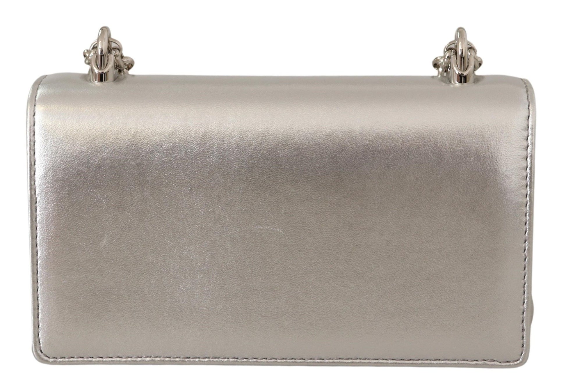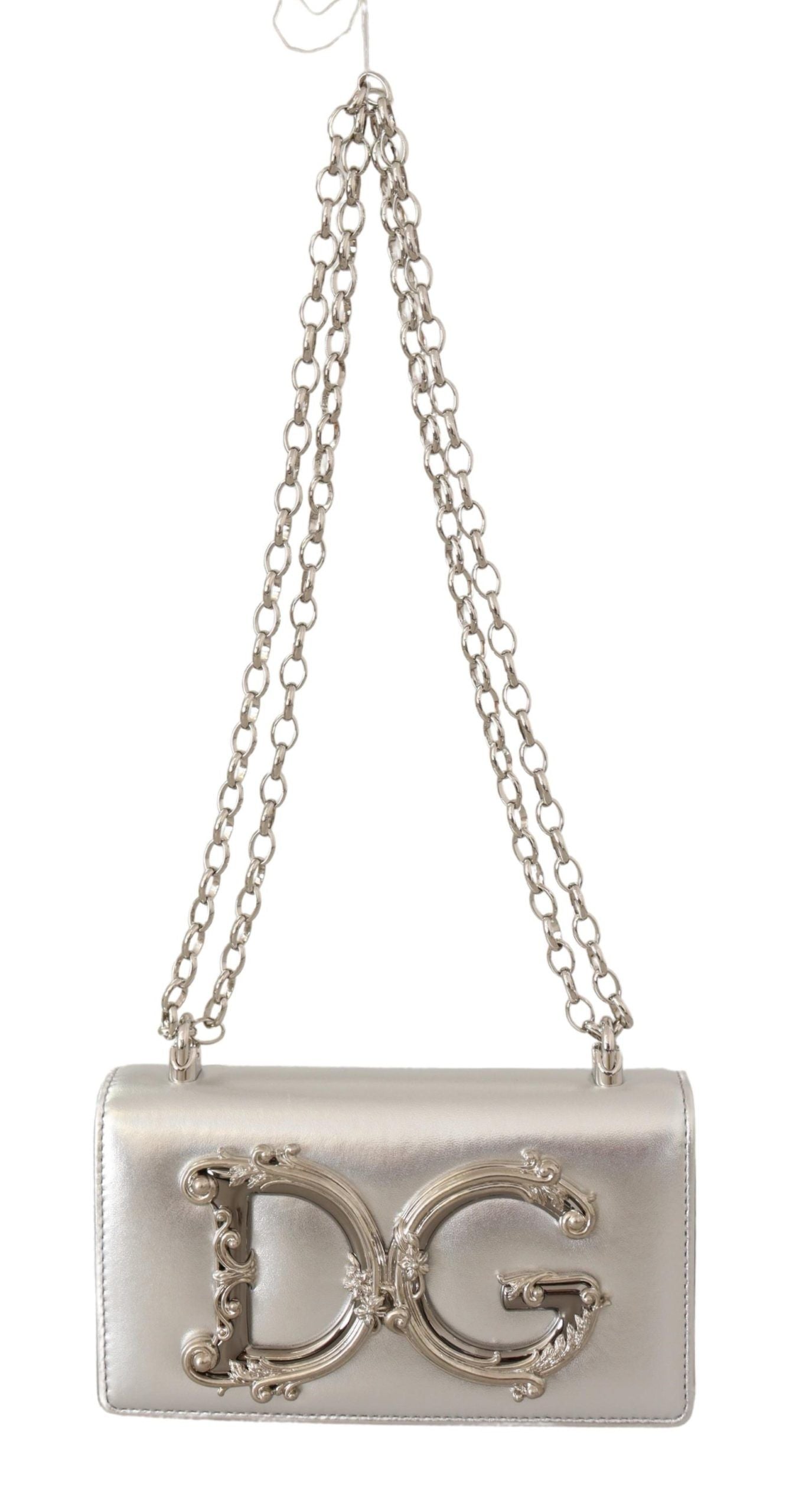 Exude sophistication with this stunning 100% Authentic Dolce & Gabbana shoulder bag. Perfect for the modern woman on-the-go, it balances elegance with practicality, doubling as a phone purse. The gorgeous silver leather exudes luxury, completed with a sleek magnet flap closure. Its versatile chain shoulder strap allows for over-the-shoulder or cross-body wear, while the black leather inner lining and logo-engraved metal hardware are testaments to its premium quality. Crafted with care in Italy, it’s not only a fashion statement but a functional accessory designed to hold your essentials in style.