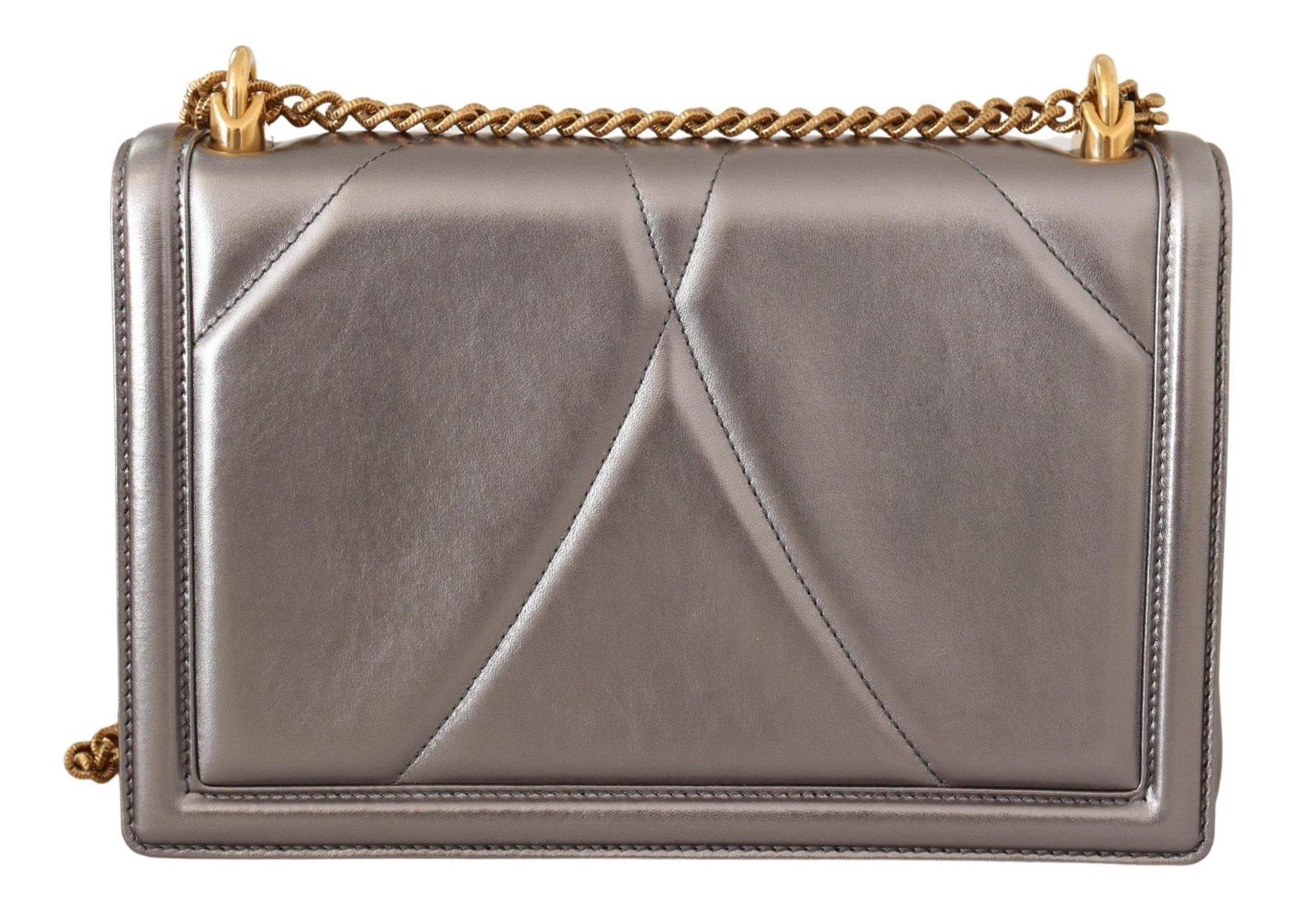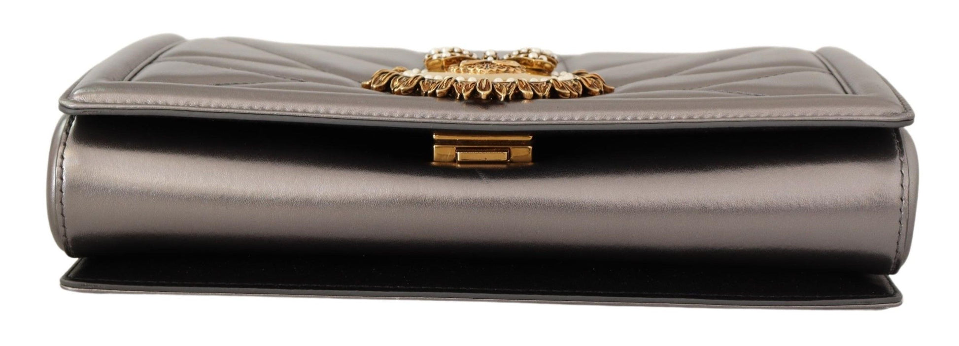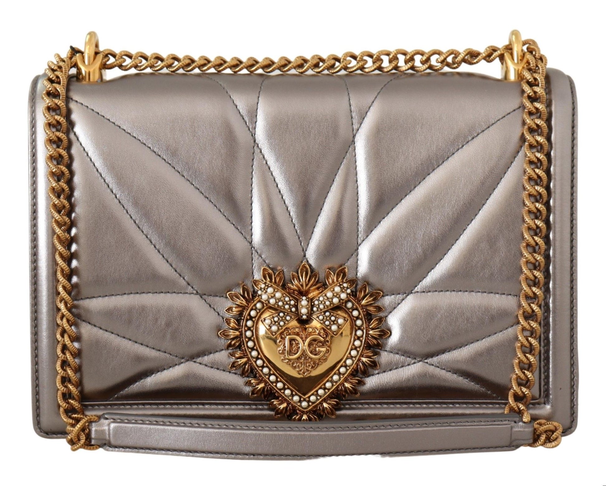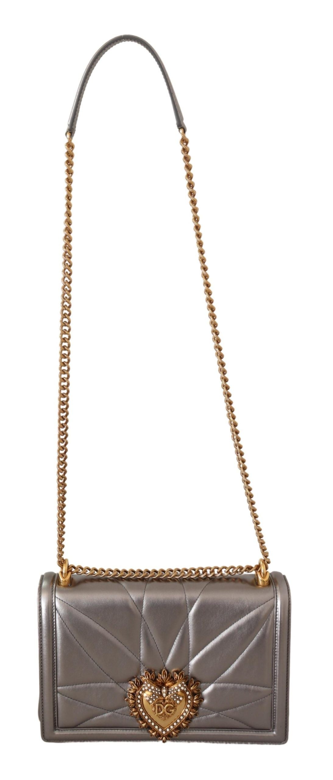 Indulge in the opulent elegance of this Dolce & Gabbana shoulder bag from the exclusive DEVOTION collection. Meticulously crafted from the finest leather in a striking silver hue, this purse epitomizes luxury with its gold metal detailing and iconic front flap adorned with a bejeweled branded heart, hand-tooled from a metal alloy with a delicate pearl inlay. Chic and versatile, it features a chain shoulder strap with a nappa leather insert, allowing you to wear it elegantly over the shoulder or across the body.