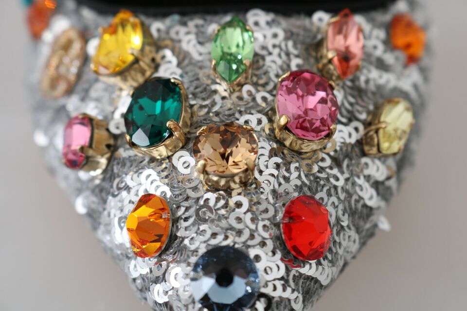 Step into a world of elegance with our Gorgeous, brand new Dolce & Gabbana Mary Janes Bellucci Alta Moda pumps. These shoes boast a luxurious blend of silver and black, adorned with multicolor crystals for that extra sparkle. Handcrafted in Italy, these pumps promise unparalleled quality and comfort.